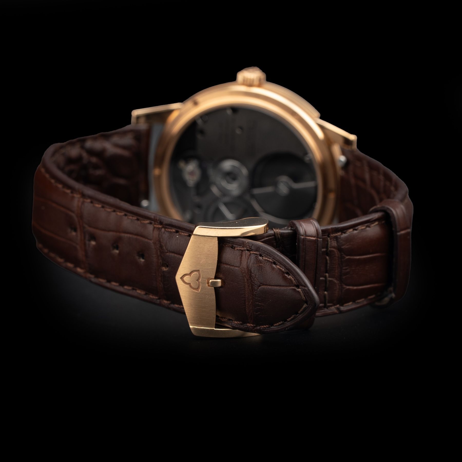 This watch features a 40mm 18k pink gold case on leather strap. This watch also sports a brown dial. Powered by a mechanical automatic movement. Water resistance up to 50 meters.