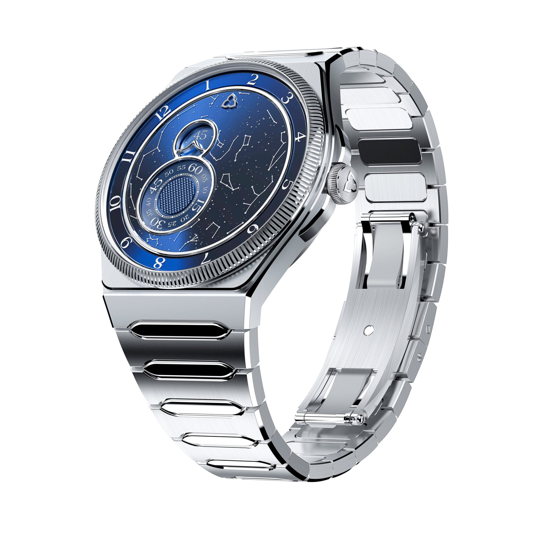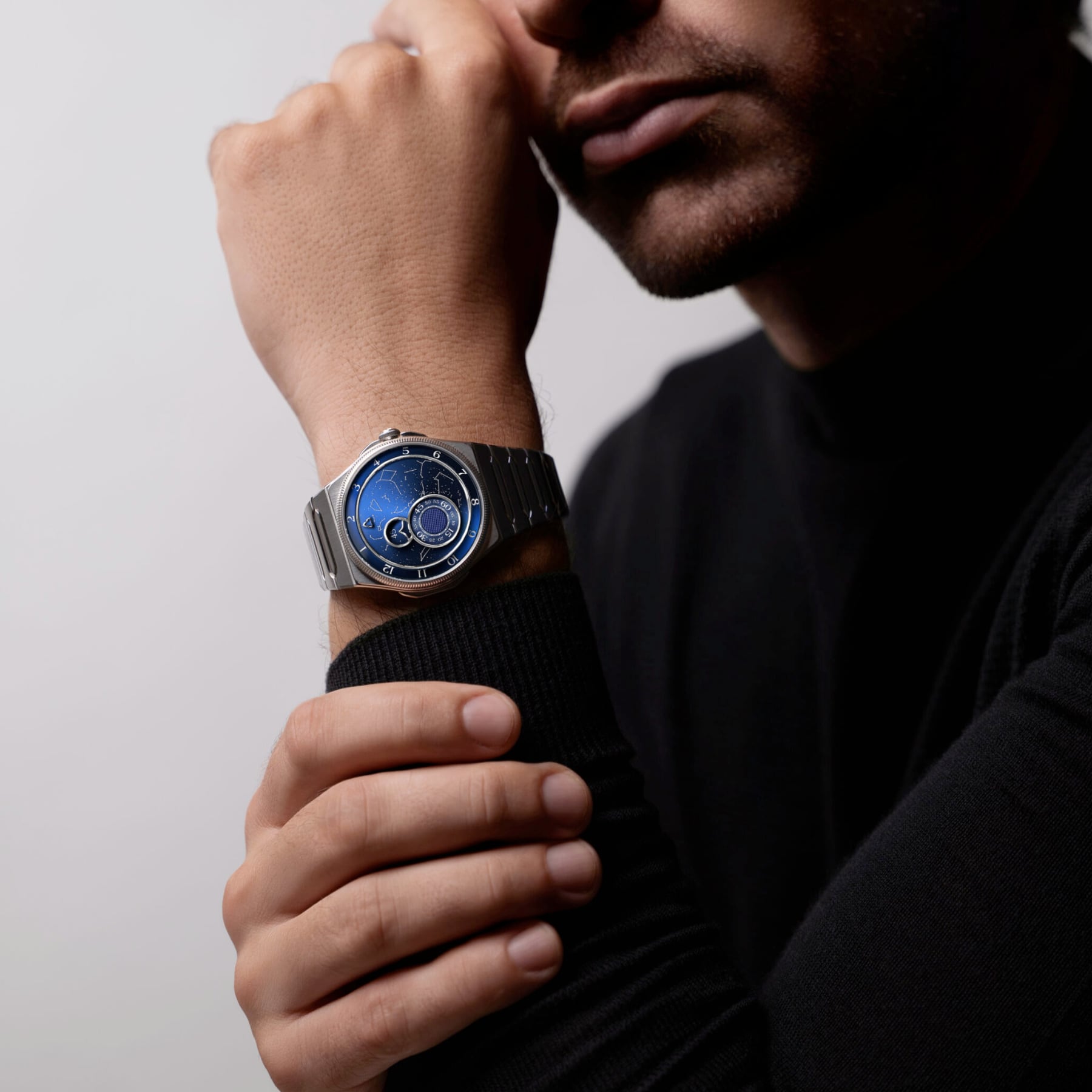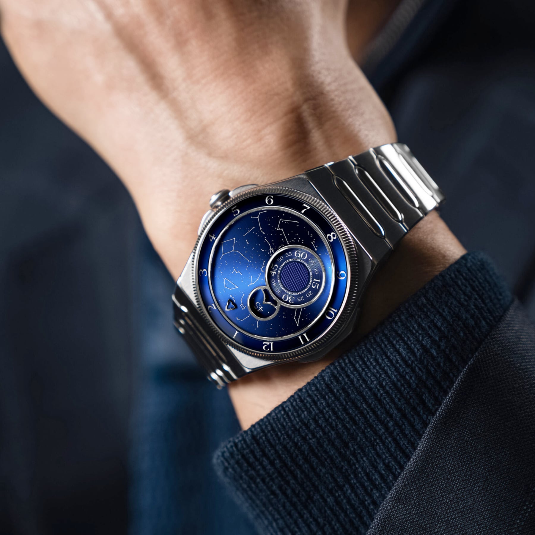 39.5 mm case. 316L steel double-folding clasp. Manufacture movement. Provide a location, date, and time, and we map the position of the stars for that exact moment. Delivery time for each unique piece: 6 months from order receipt.