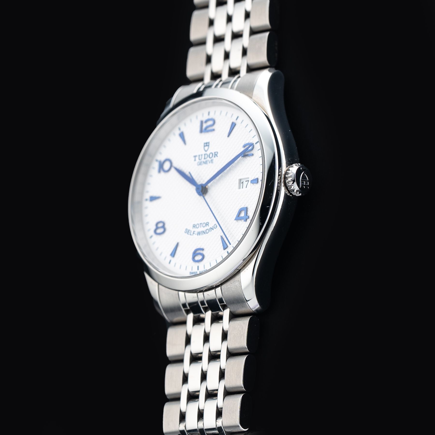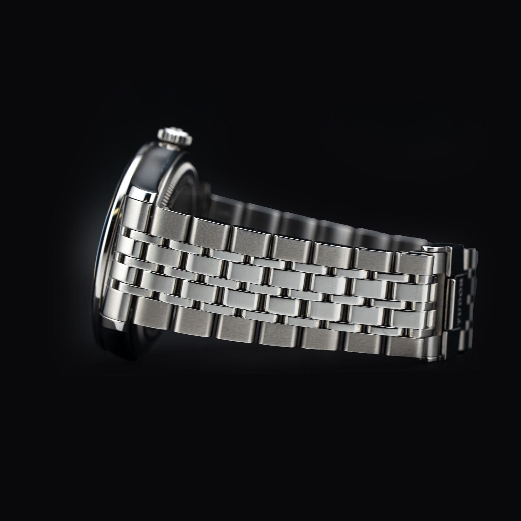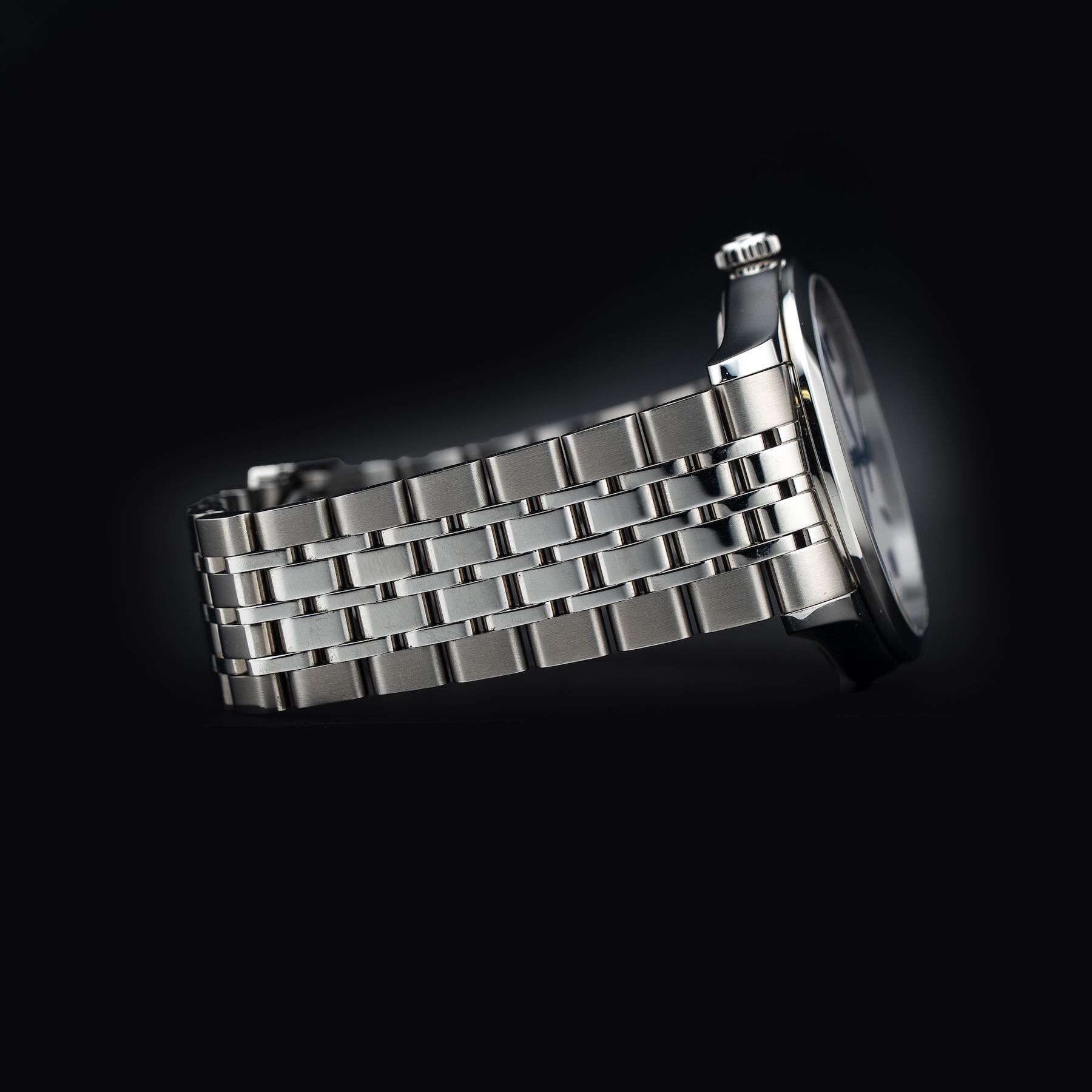 This watch features a 39mm steel case on steel bracelet. This watch also sports a opaline dial. Powered by a self-winding movement. Water resistance up to 100 meters.
