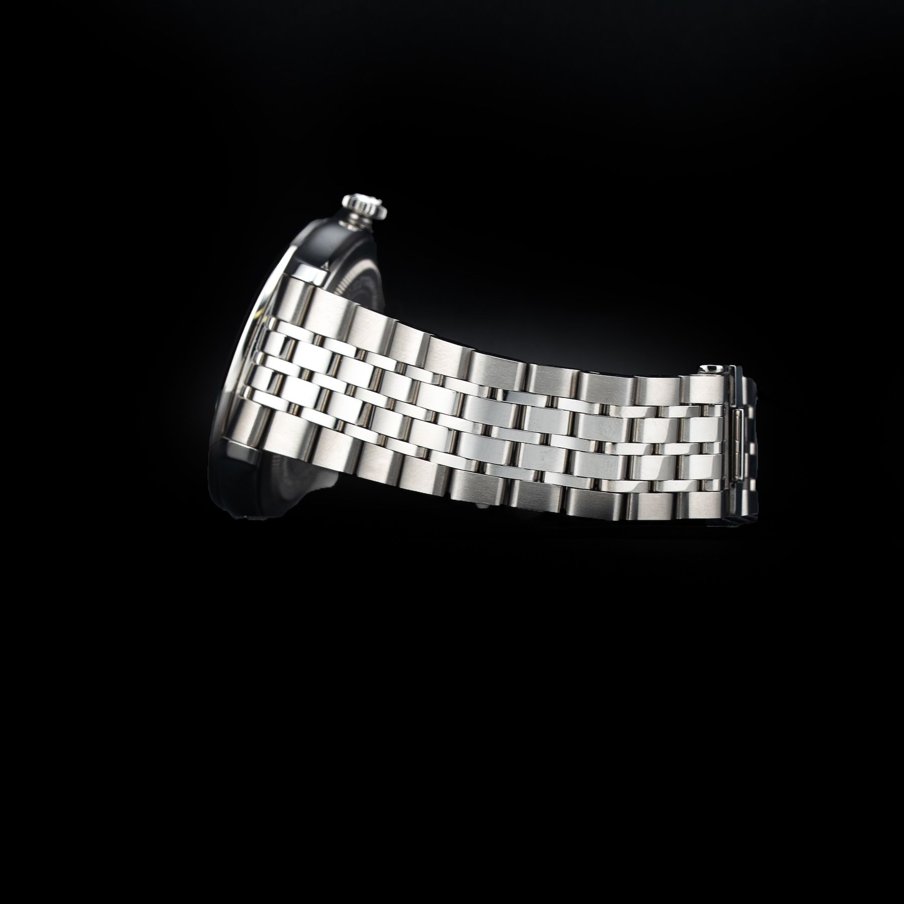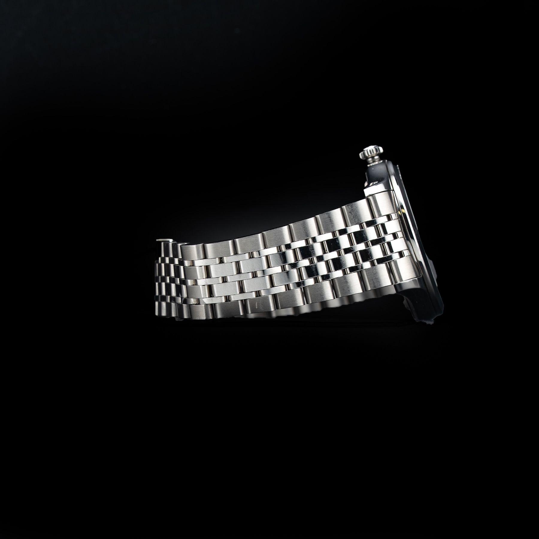 This watch features a 41mm steel case on steel bracelet. This watch also sports a opaline dial. Powered by a self-winding mechanical movement. Water resistance up to 100 meters.