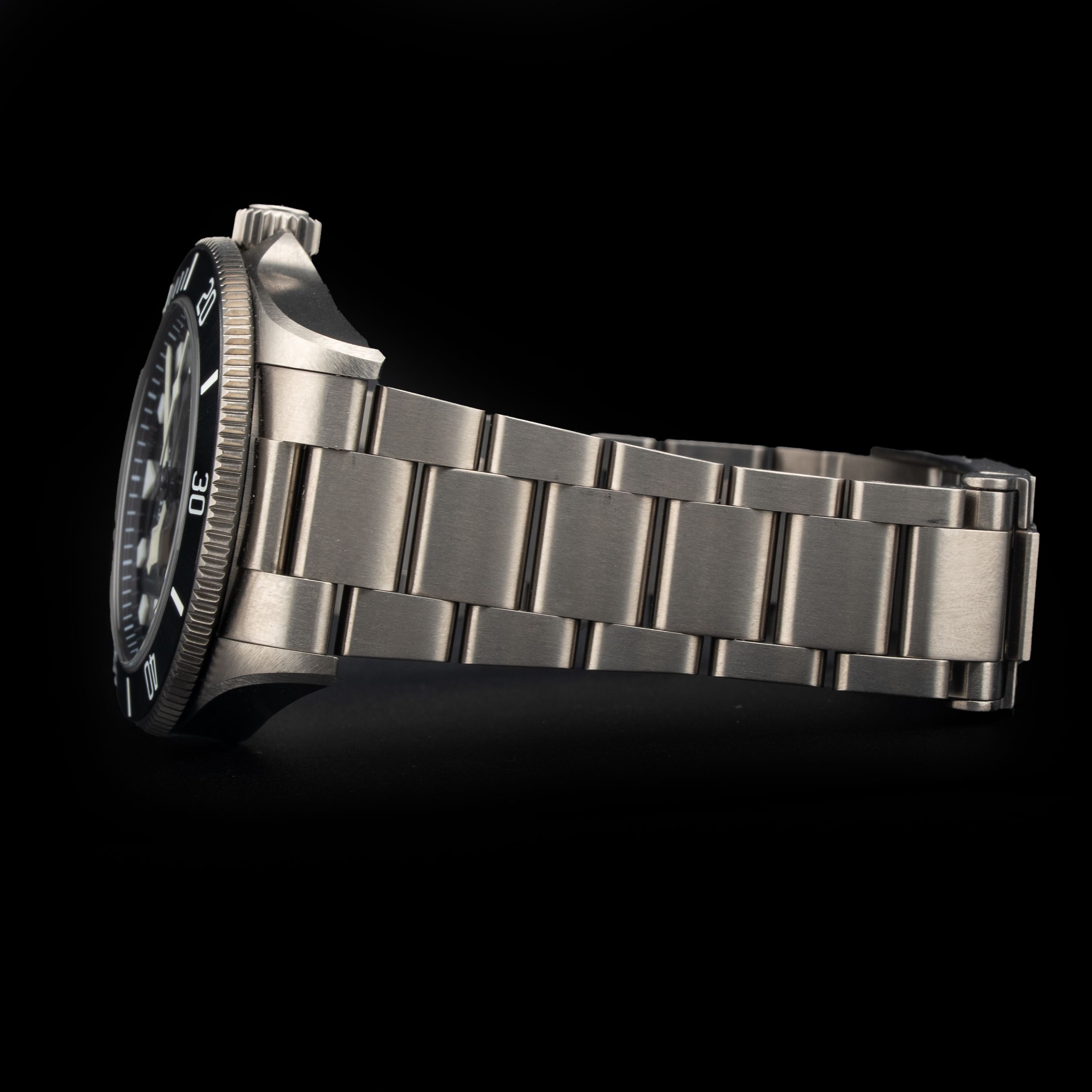 - This timepiece features a 39mm titanium case paired with a high quality titanium bracelet. It showcases a distinctive black dial and is powered by a precise automatic winding movement. The watch is designed with a water resistance of up to 200m.
