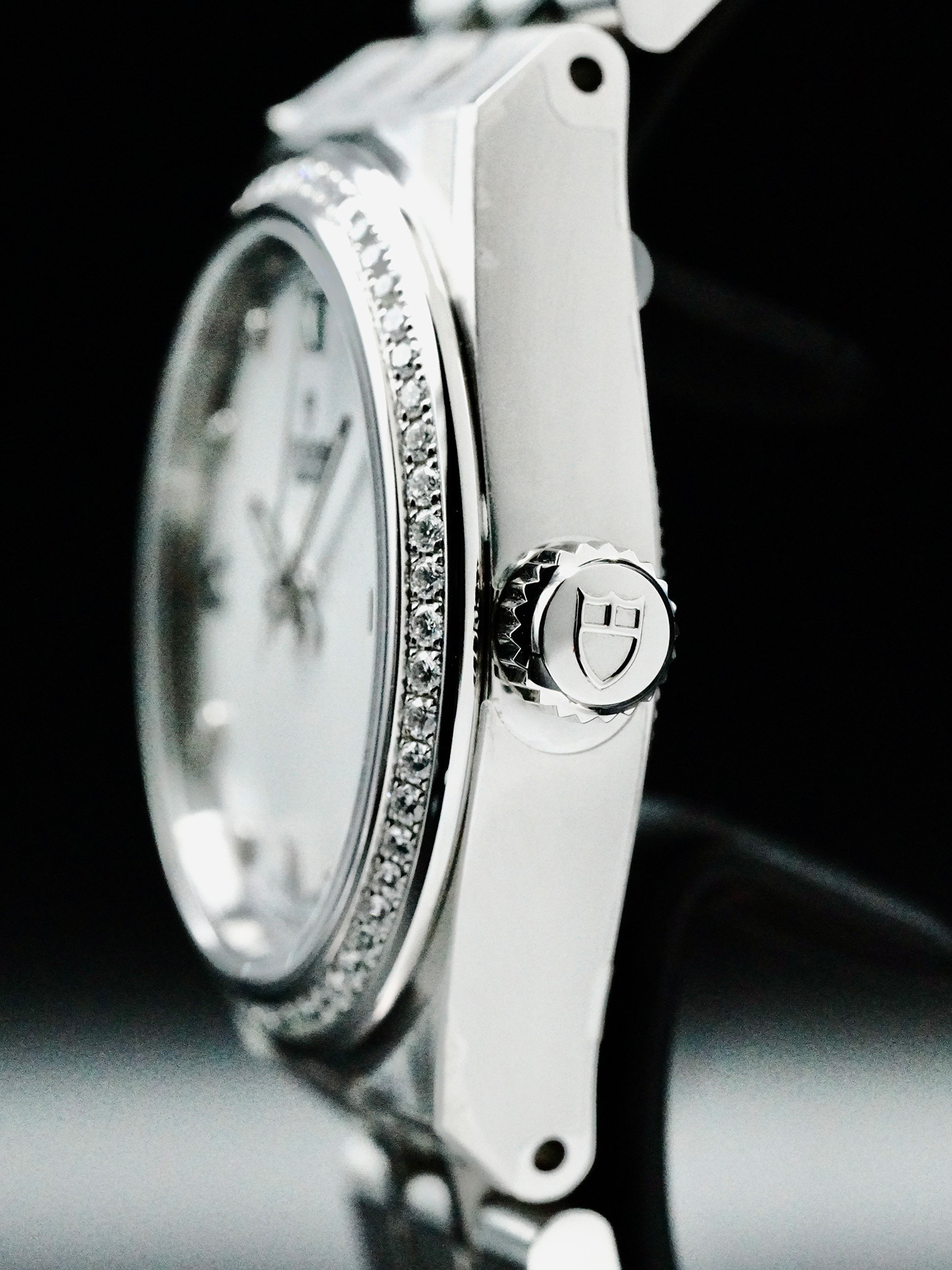 This Tudor Royal features a 28mm stainless steel case with a diamond-set bezel on a stainless steel bracelet. This watch also showcases a white mother-of-pearl dial with luminous hands and Roman numeral/diamond dial markers covered by sapphire crystal.