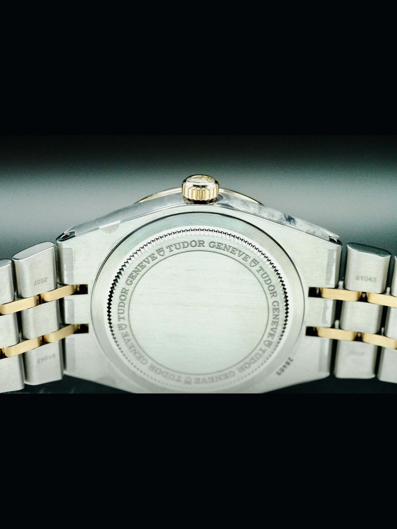 This Tudor Royal features a 34mm stainless steel case with a yellow gold bezel on a stainless steel & yellow gold bracelet. This watch also sports a champagne-colour dial with luminous yellow gold hands and Roman numeral dial markers covered by sapphire crystal.