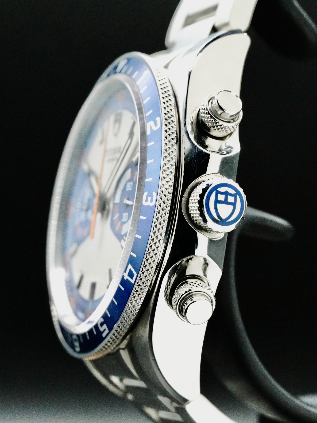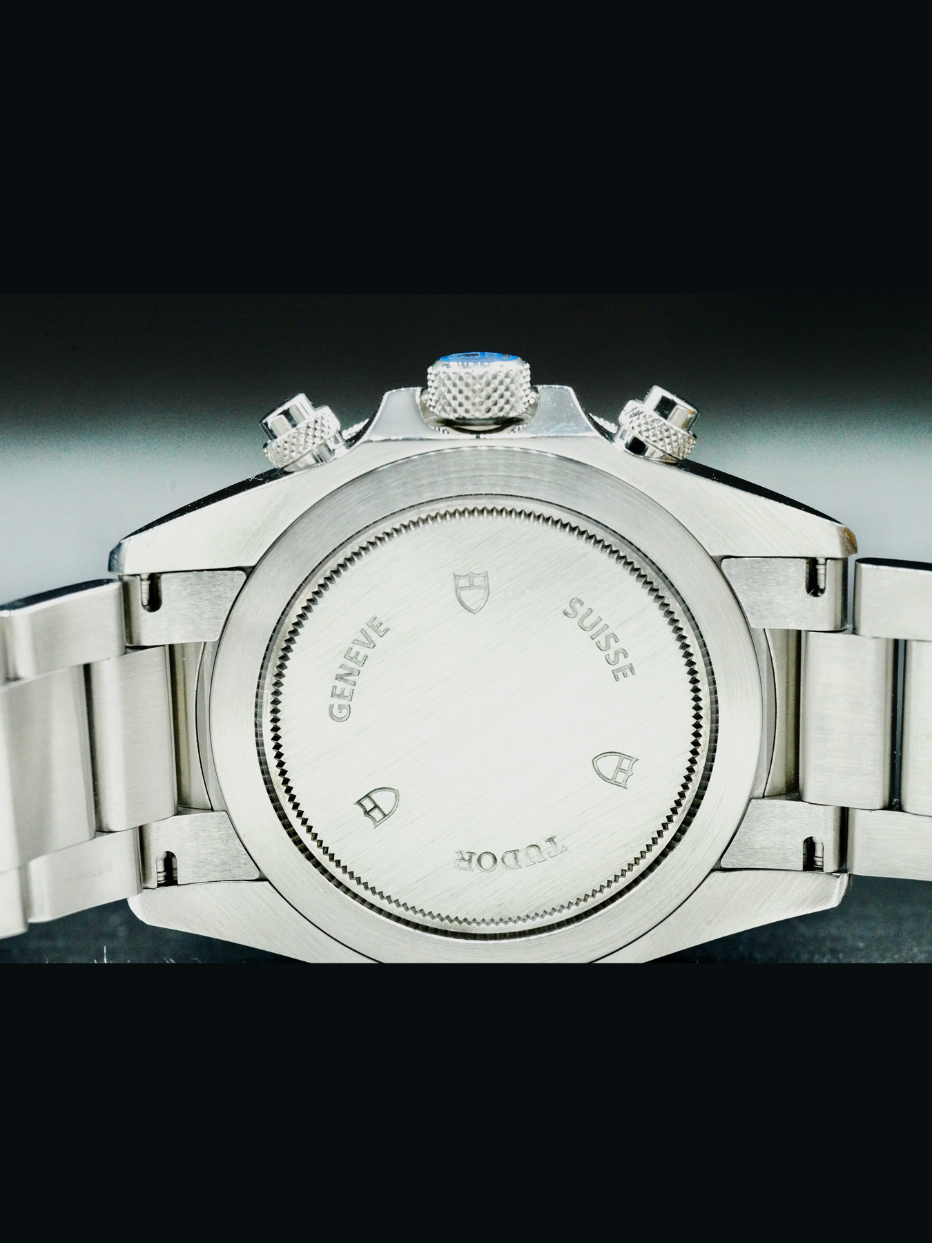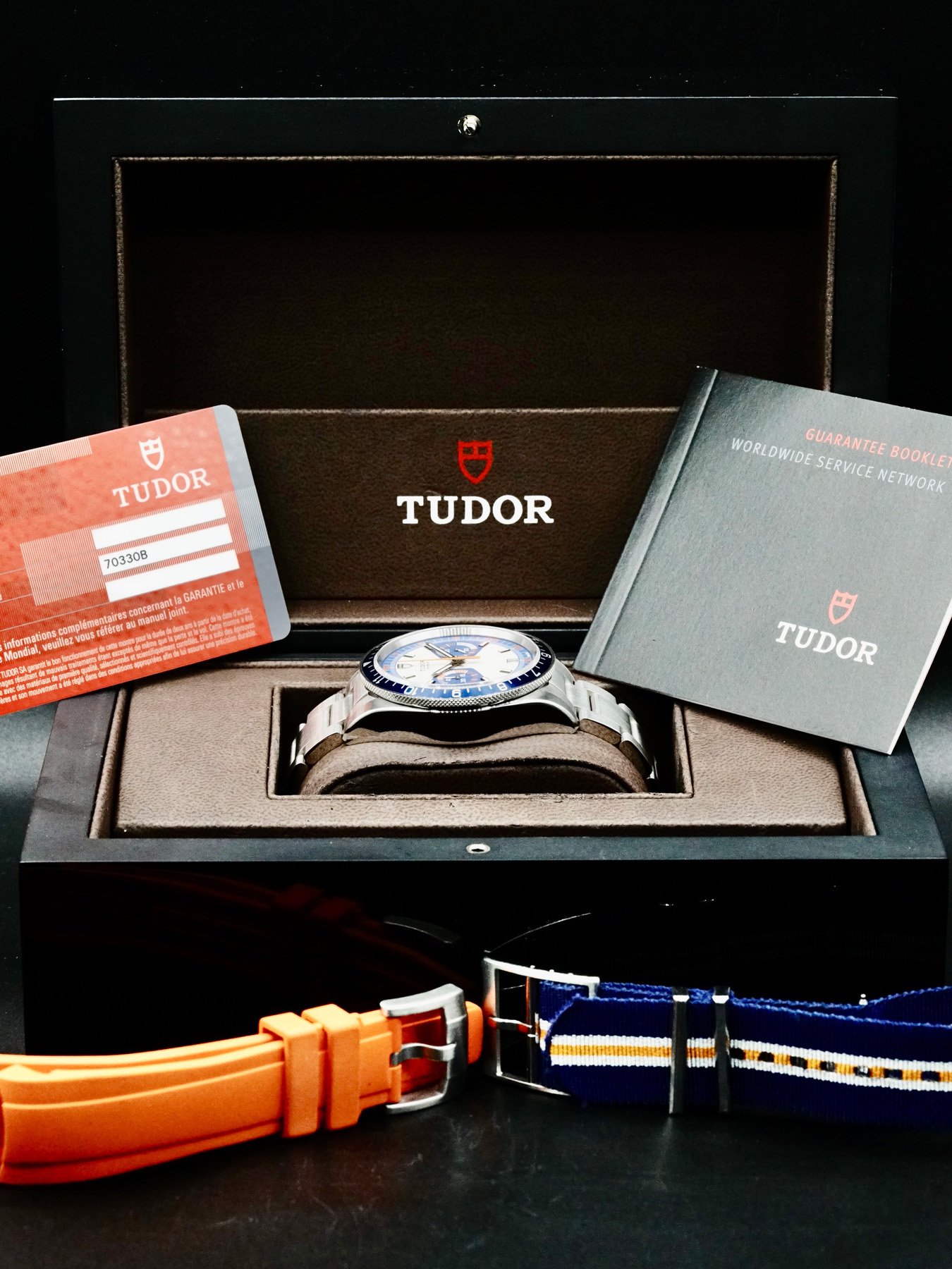 This Tudor 70330B Heritage Chrono Blue is in GREAT condition. This watch includes its original box, service booklet, and warranty dated for 2016. Extra blue NATO strap and orange rubber strap.