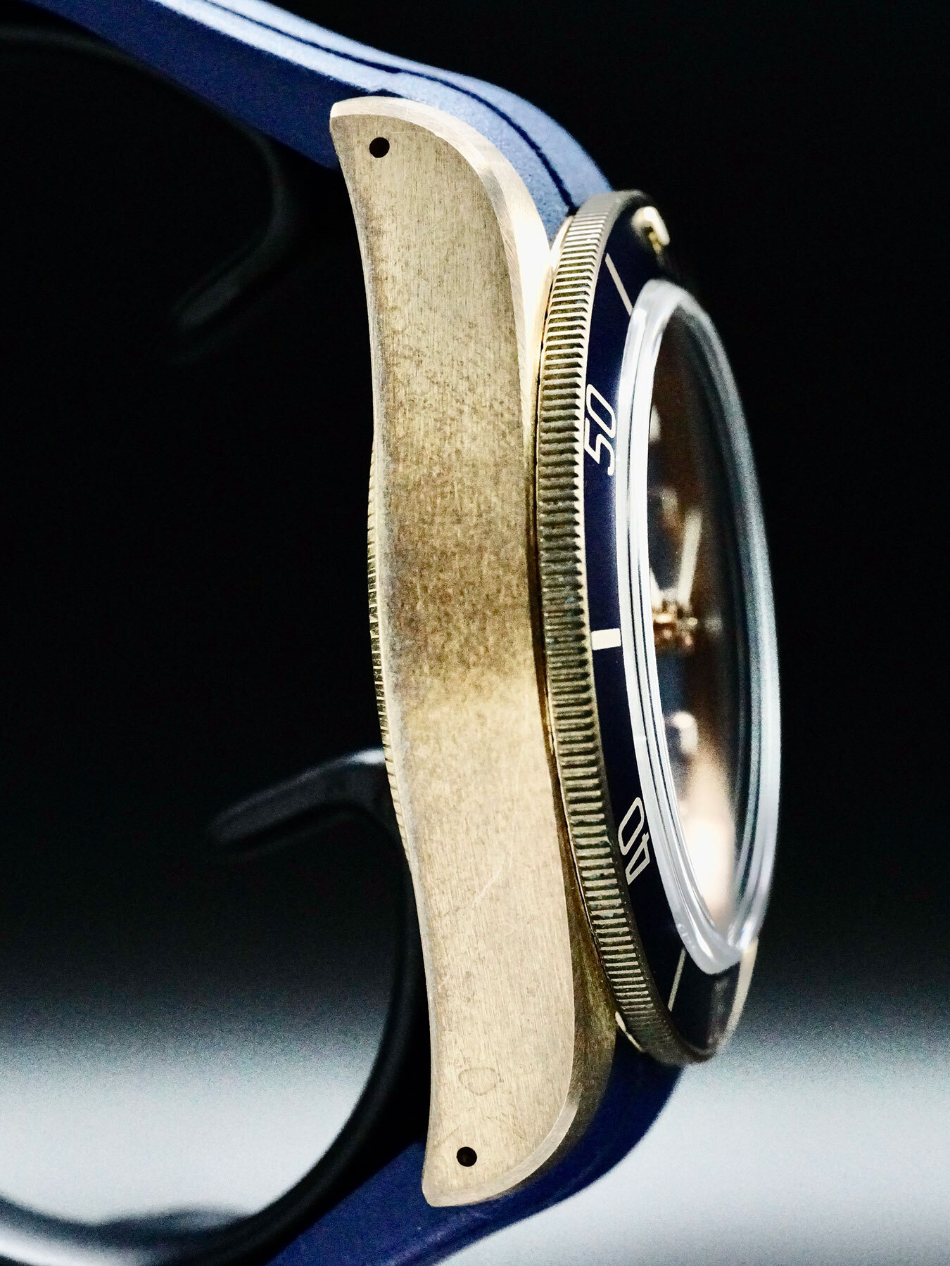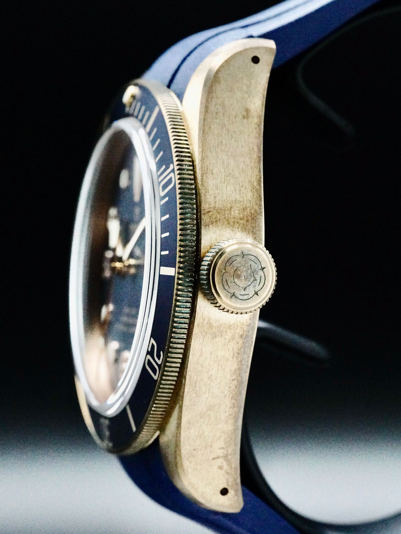 This watch features a 43 mm bronze case on leather strap. This watch also sports a blue dial. Powered by an automatic movement. Water resistance up to 200 meters.