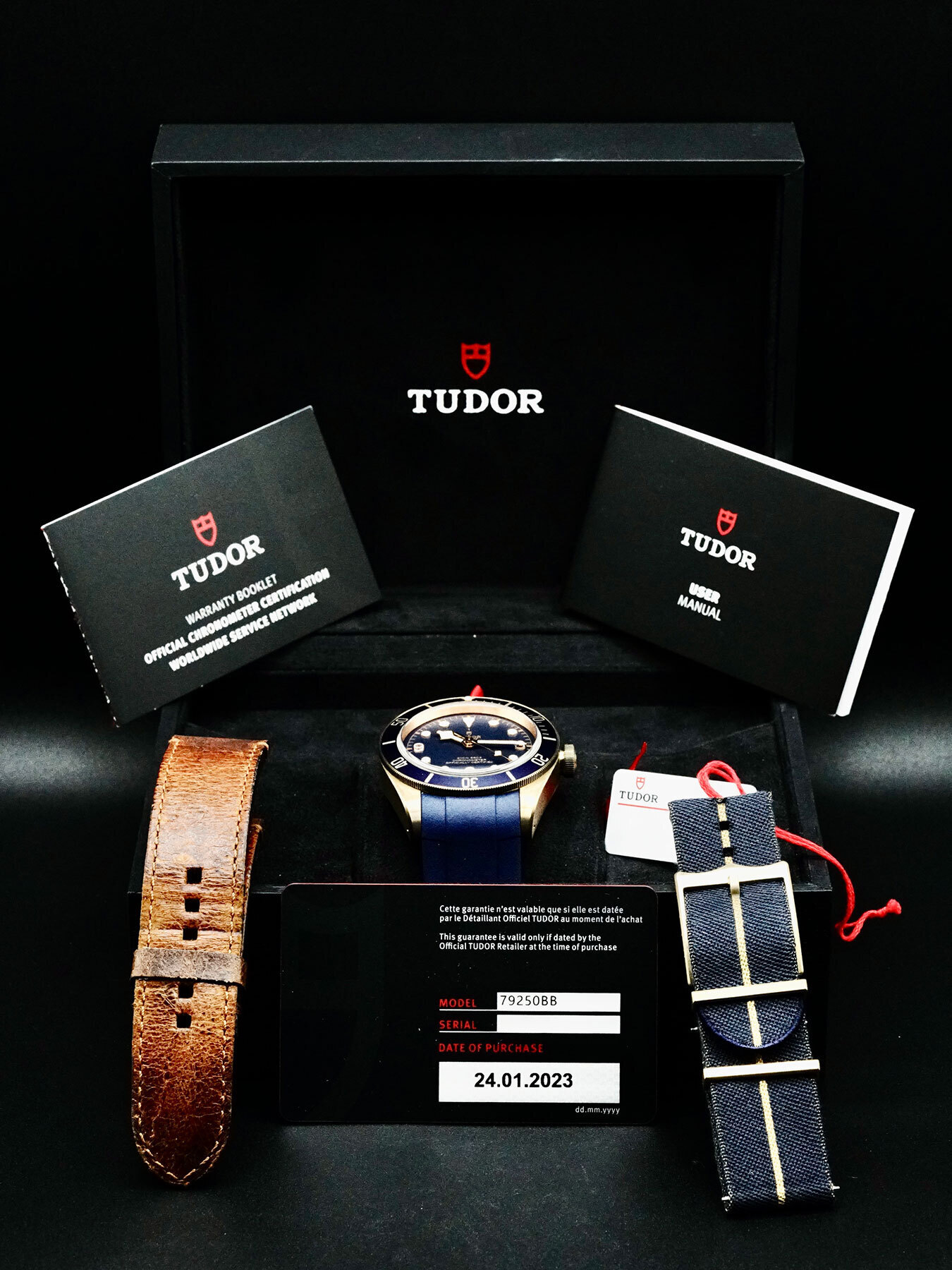 This Tudor 7925BB Black Bay Bronze Special Edition for Bucherer is in GREAT condition. This watch includes its Original Box, Original Papers, Warranty card dated 2023 and 2 extra straps. This watch has been fully authenticated and certified by Exquisite Timepieces.