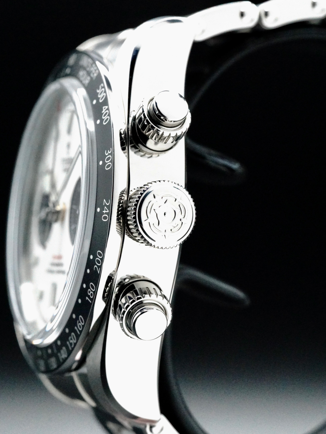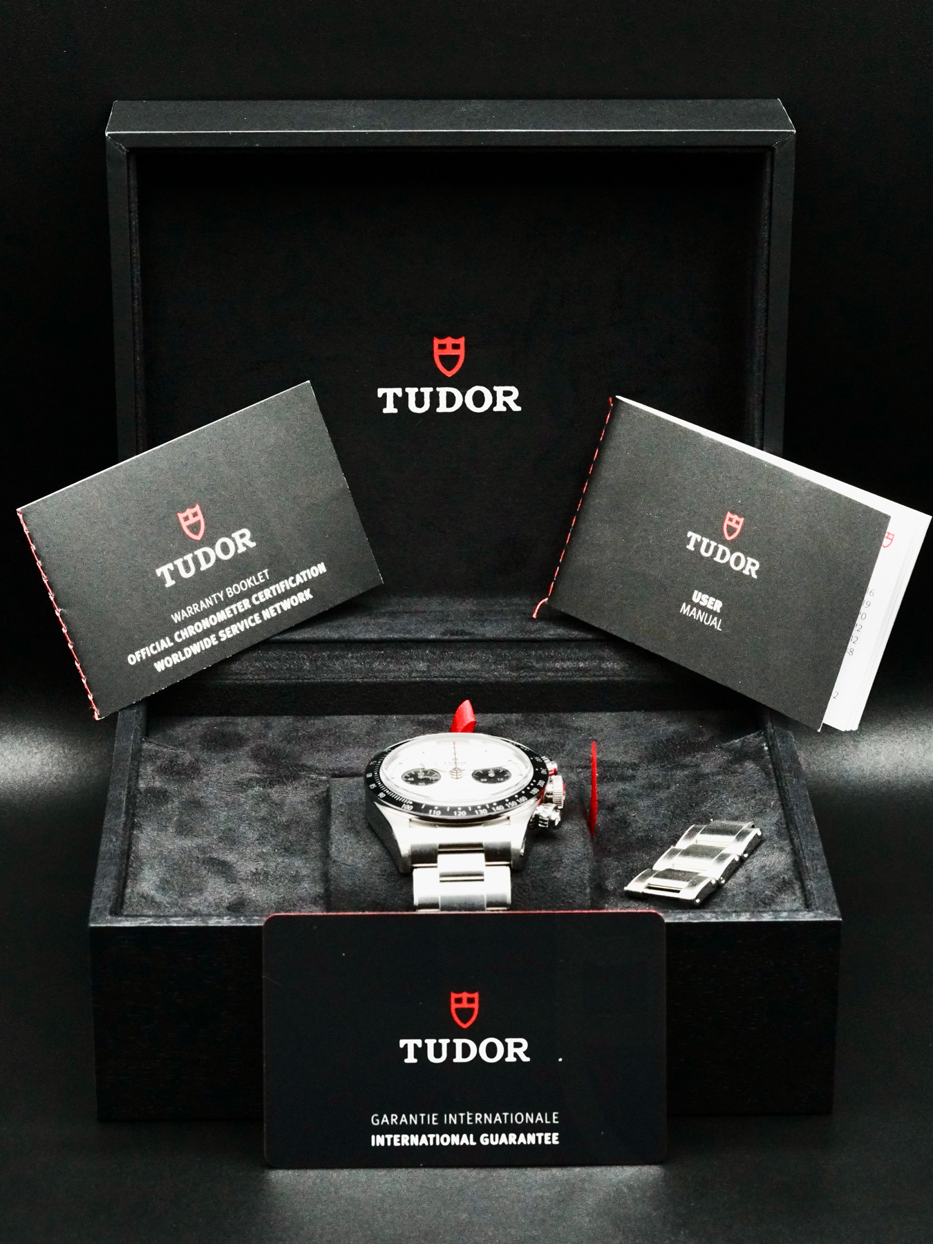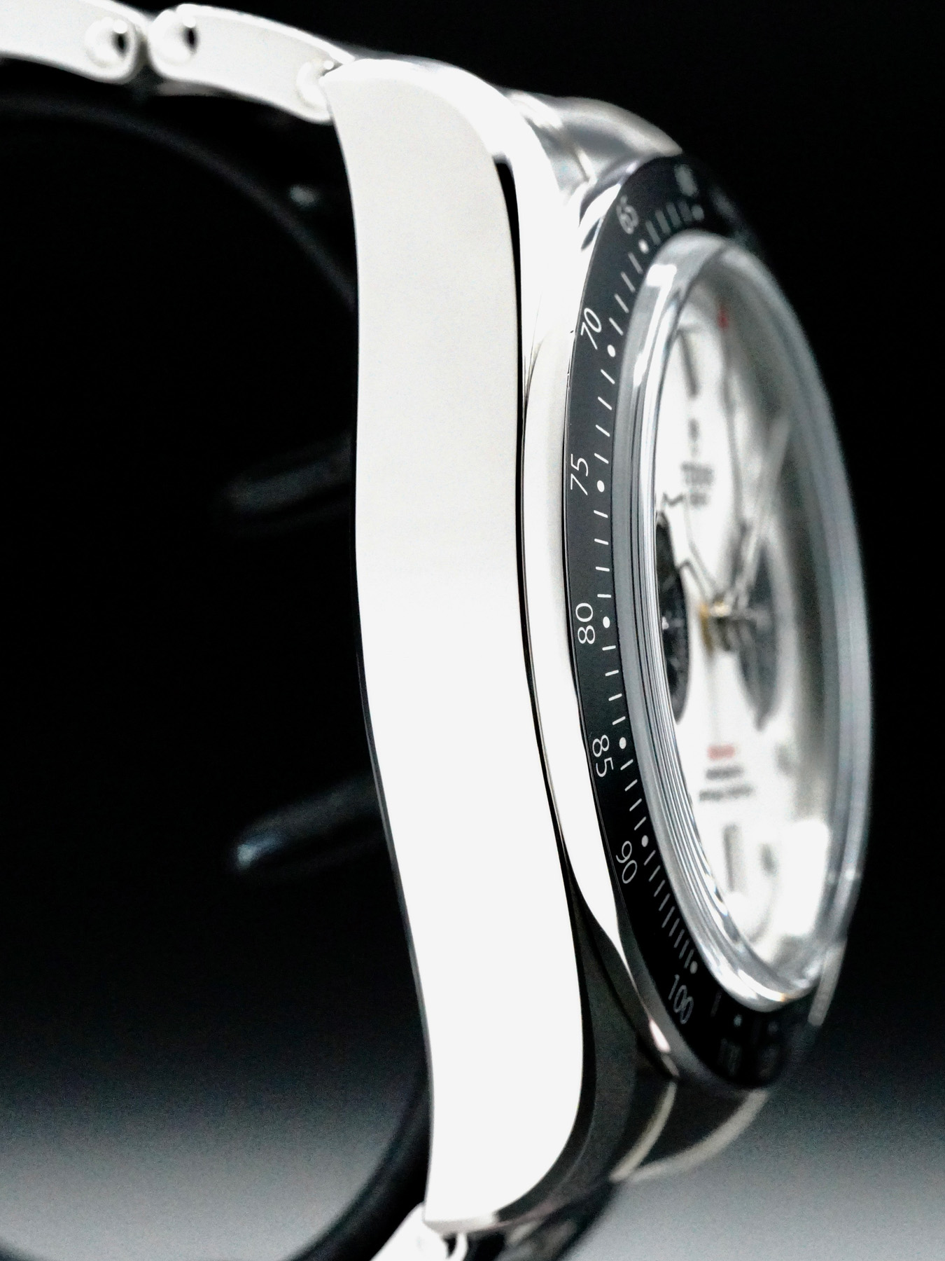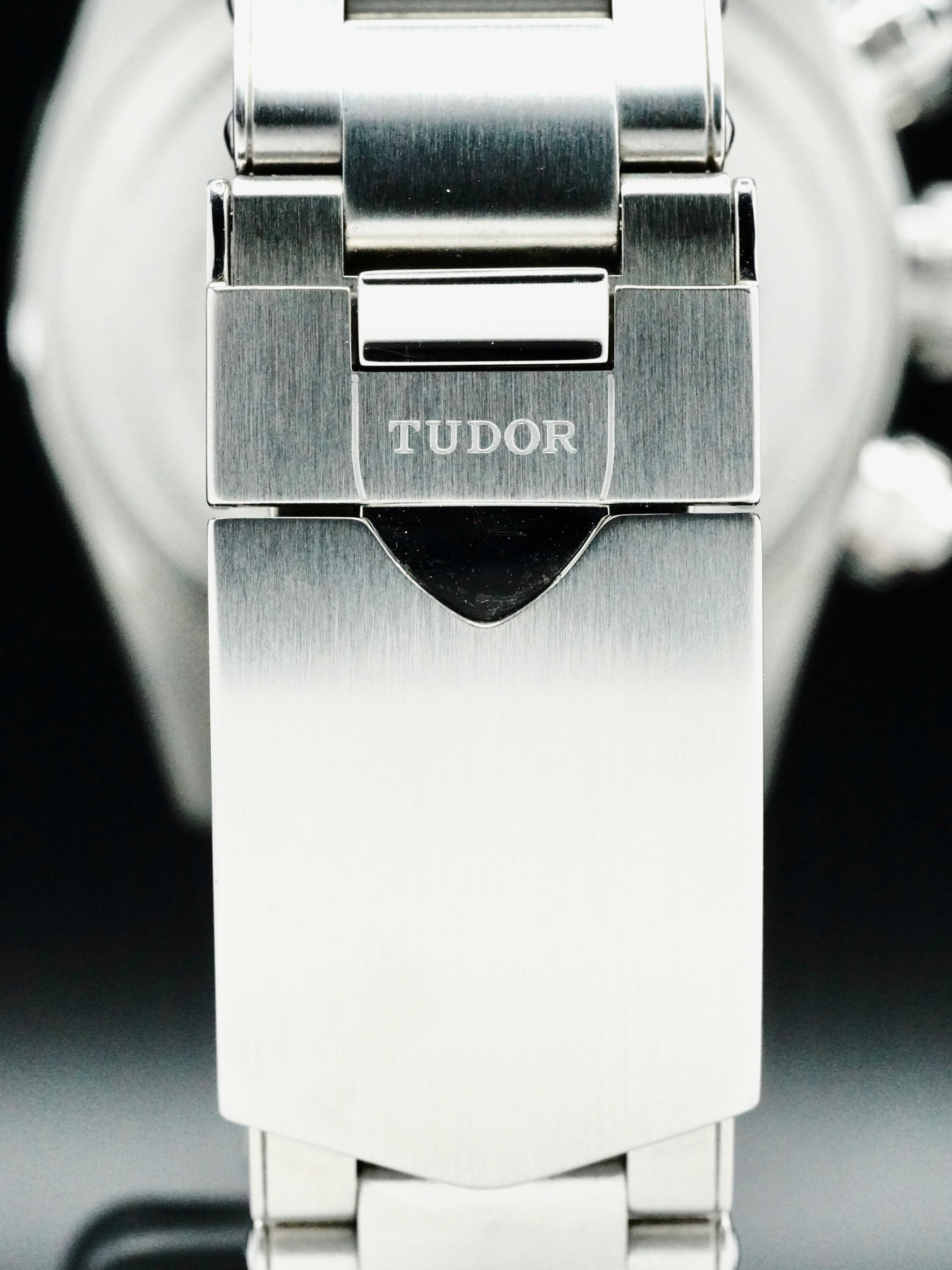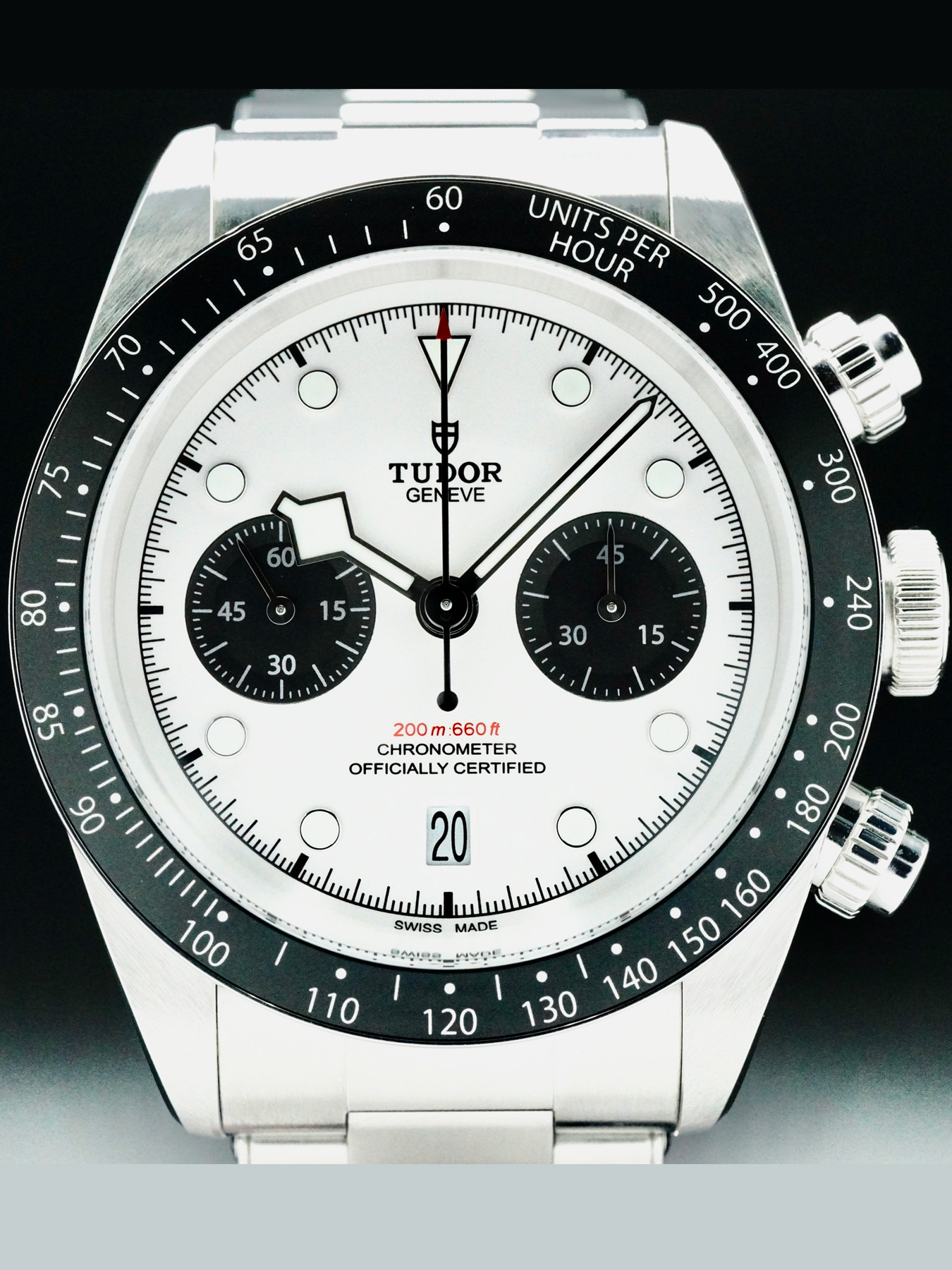 This Tudor Black Bay Chrono features a 41mm stainless steel case with a solid case back on a stainless steel bracelet. This watch also sports a white dial with luminous hands and index dial markers covered by scratch resistant sapphire crystal.
