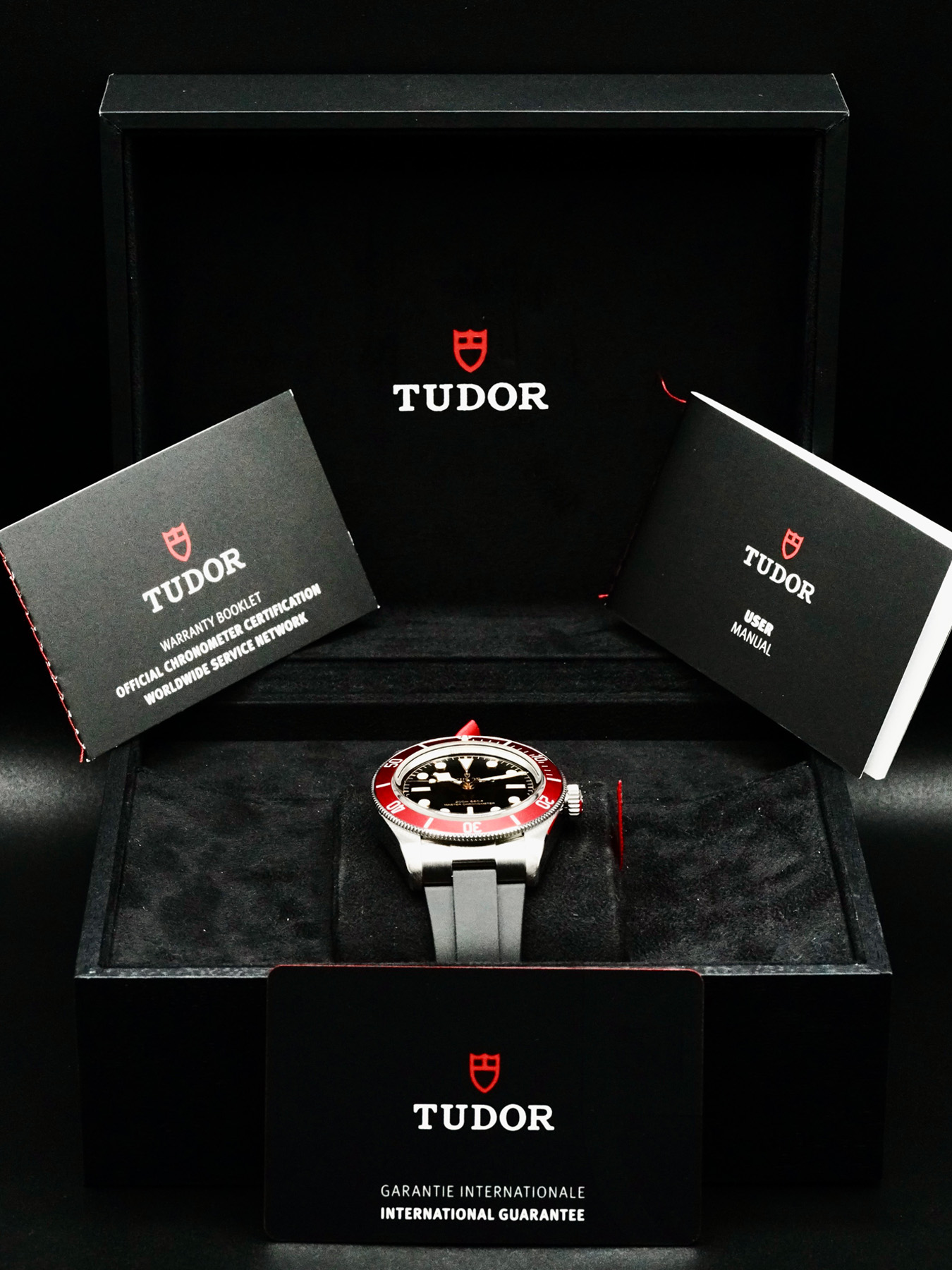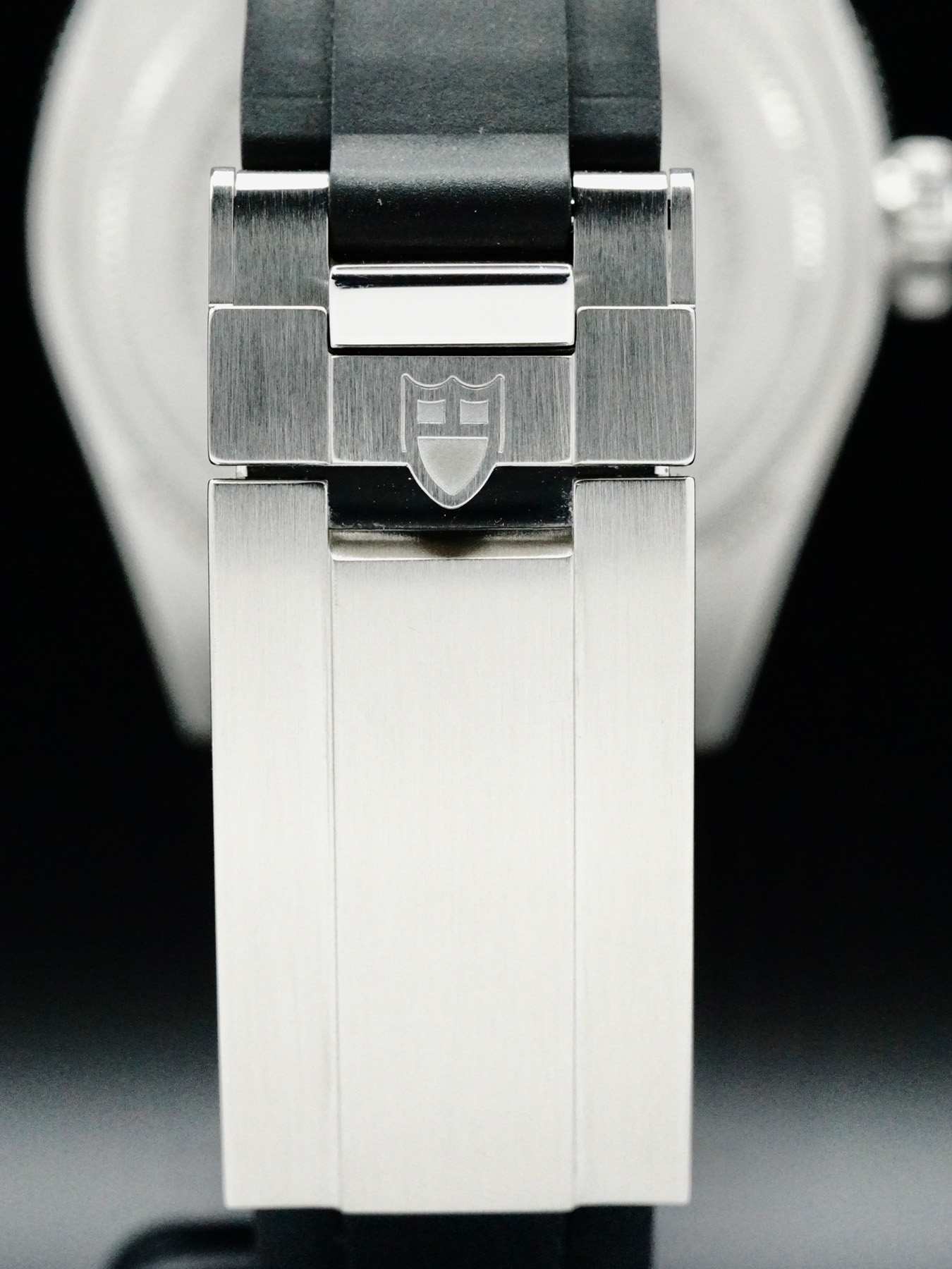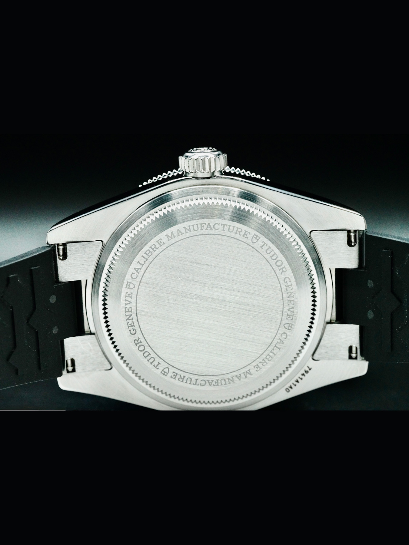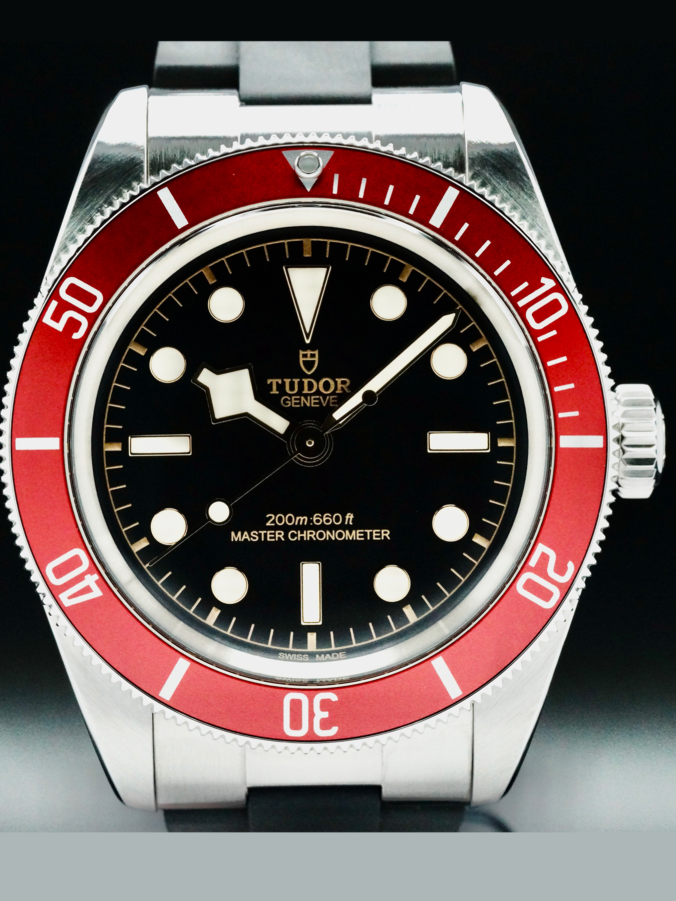 This Tudor Black Bay features a 41mm polished & satin-finished stainless steel case with a solid case back on a black rubber strap. This watch also sports a black dial with luminous hands and index dial markers covered by domed sapphire crystal.