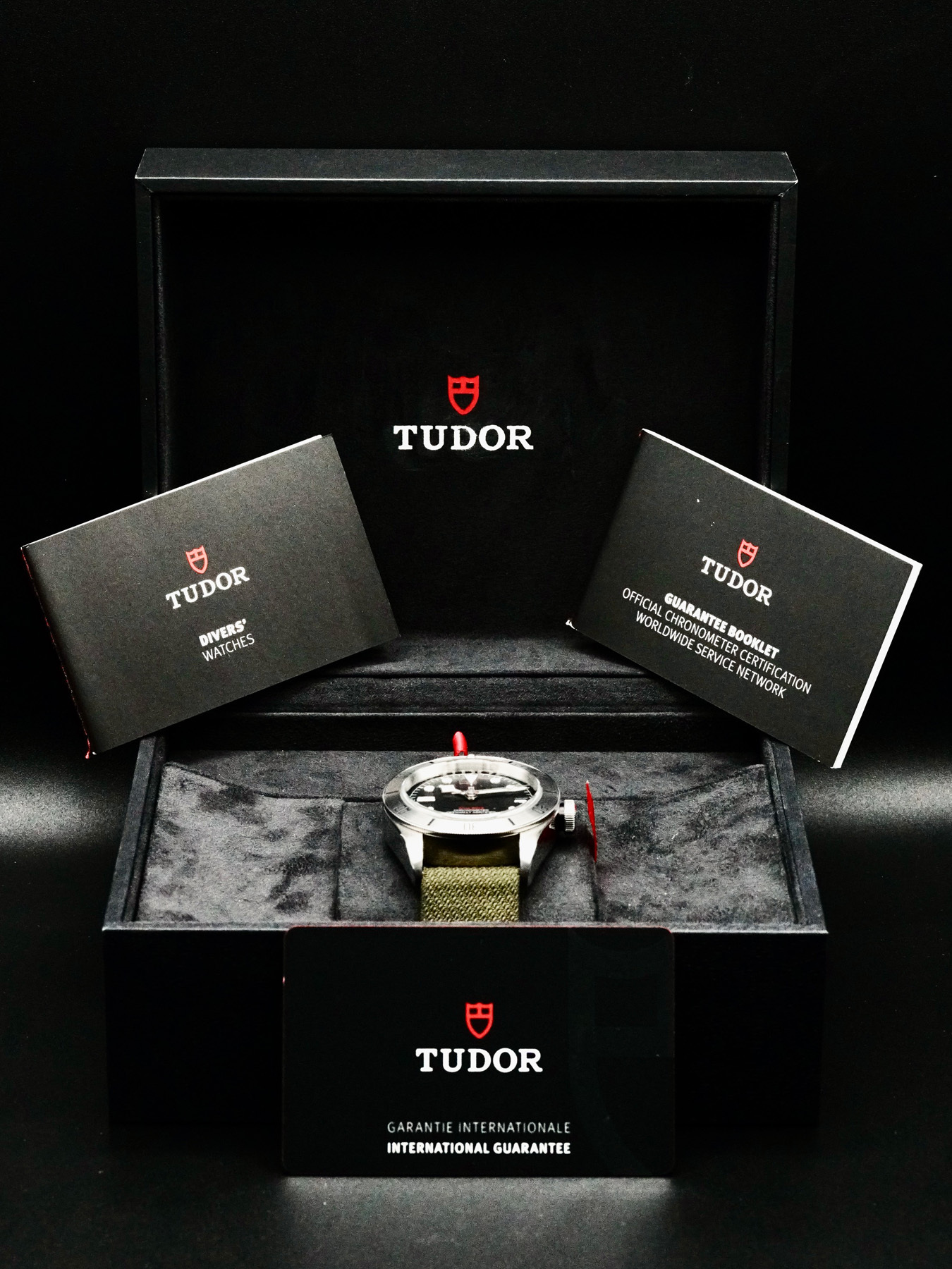 This Tudor Heritage Black Bay 79730 is in EXCELLENT condition. This watch includes its original box, instructions, and international guarantee card. No date on guarantee card.