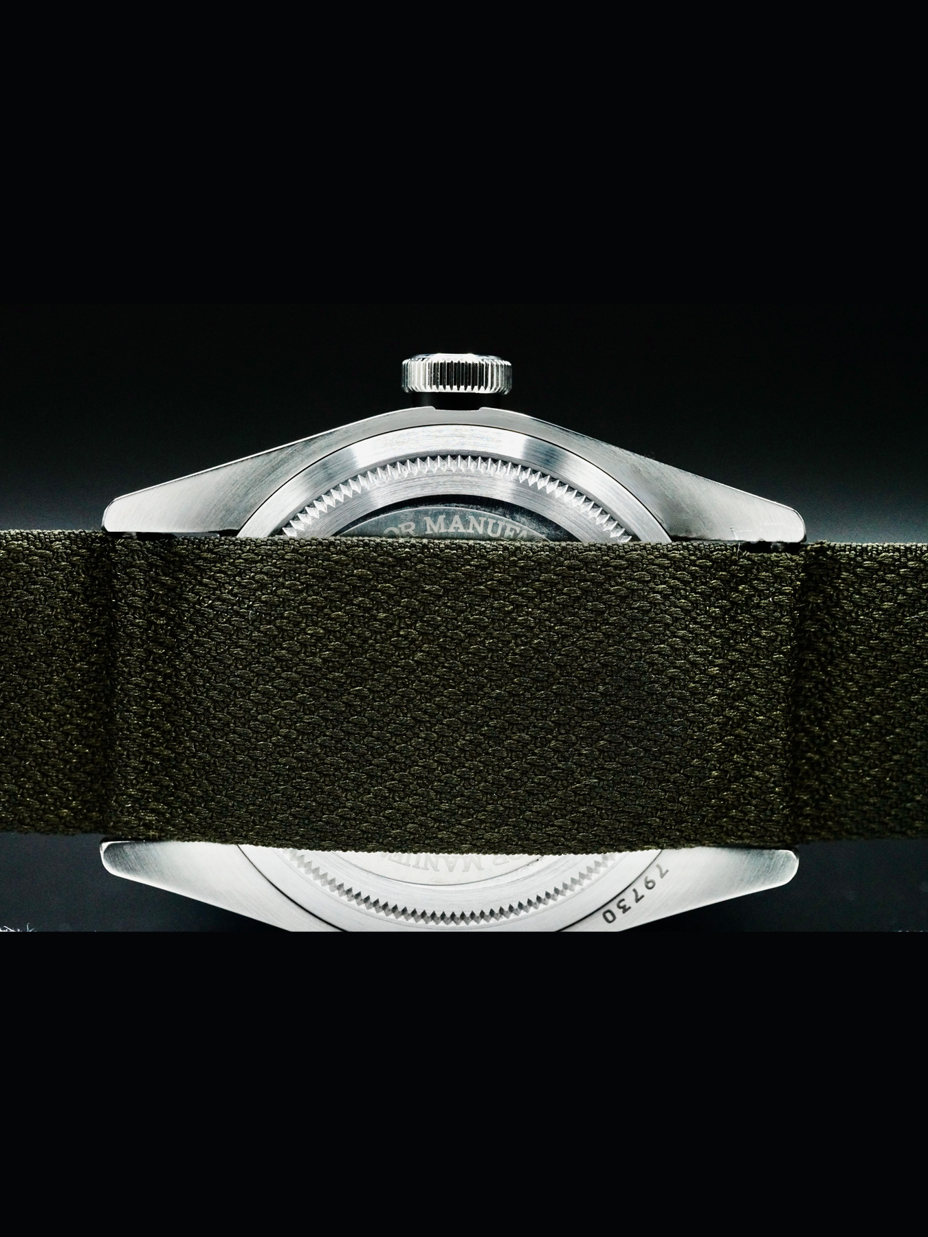 This Tudor Heritage Black Bay features a 41mm stainless steel case with a solid case back on a green textile strap. This watch also sports a black dial with luminous hands and index dial markers covered by scratch resistant sapphire crystal.