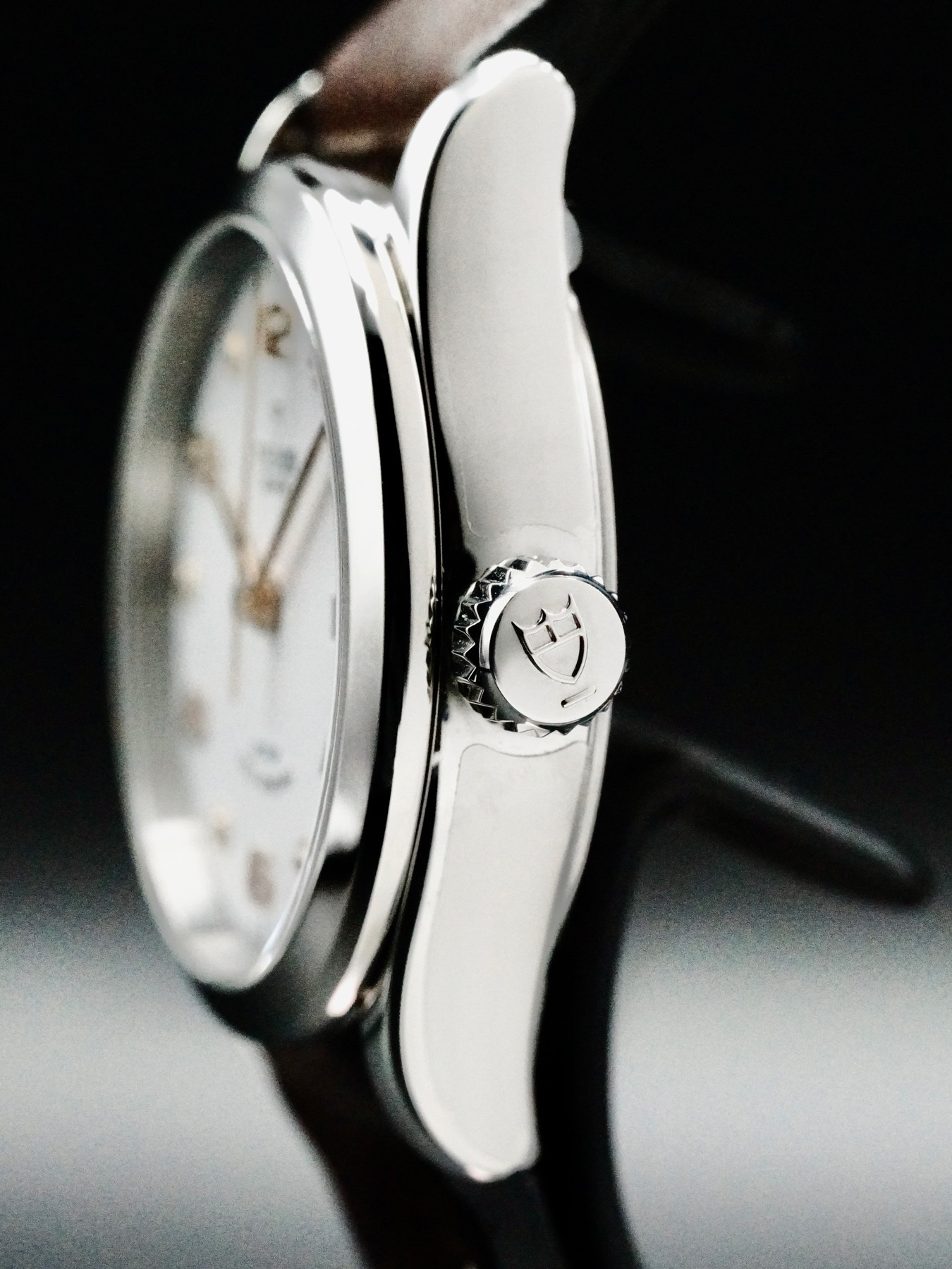 This Tudor 1926 features a 28mm stainless steel case with a solid case back on a brown leather strap. This watch also sports a white dial with rose gold hands and Arabic numeral/diamond dial markers covered by sapphire crystal.