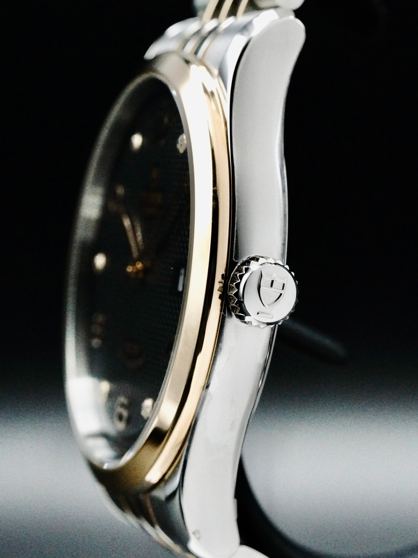 This Tudor 1926 features a 41mm stainless steel case with a rose gold bezel on a stainless steel & rose gold bracelet. This watch also sports a black dial with rose gold hands and Arabic numeral/diamond dial markers covered by sapphire crystal.