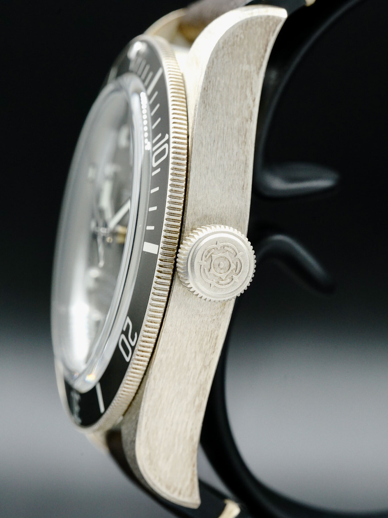 This Tudor Black Bay Fifty Eight 925 features a 39mm 925 silver case with a display case back on a brown leather strap. This watch also sports a grey dial with luminous hands and index dial markers covered by scratch resistant sapphire crystal.