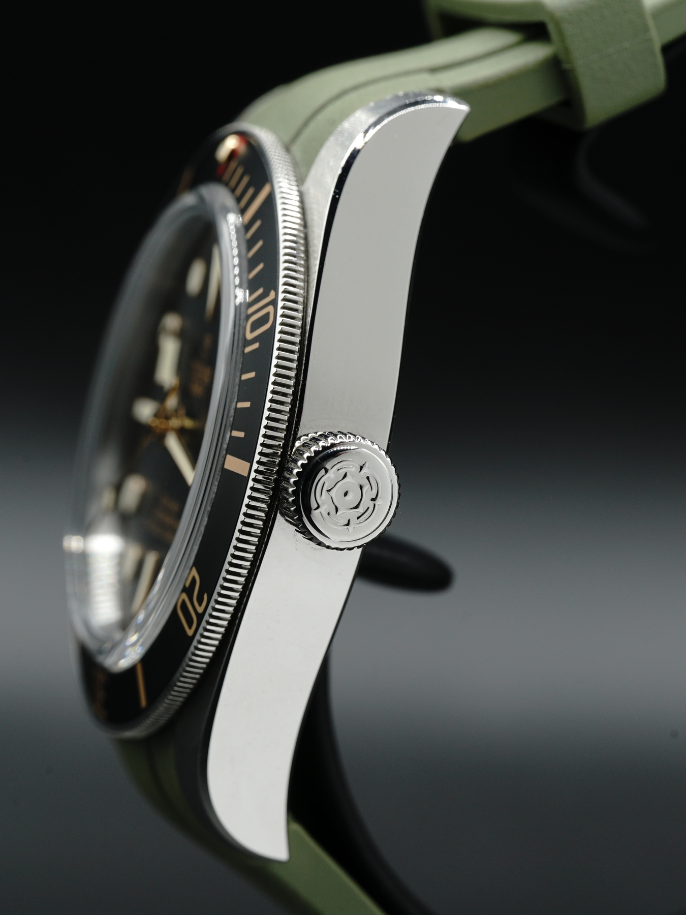 - This timepiece features a 39mm steel case paired with a high quality rubber strap. It showcases a distinctive black dial and is powered by a precise automatic winding movement. The watch is designed with a water resistance of up to 200m.