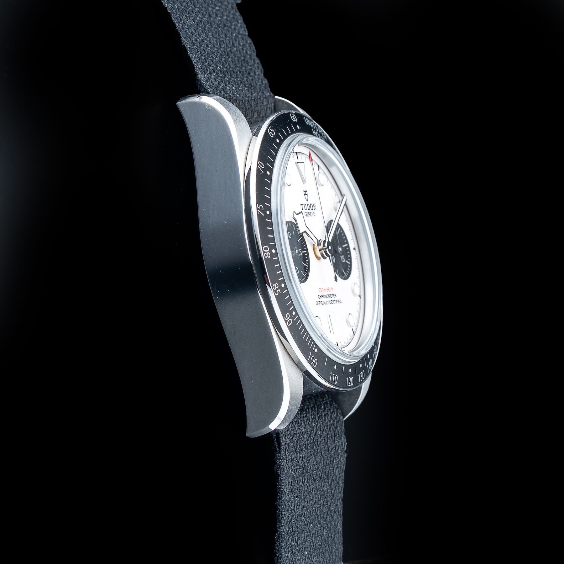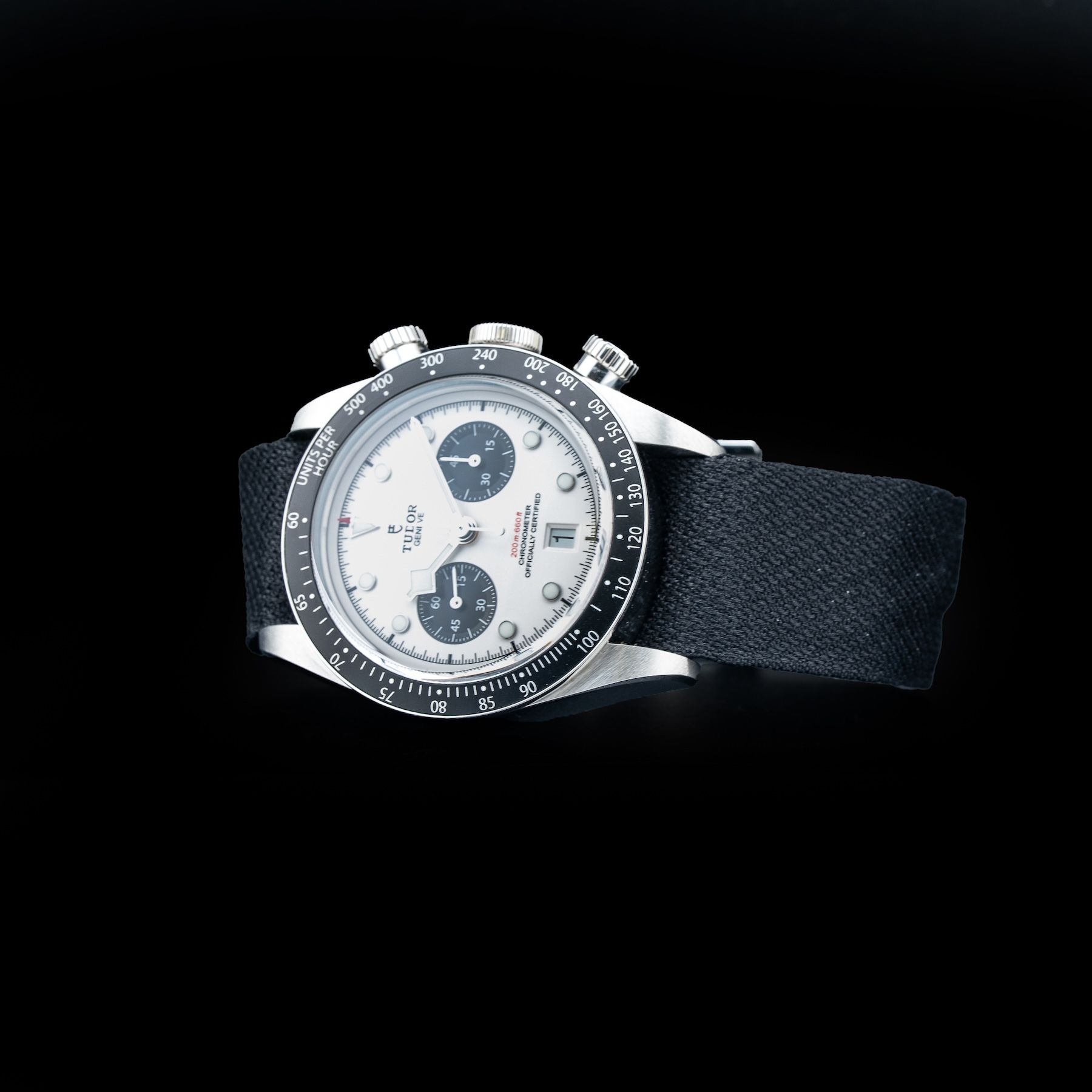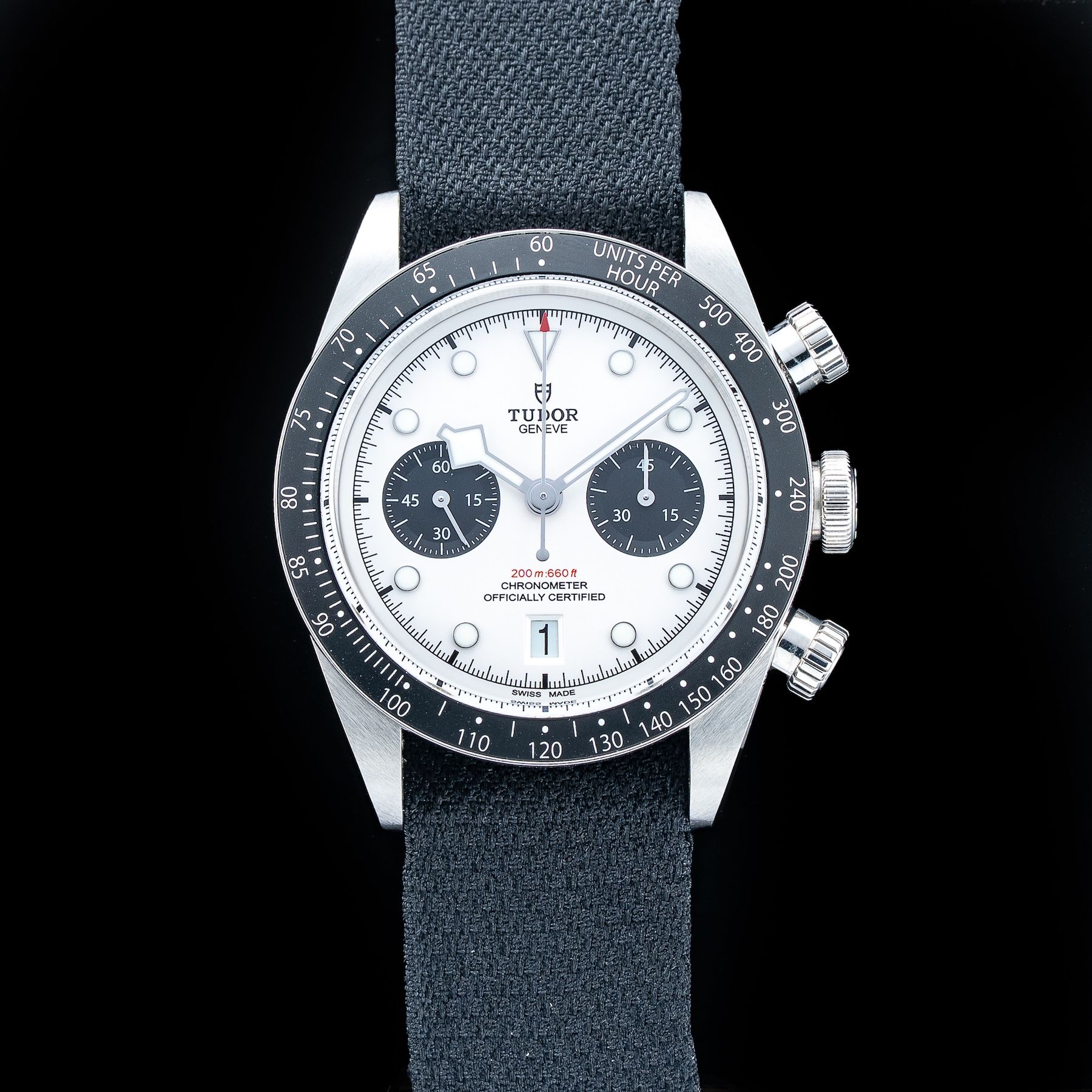 This watch features a 41mm steel case on black fabric strap. This watch also sports a opaline dial. Powered by a self-winding movement. Water resistance up to 200 meters.