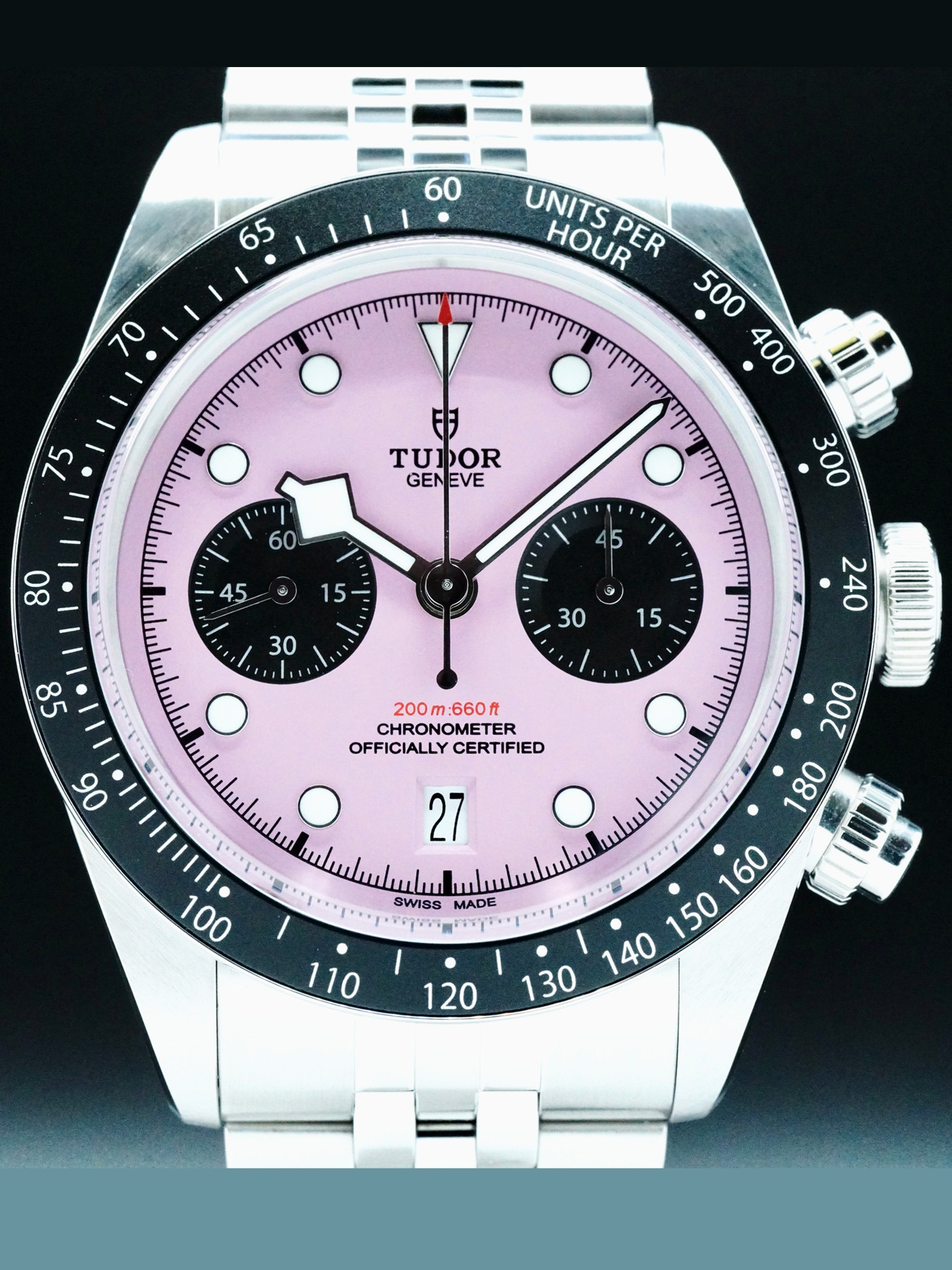 This watch features a 41 mm stainless steel case on stainless steel bracelet. This watch also sports a pink dial. Powered by a self-winding movement. Water resistance up to 200 meters.