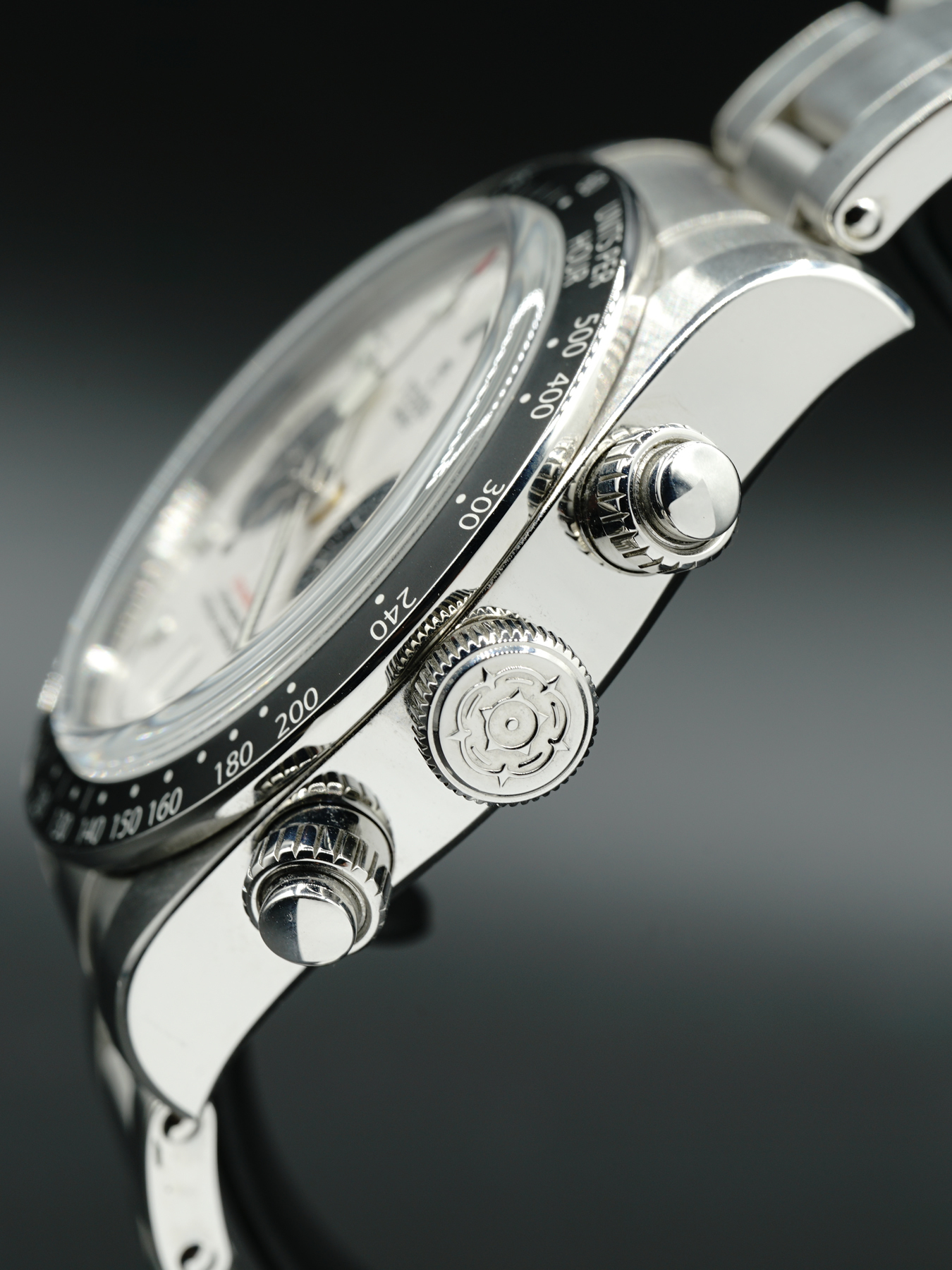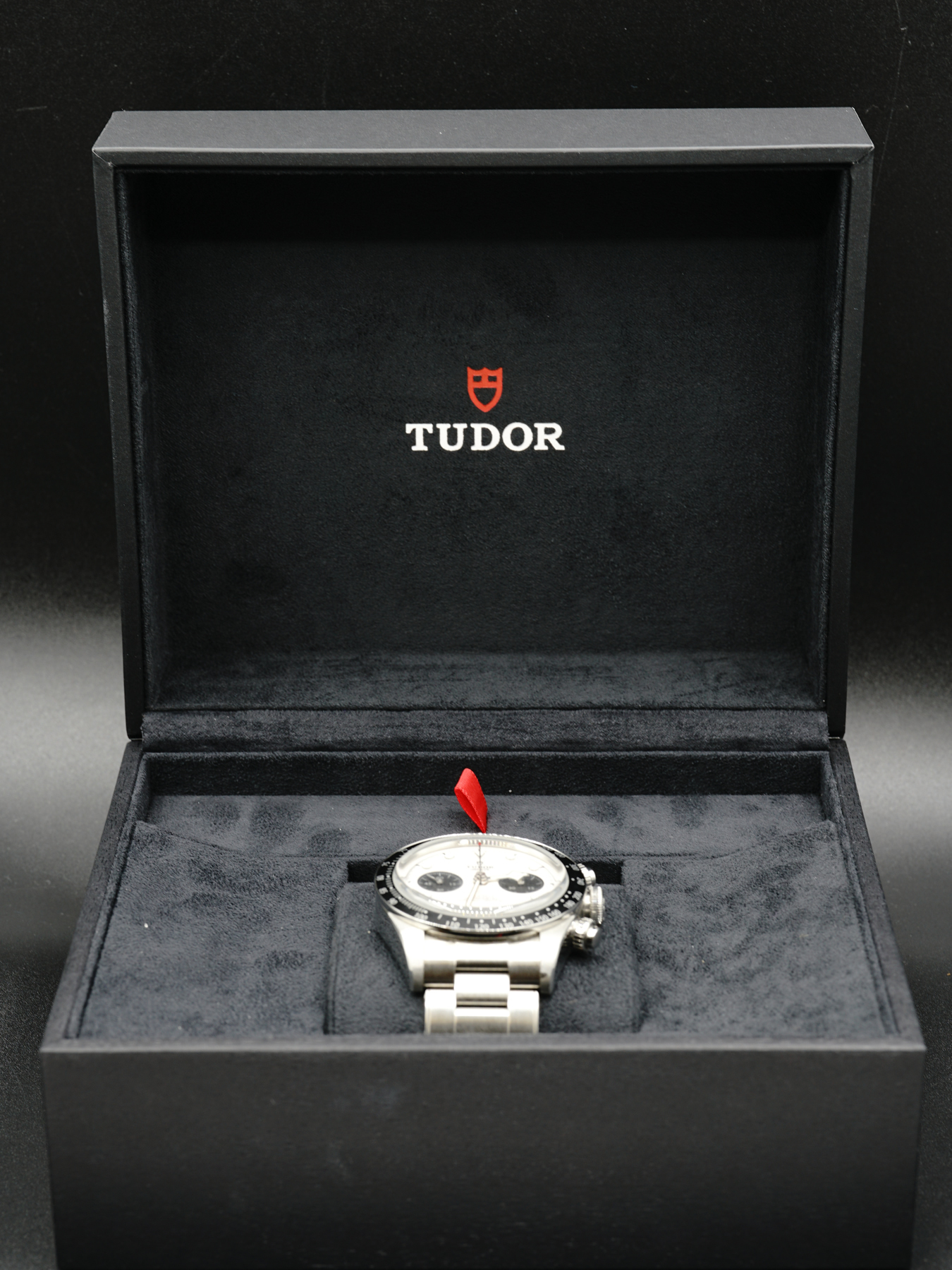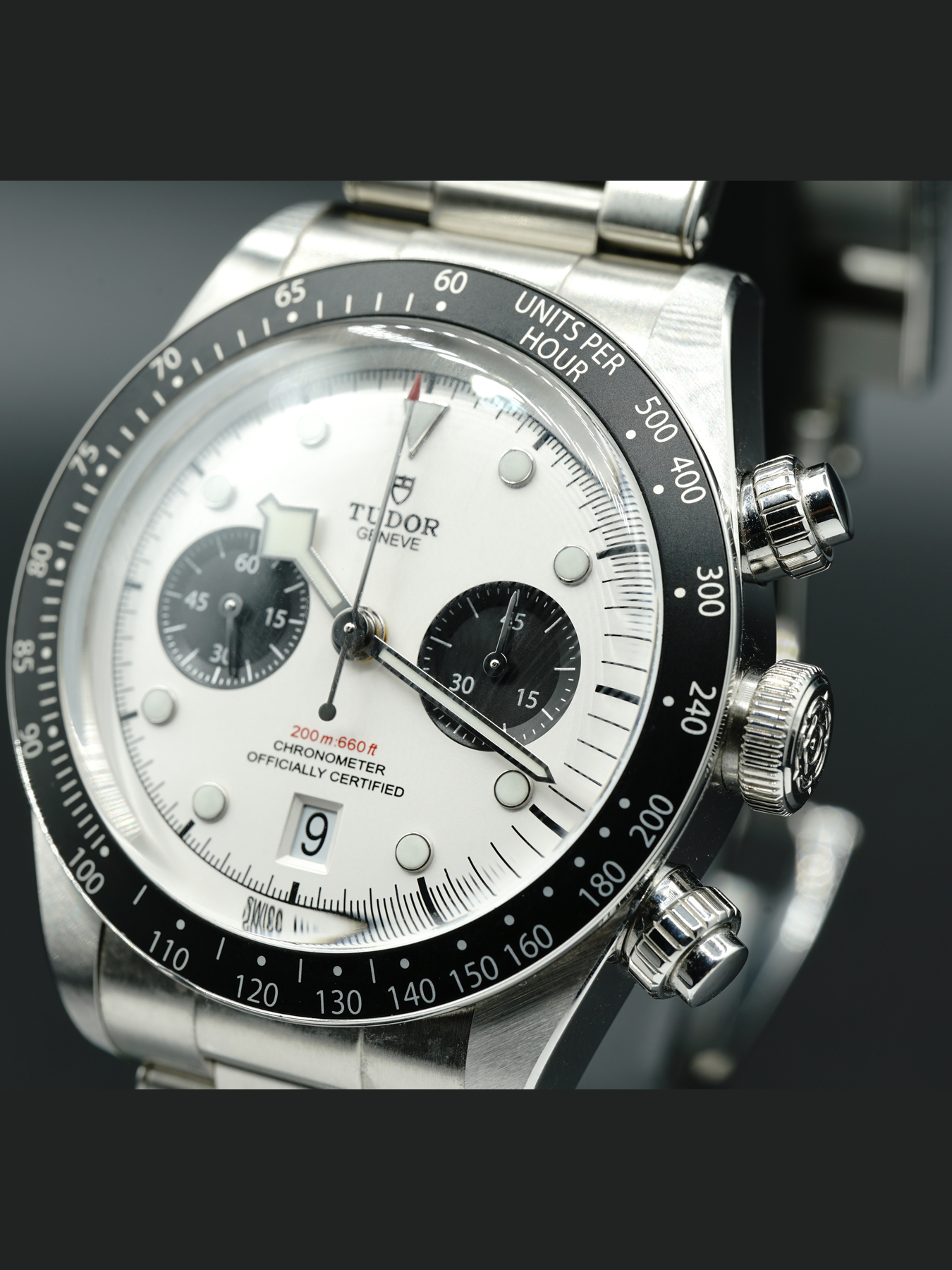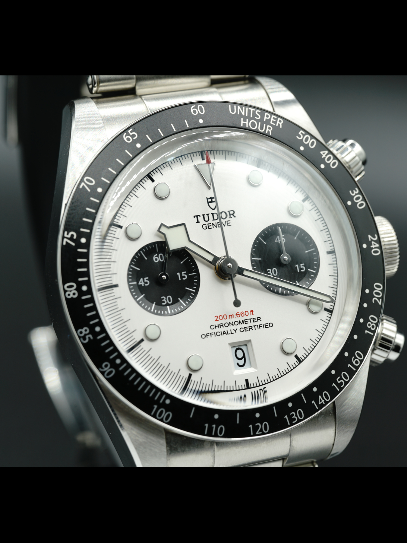 This Tudor Black Bay White Dial Chronograph Watch is in GREAT condition. This watch offers a stainless steel 41mm case attached to a stainless steel band. It's accented by a fixed black aluminum bezel with white tachymeter markings. On the crisp white dial, you'll find luminous hands, luminous index markers, a date dial at the 6 o'clock position, and contrasting black subdials. It's powered by a Tudor calibre MT5813 with 70 hours of power reserve time, and is water resistant up to 200 meters. This watch includes its original box, papers, and warranty card dated April 2021.