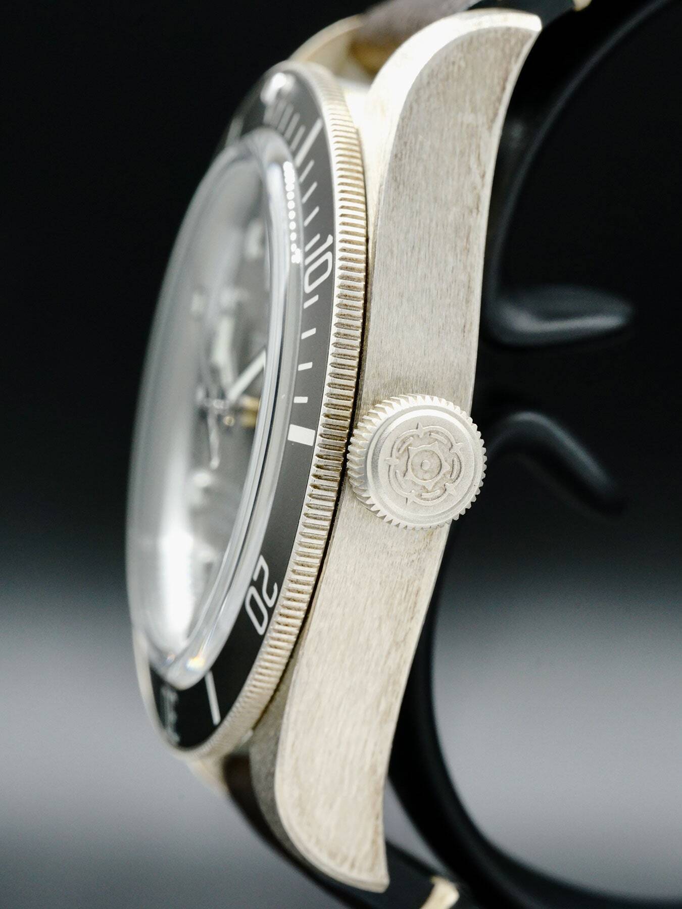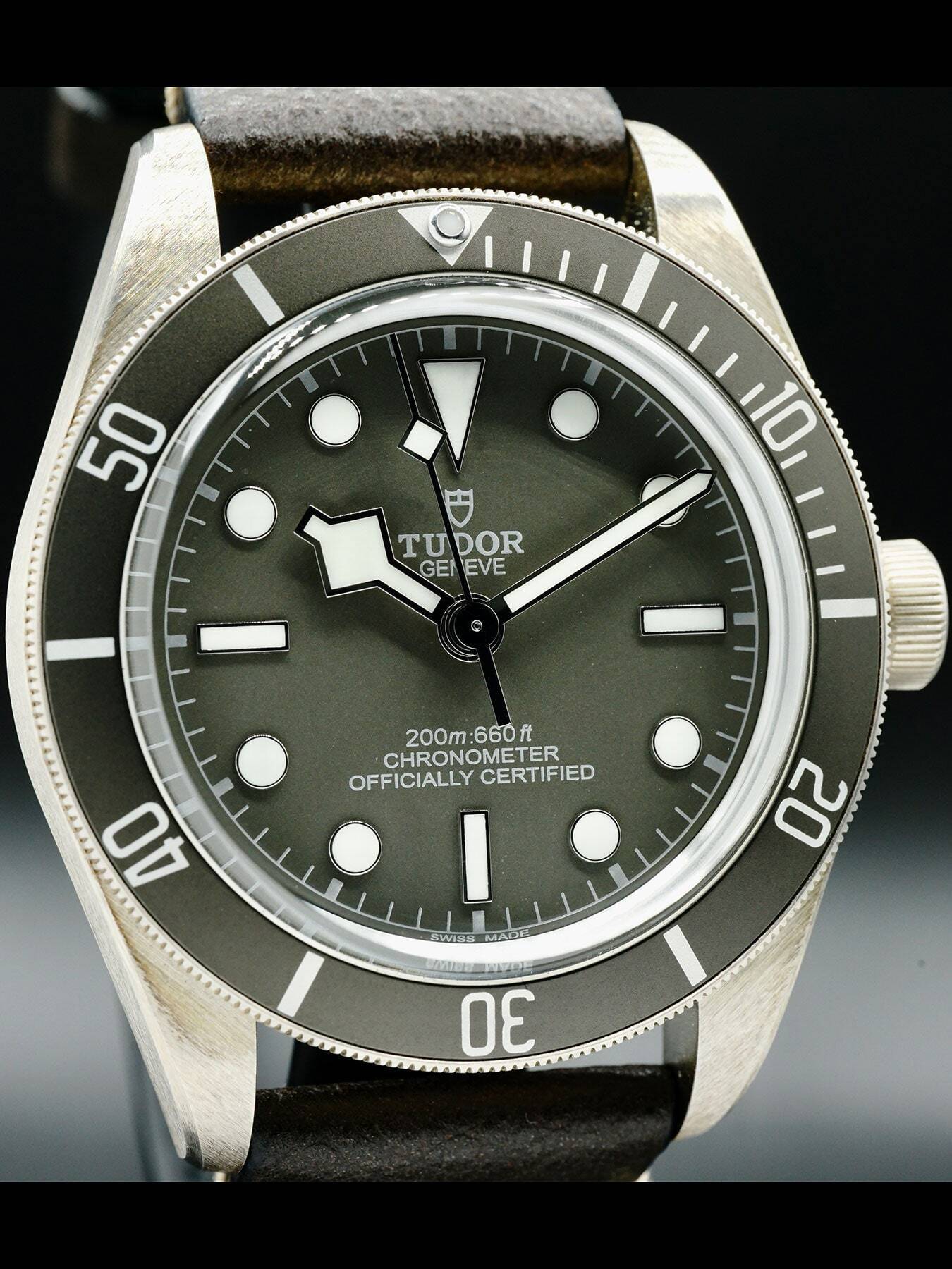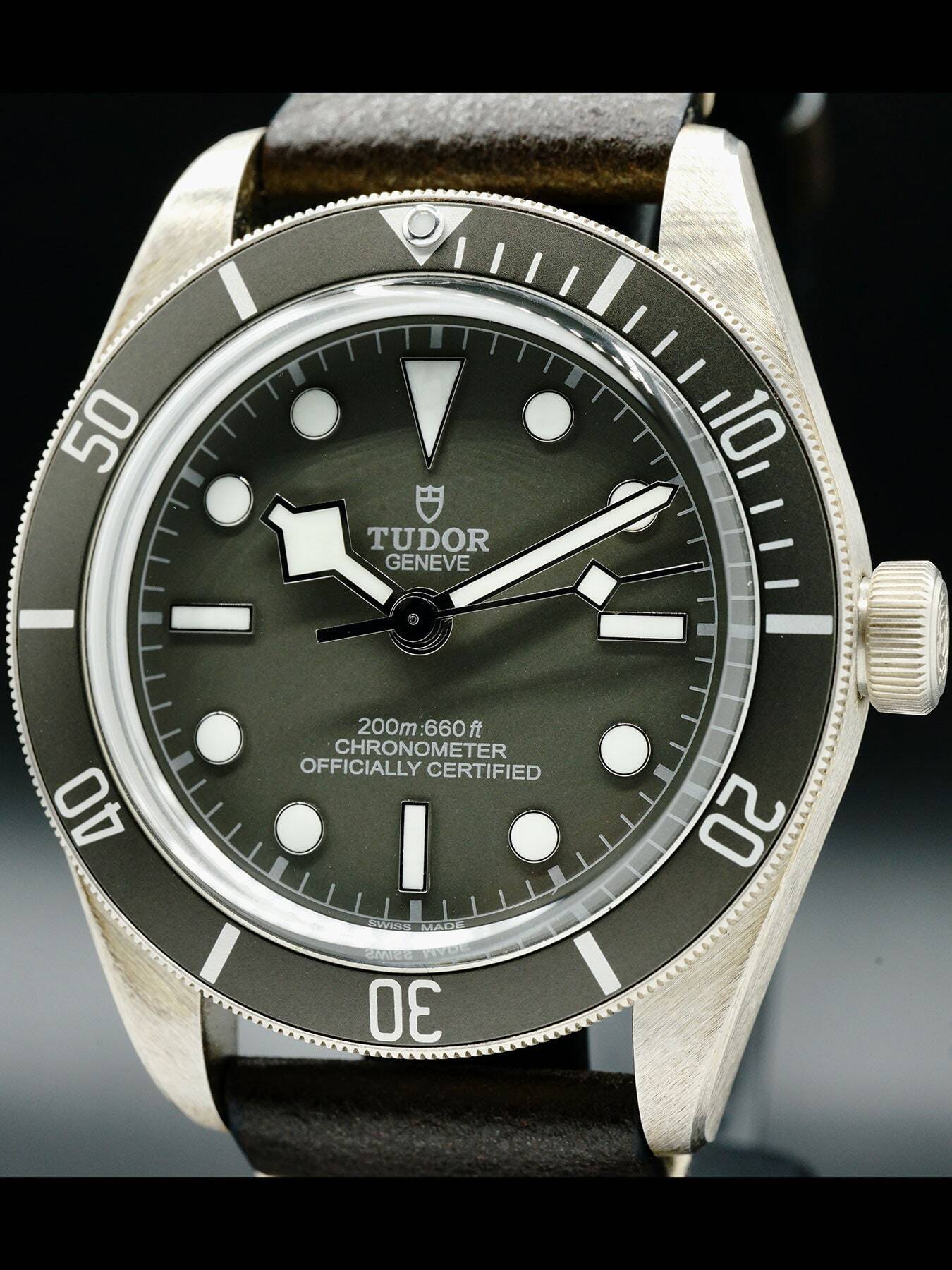 This Tudor Black Bay 58 925 features a 39mm 925 silver case with a display case back on a brown leather strap. This watch also sports a grey taupe dial with luminous hands and dial markers covered by scratch resistant sapphire crystal.