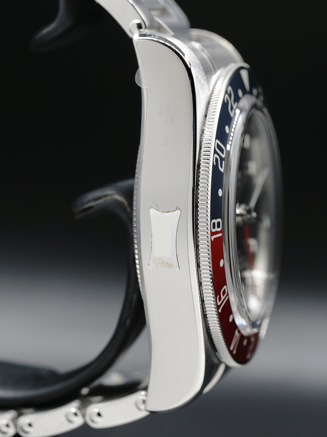 This Tudor Black Bay GMT features a 41mm stainless steel case with polished and satin finish and a solid case back on a riveted stainless steel bracelet. This watch also sports a black dial with luminous hands covered by domed, scratch resistant sapphire crystal.