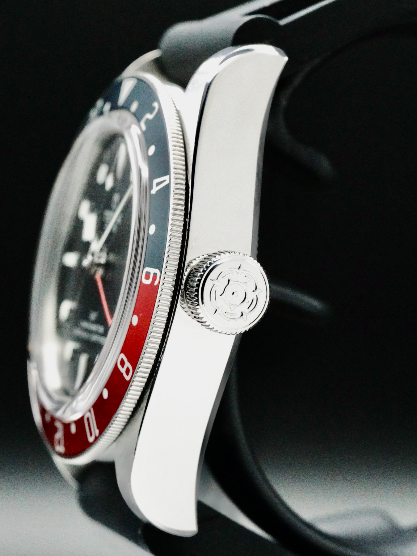 This Tudor Black Bay GMT on Strap 79830RB features a 41mm stainless steel case with a solid case back on a black rubber strap. This watch also sports a black dial with luminous hands and luminous indexes covered by scratch resistant sapphire crystal.