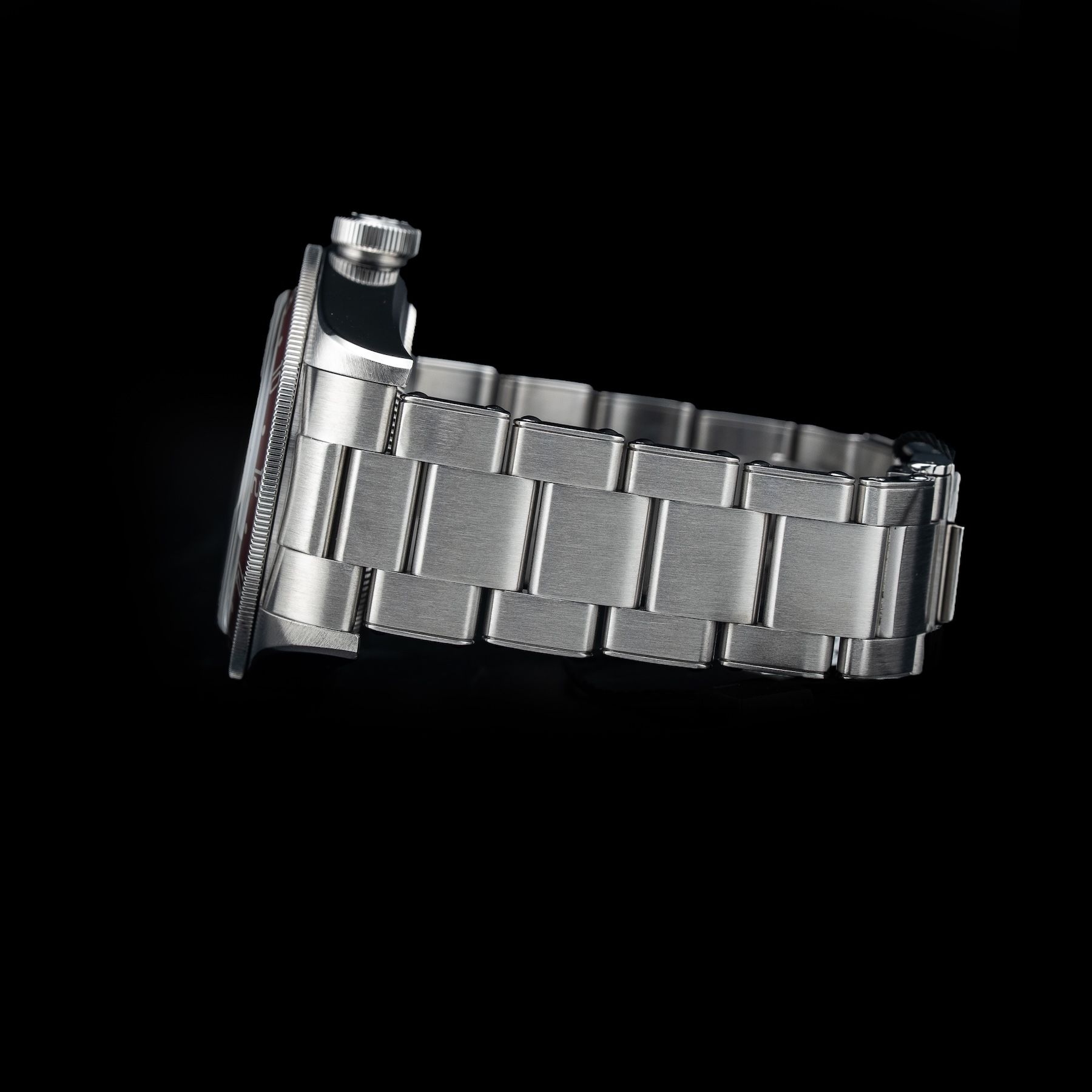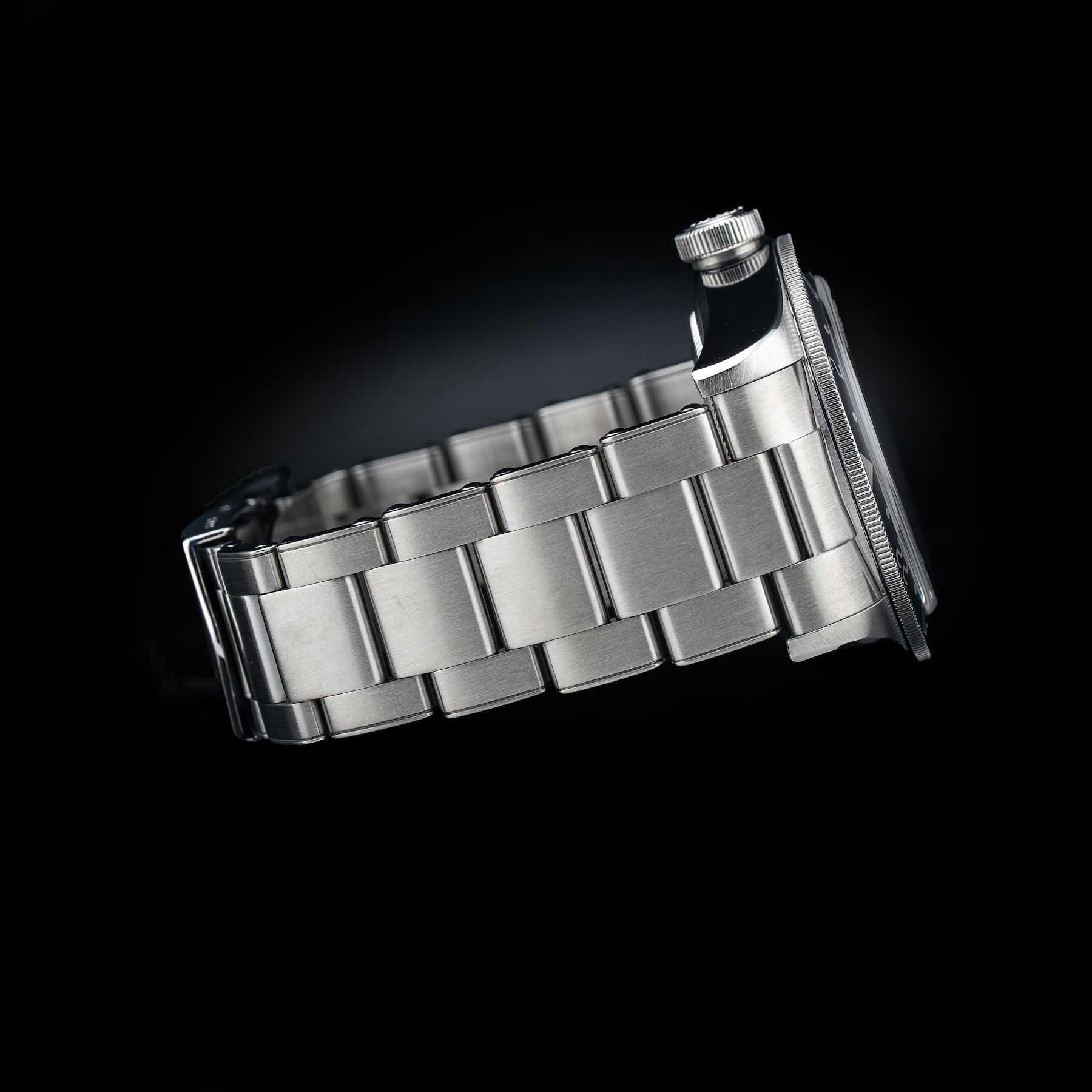 This watch features a 41mm steel case on steel bracelet. This watch also sports a black dial. Powered by a self-winding mechanical movement. Water resistance up to 200 meters.