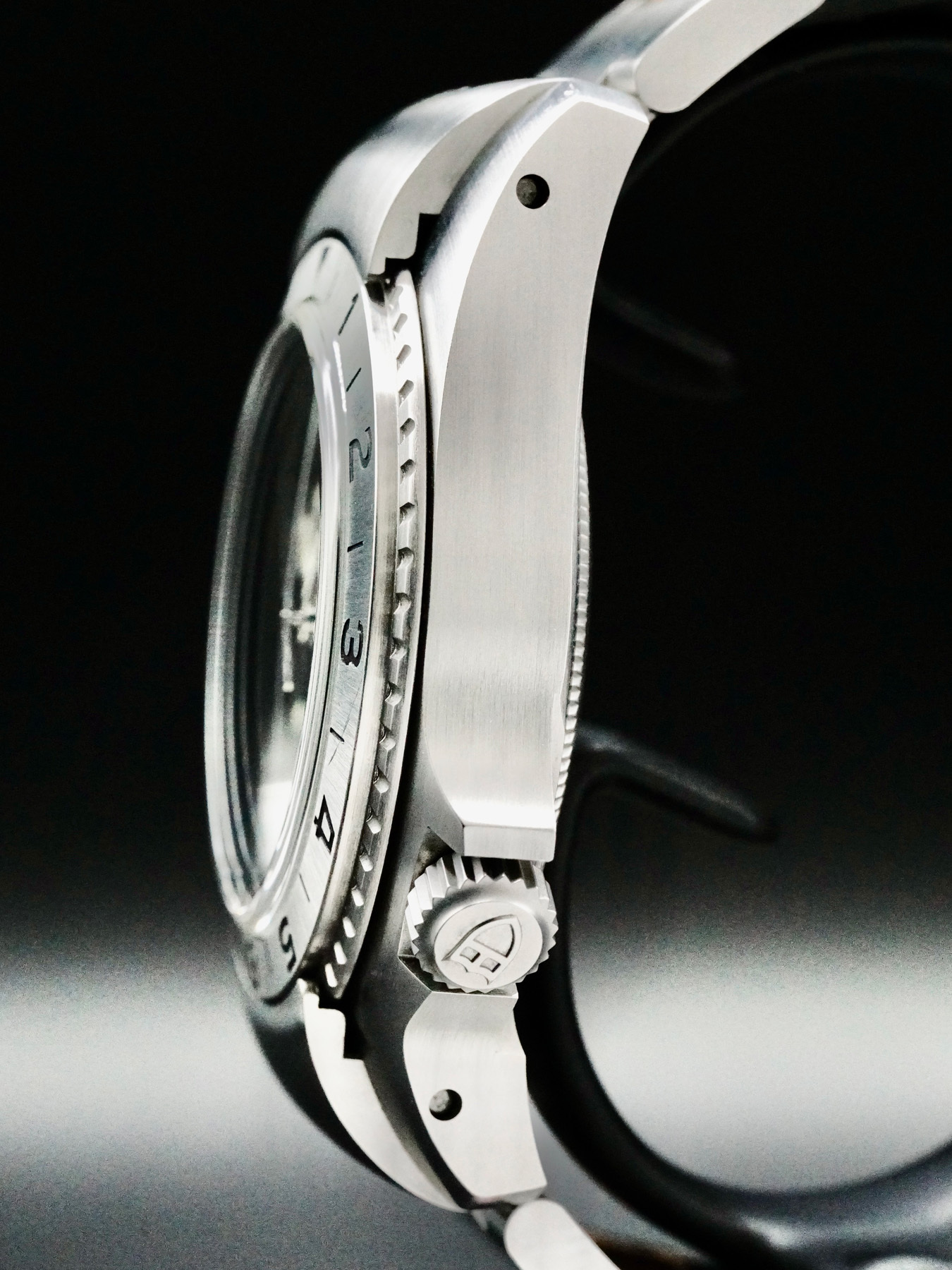 This watch features a 42mm steel case on bracelet. This watch also sports a black dial. Powered by a Mechanical automatic movement. Water resistance up to 200 meters.