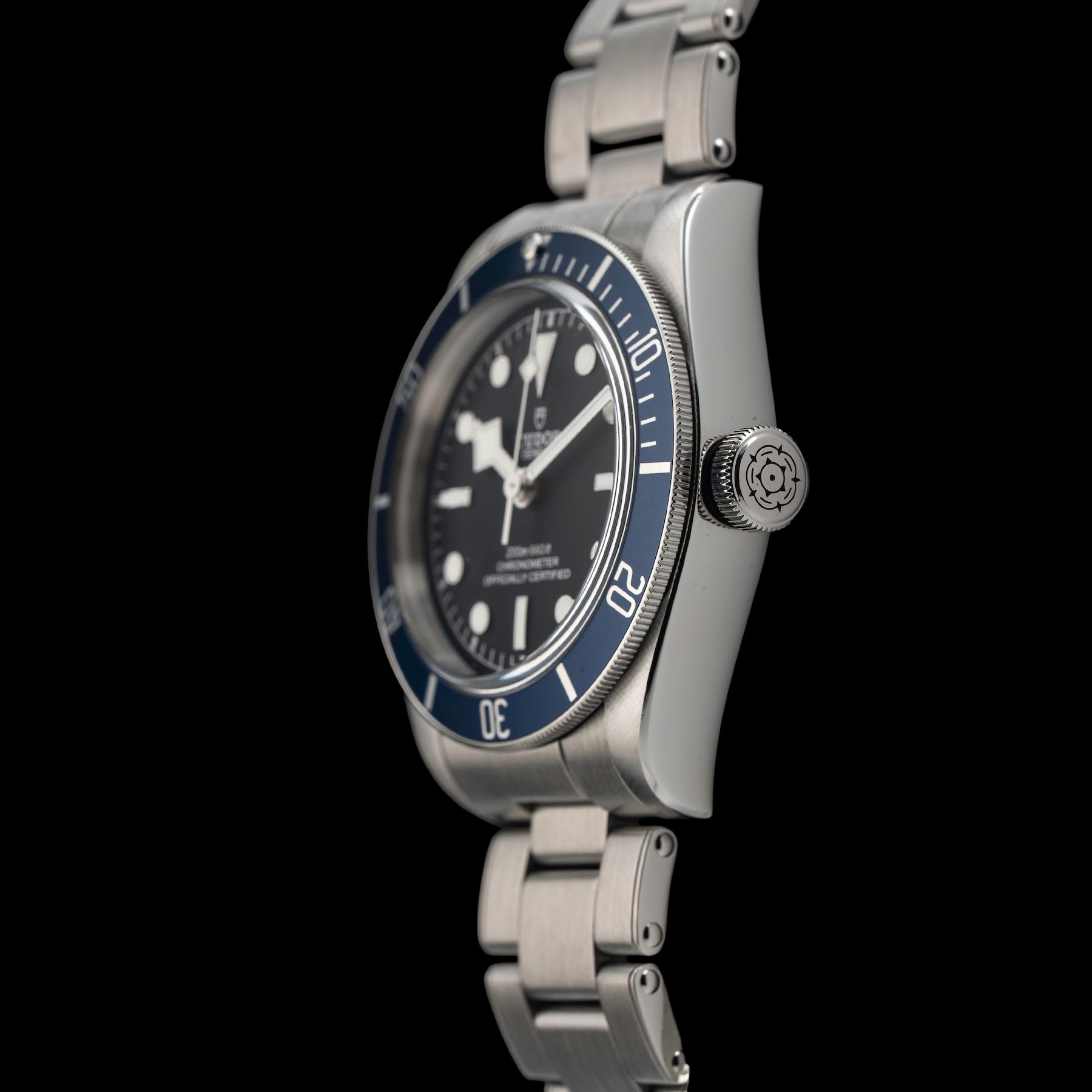 Screw-down Steel Winding Crown, With The TUDOR Rose Engraved And Black-lacquered, With Blue Anodised Aluminium Winding Crown Tube