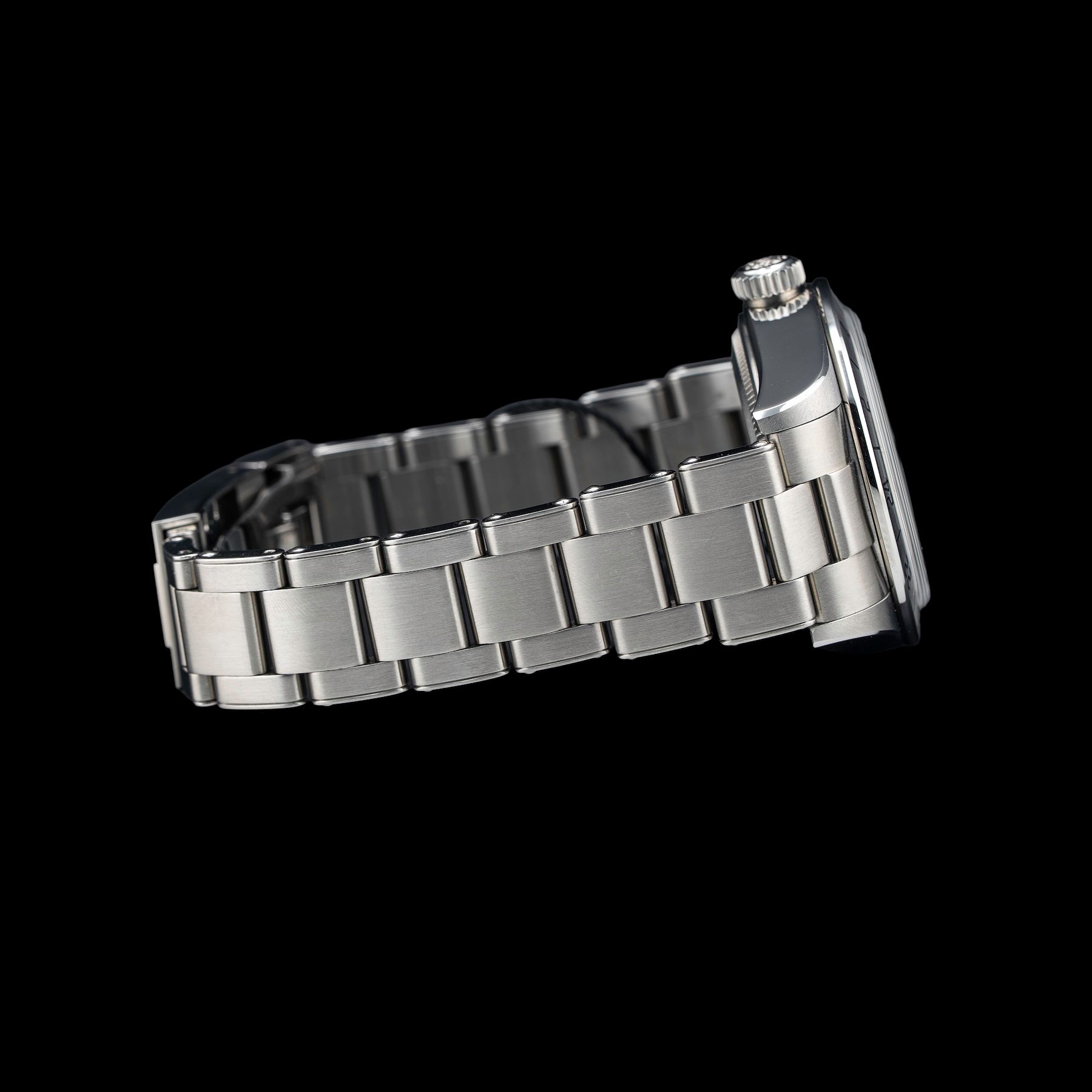 This watch features a 39mm steel case on steel bracelet. This watch also sports a opaline dial. Powered by a self-winding mechanical movement. Water resistance up to 200 meters.