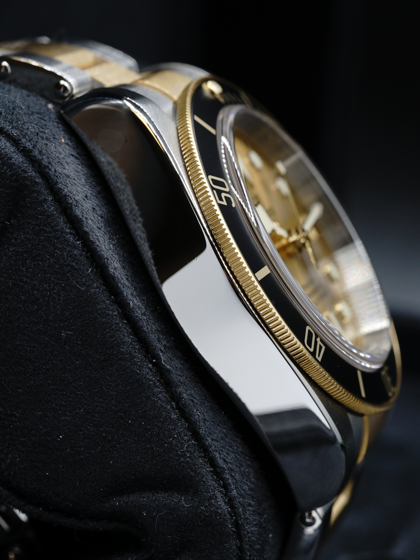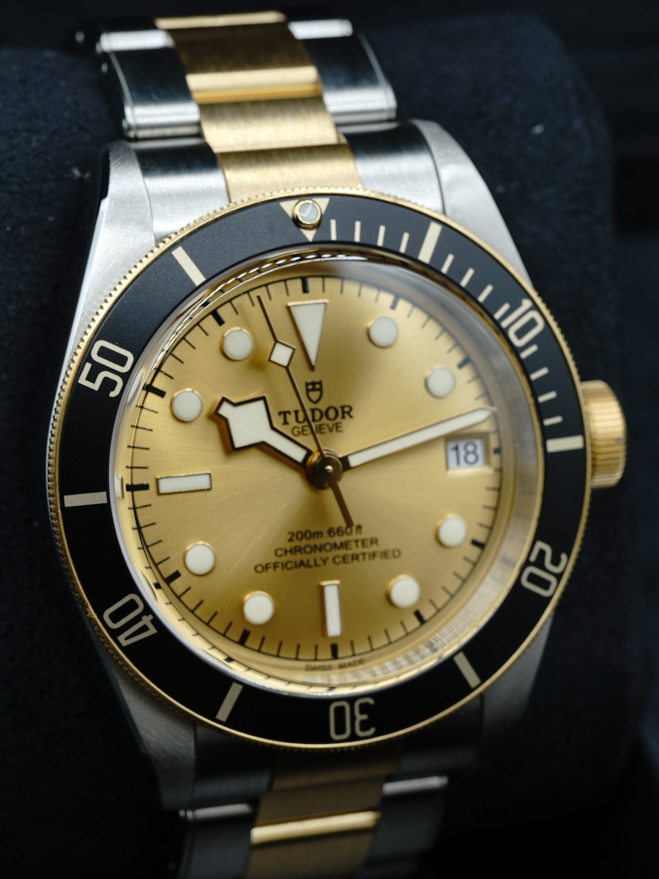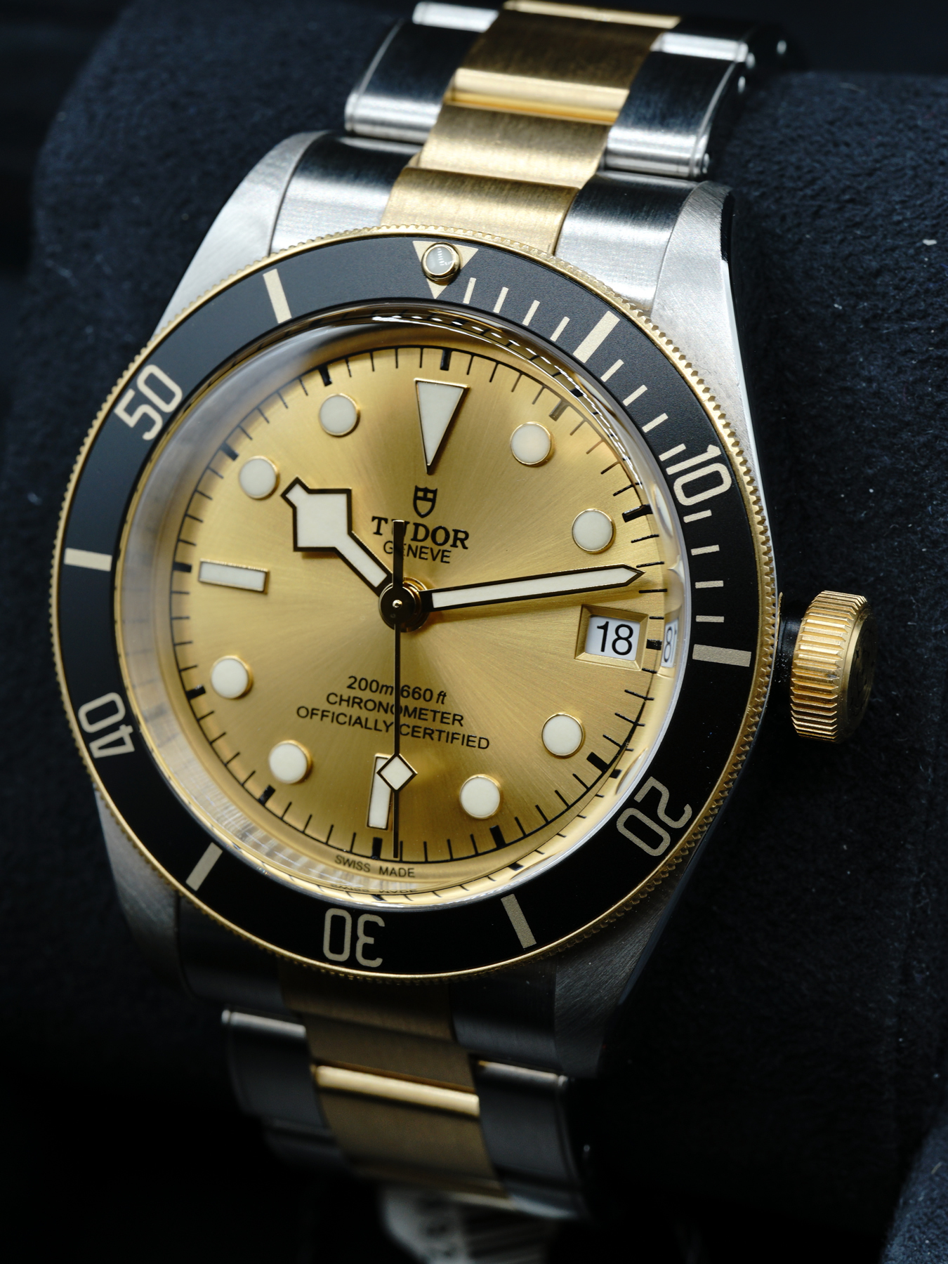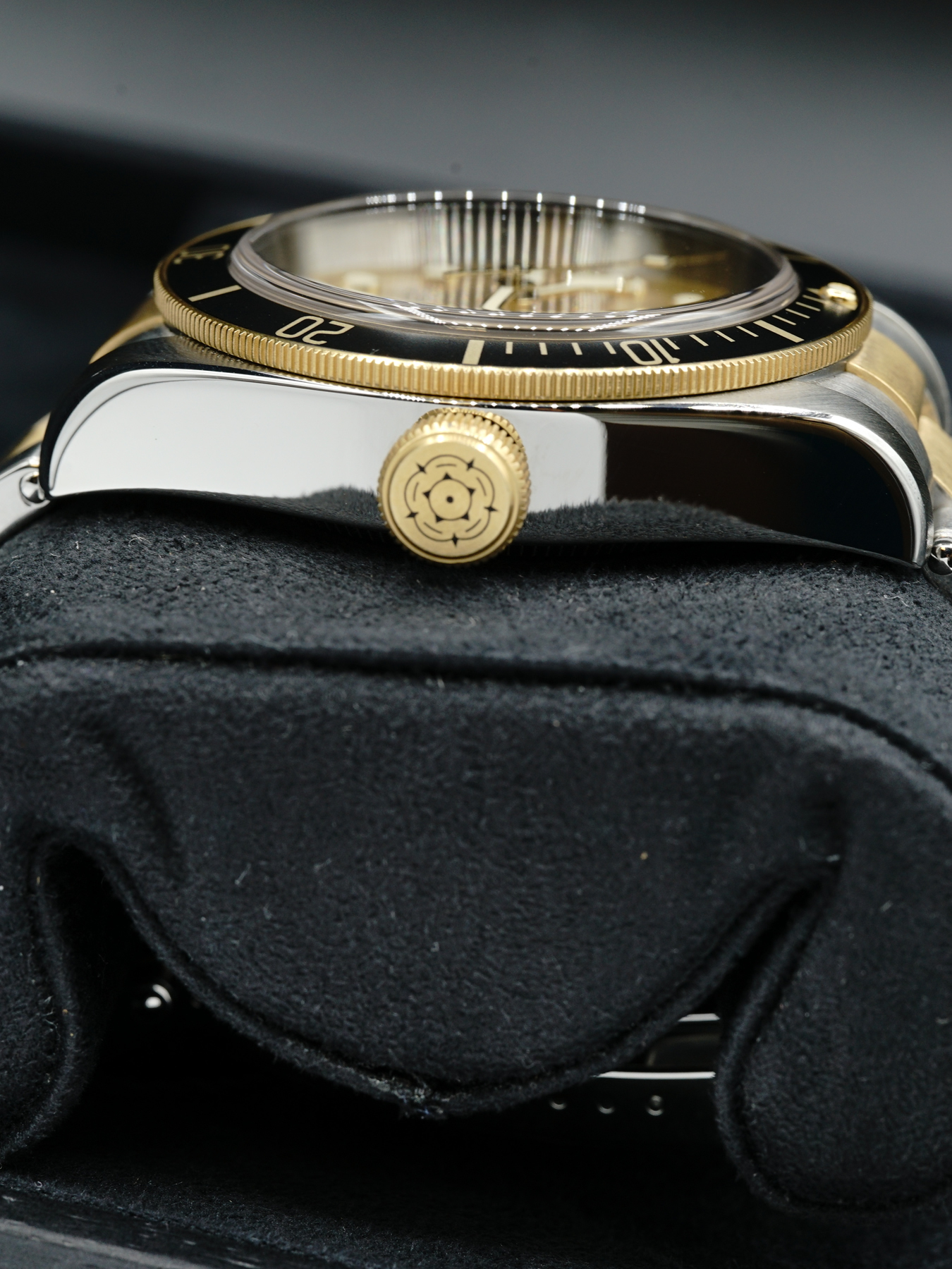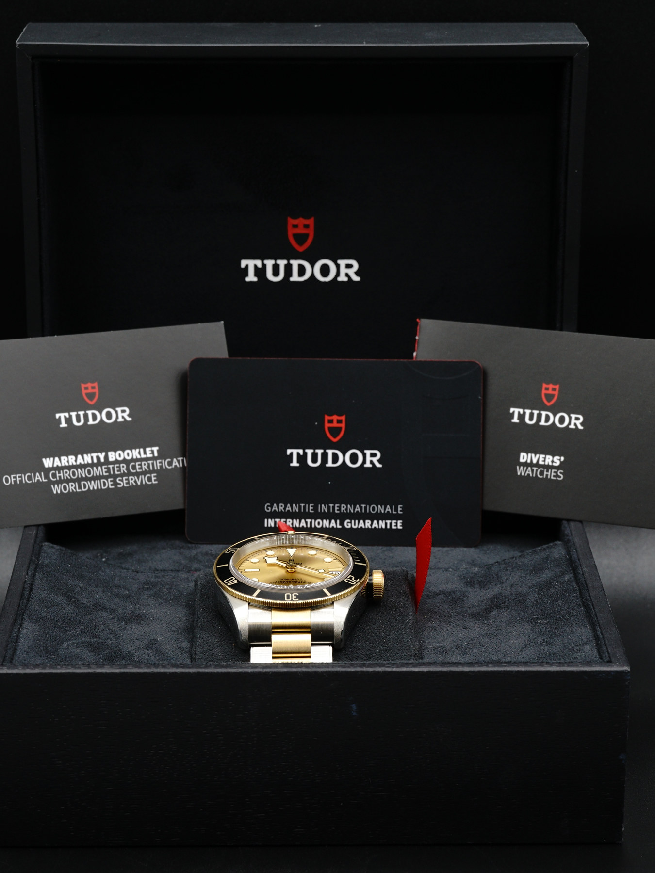 This Tudor Black Bay S&G features a stainless steel and 18K yellow gold case. The dial is a beautiful champagne with luminous hour markers and hands. The bracelet measures approximately 7 1/2" including the case. Water-resistant to 20 ATM / 200 Meters.