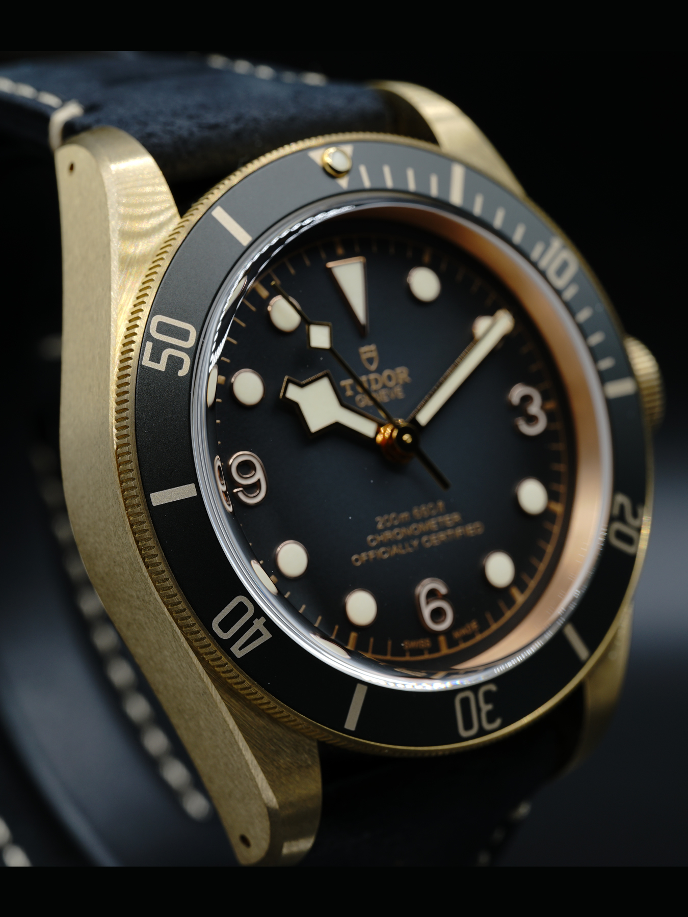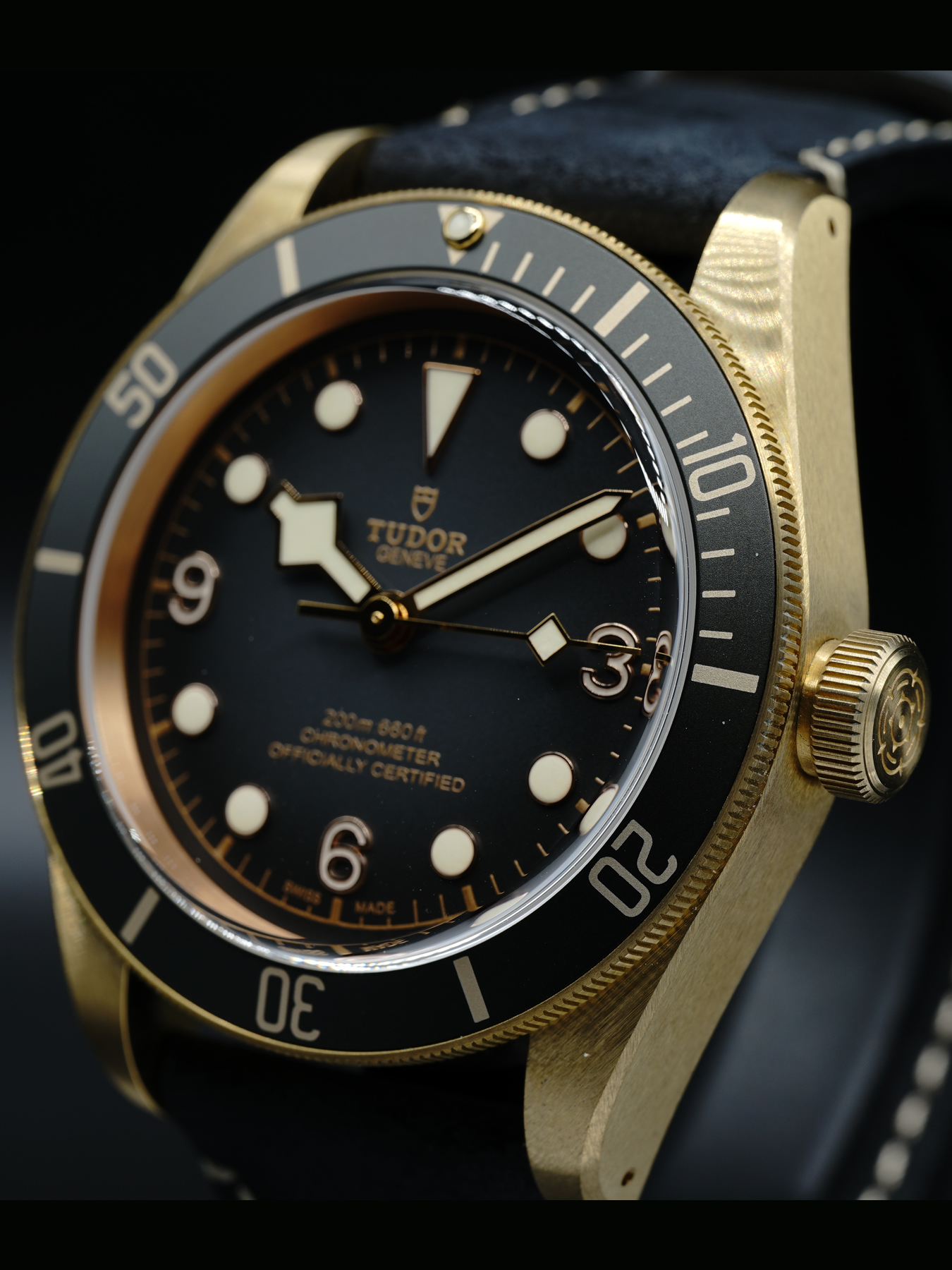 - This timepiece features a 43mm bronze case paired with a high quality leather strap. It showcases a distinctive black dial and is powered by a precise automatic winding movement. The watch is designed with a water resistance of up to 200m.