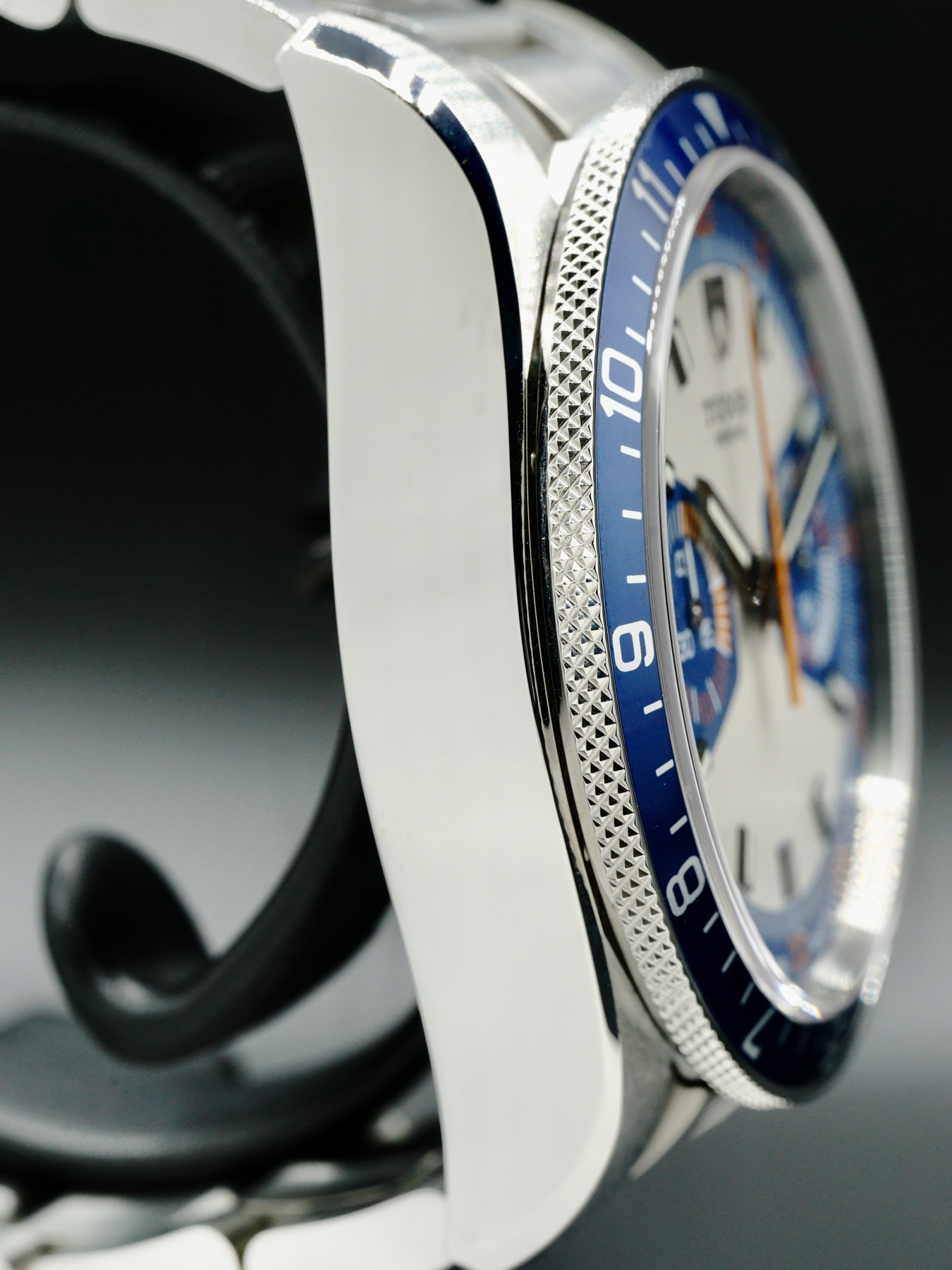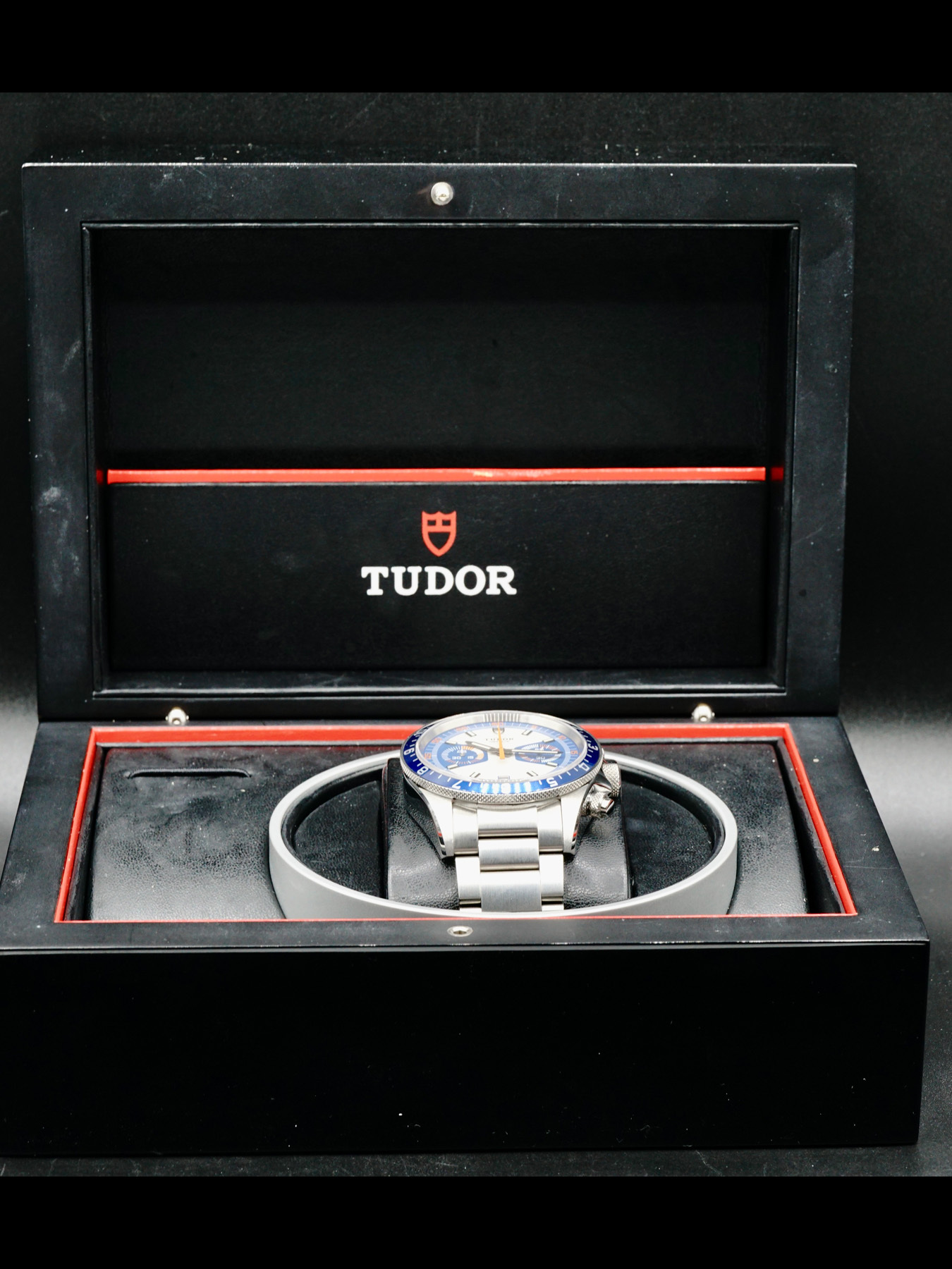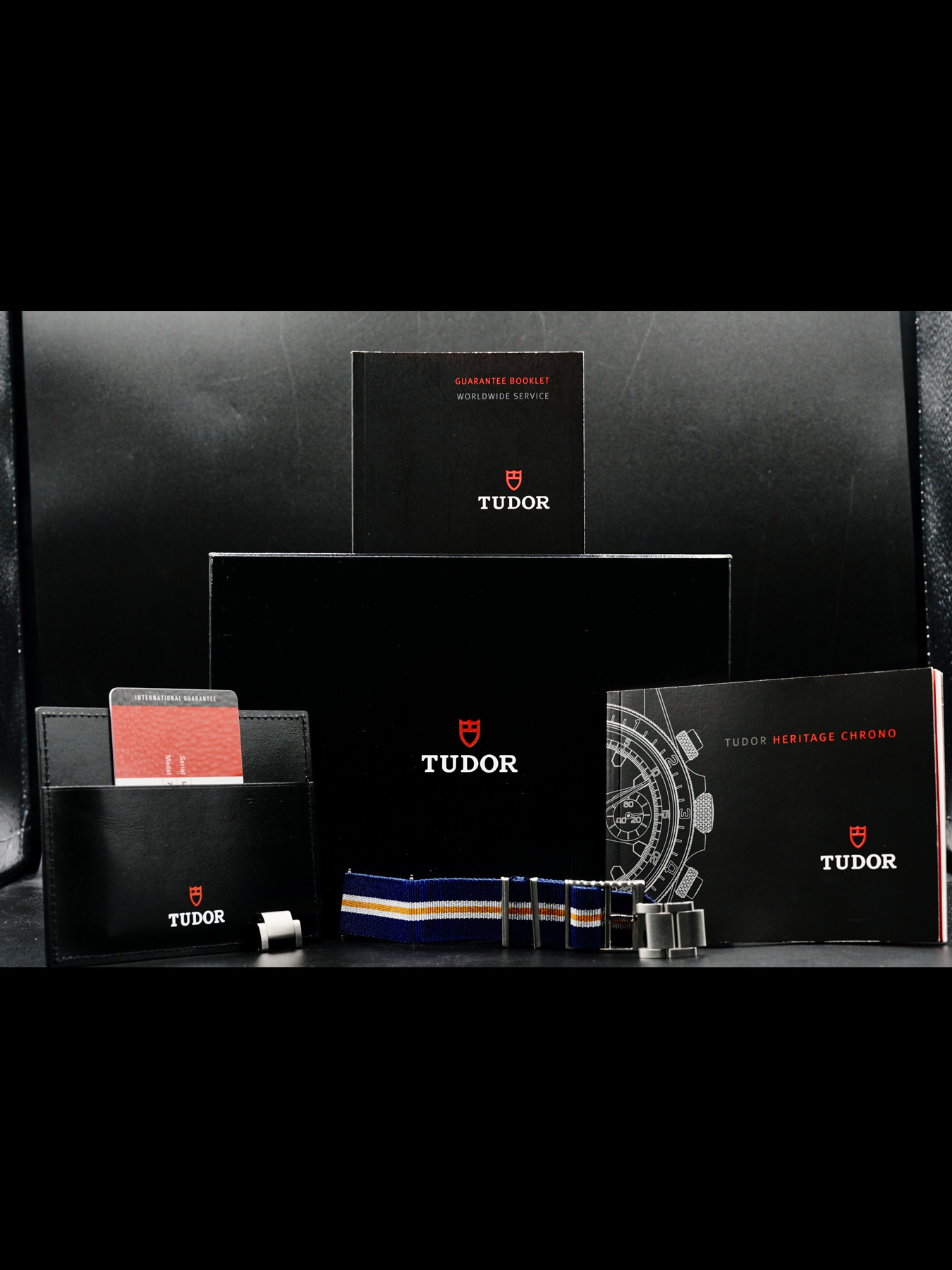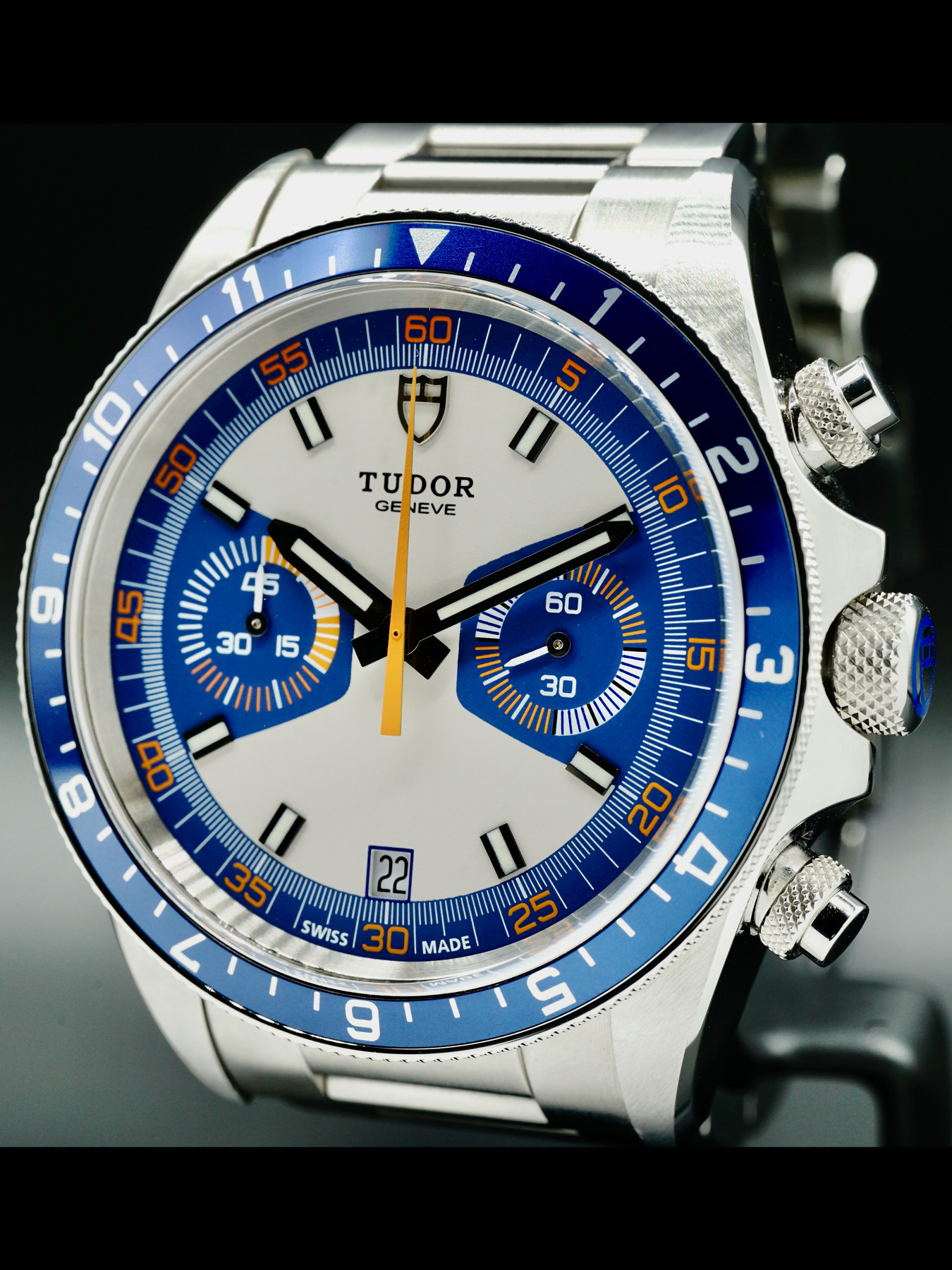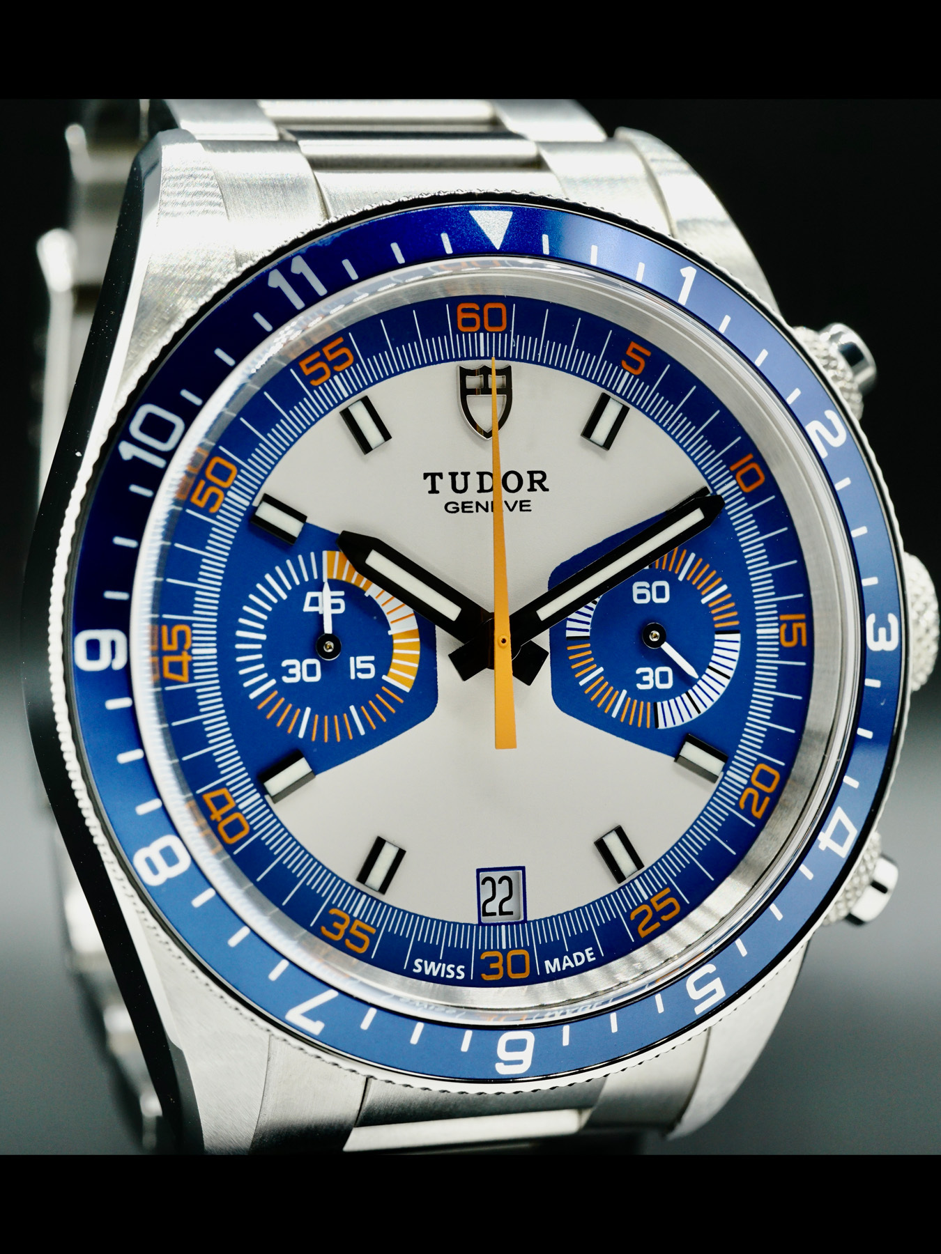 This Tudor Heritage Chrono Blue M70330B-0004 is in EXCELLENT condition. This watch includes its original box, user manual, guarantee booklet, worldwide service booklet, and international guarantee card dated for September 2020. Extra blue/orange fabric strap and stainless steel bracelet links. *Factory sticker on case back.*