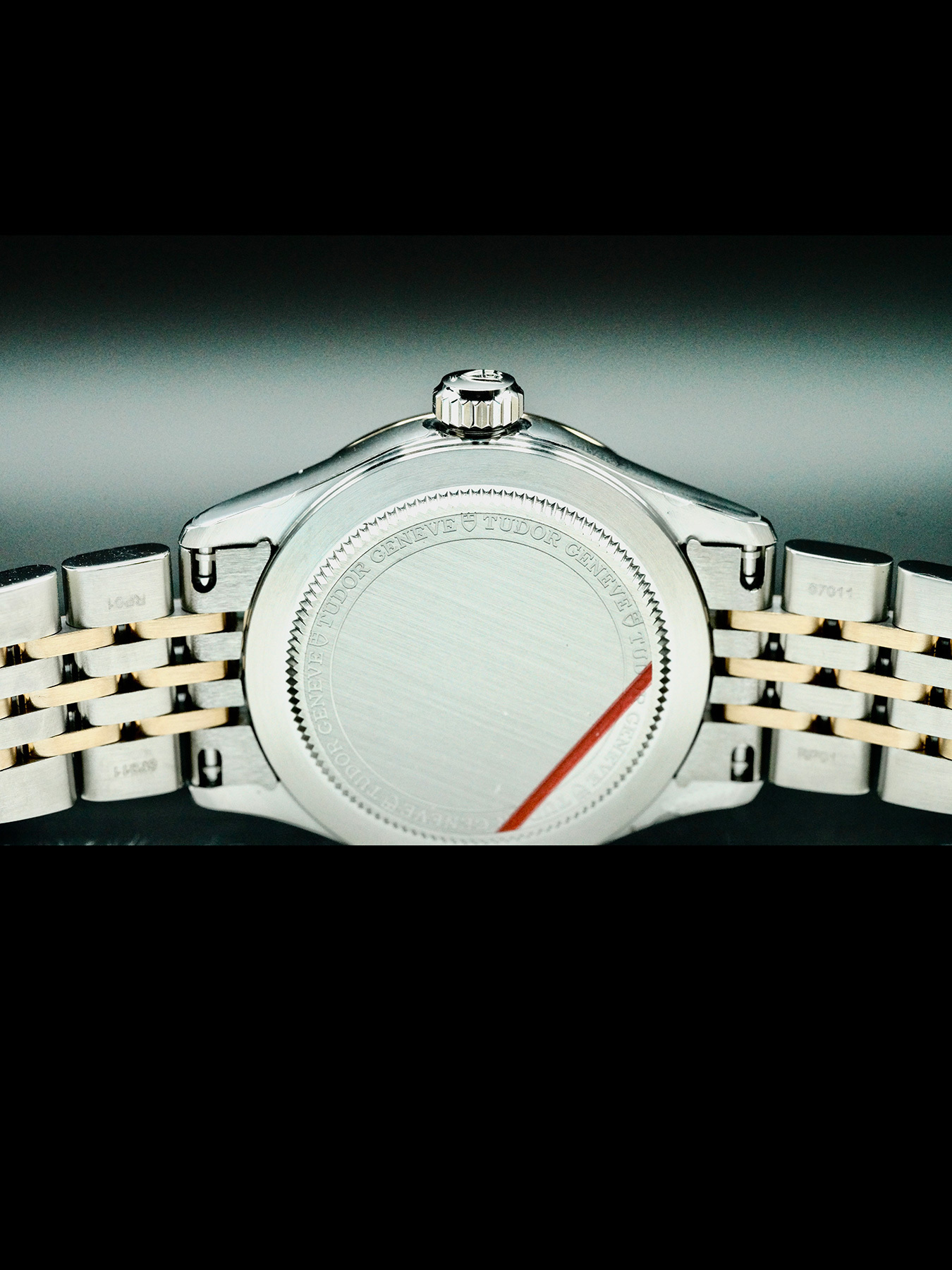 Self-winding mechanical movement powered by Tudor Calibre T201 with a power reserve of approximately 38 hours. Water resistance up to 100 meters.