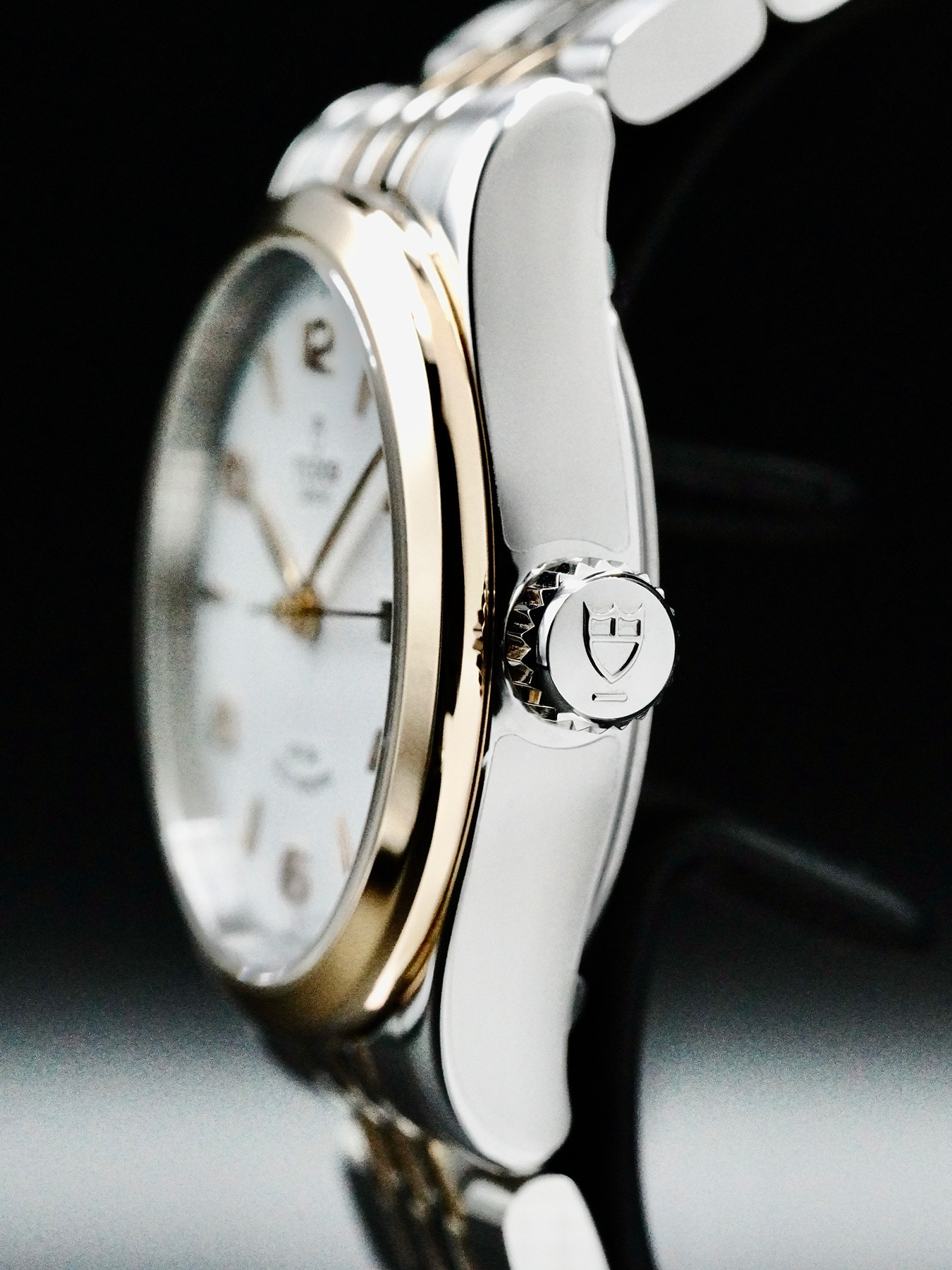 This Tudor 1926 features a 28mm stainless steel case with a rose gold bezel on a stainless steel & rose gold bracelet. This watch also showcases a white dial with rose gold hands and Arabic numeral/index dial markers covered by sapphire crystal.