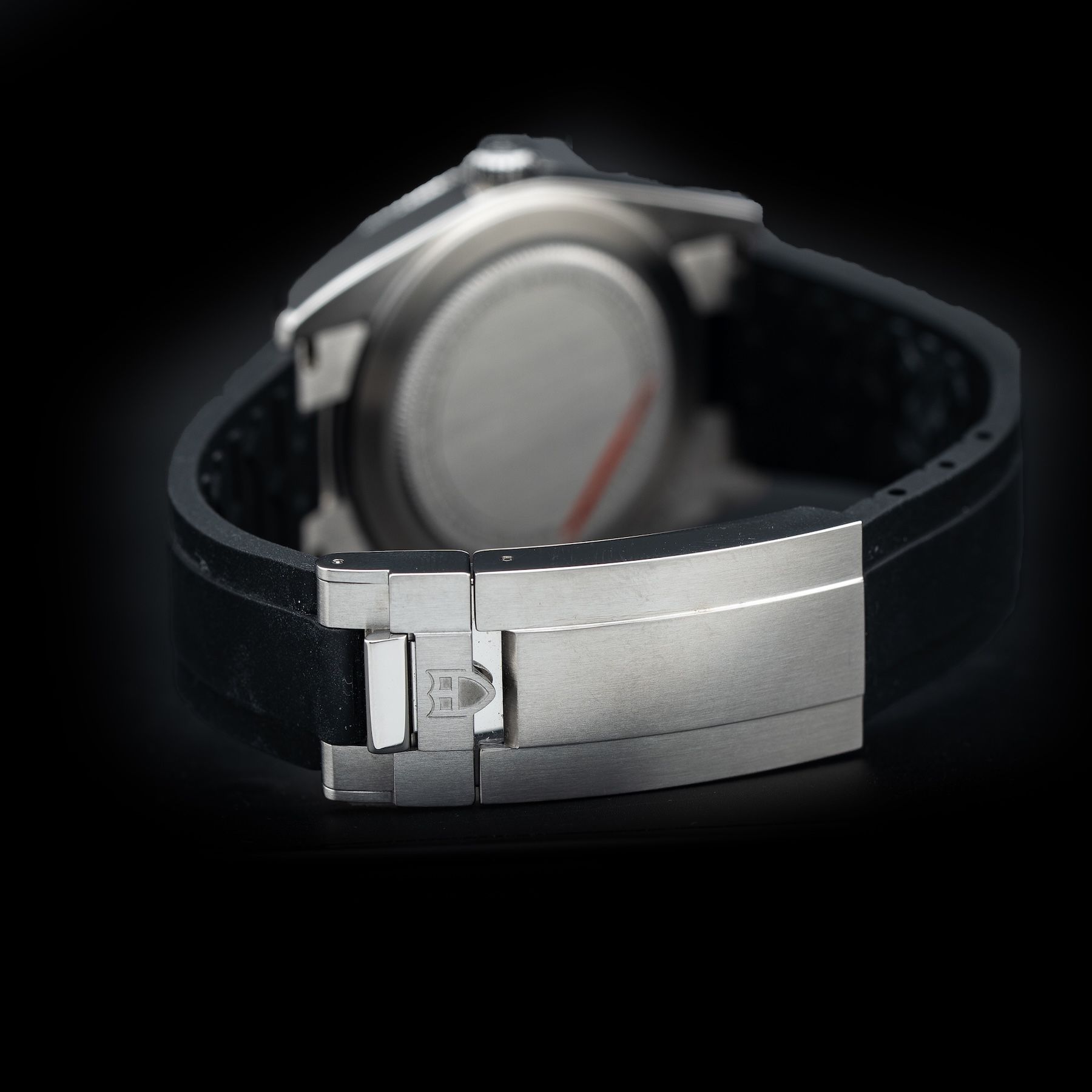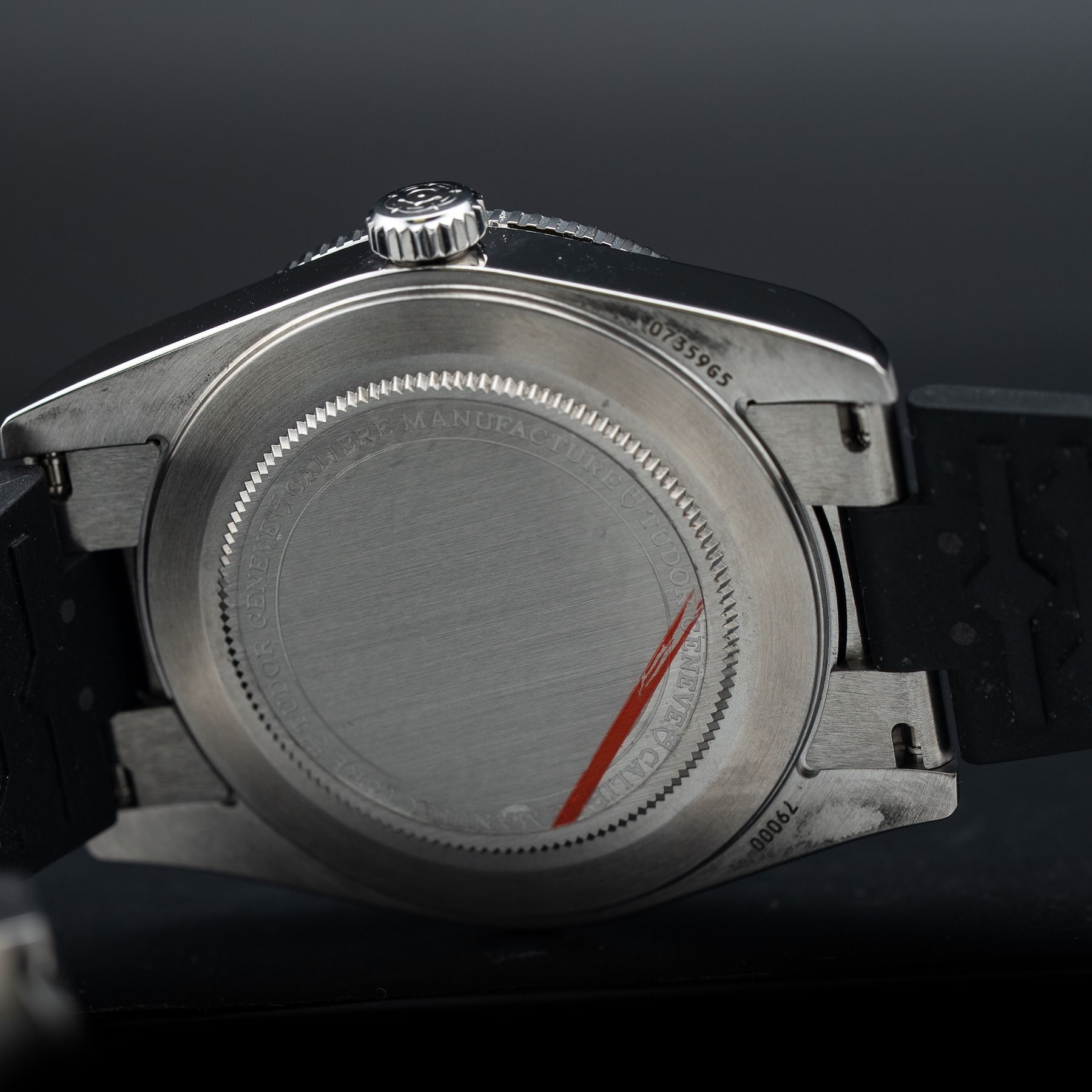 This watch features a 37mm steel case on rubber strap. This watch also sports a black dial. Powered by a self-winding mechanical movement. Water resistance up to 200 meters.