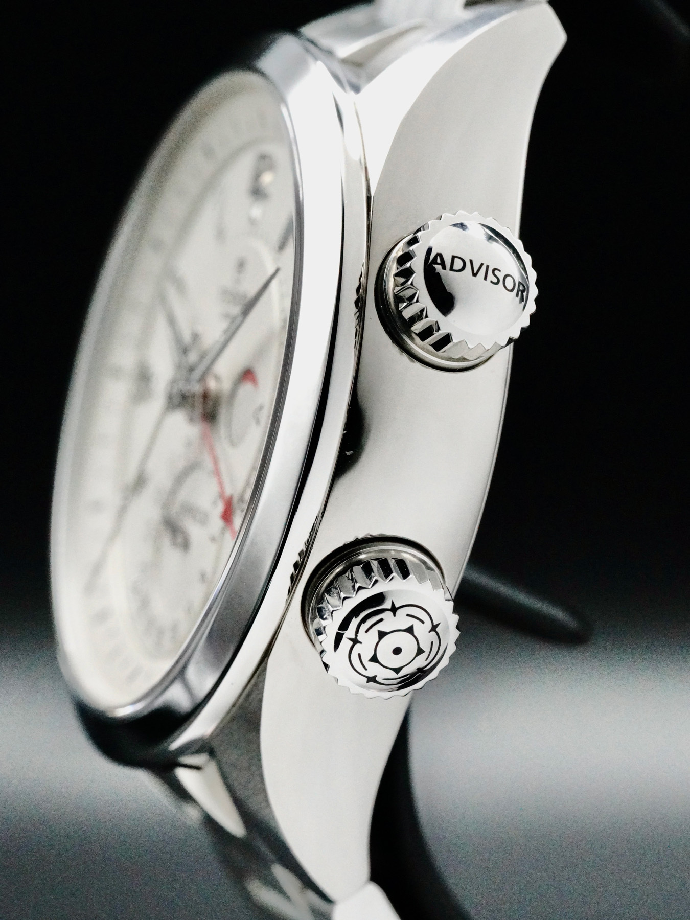 This Tudor Heritage Advisor features a 42mm titanium & stainless steel case with a solid case back on a stainless steel bracelet. This watch also sports a silver dial with luminous silver-tone hands and index dial markers covered by scratch resistant sapphire crystal.