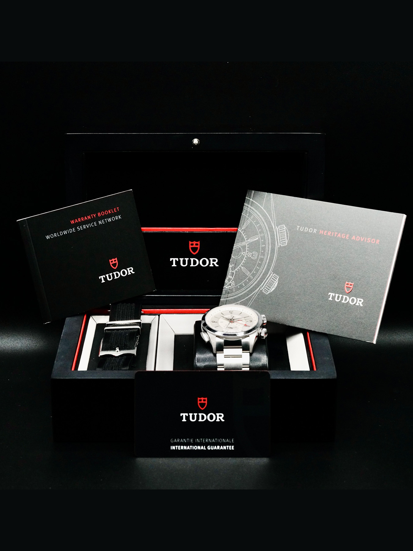 This Tudor Heritage Advisor M79620T is in EXCELLENT condition. This watch includes its original box, instructions, and international guarantee dated for August 2022. Extra black NATO strap. This watch has been fully authenticated and certified by Exquisite Timepieces.