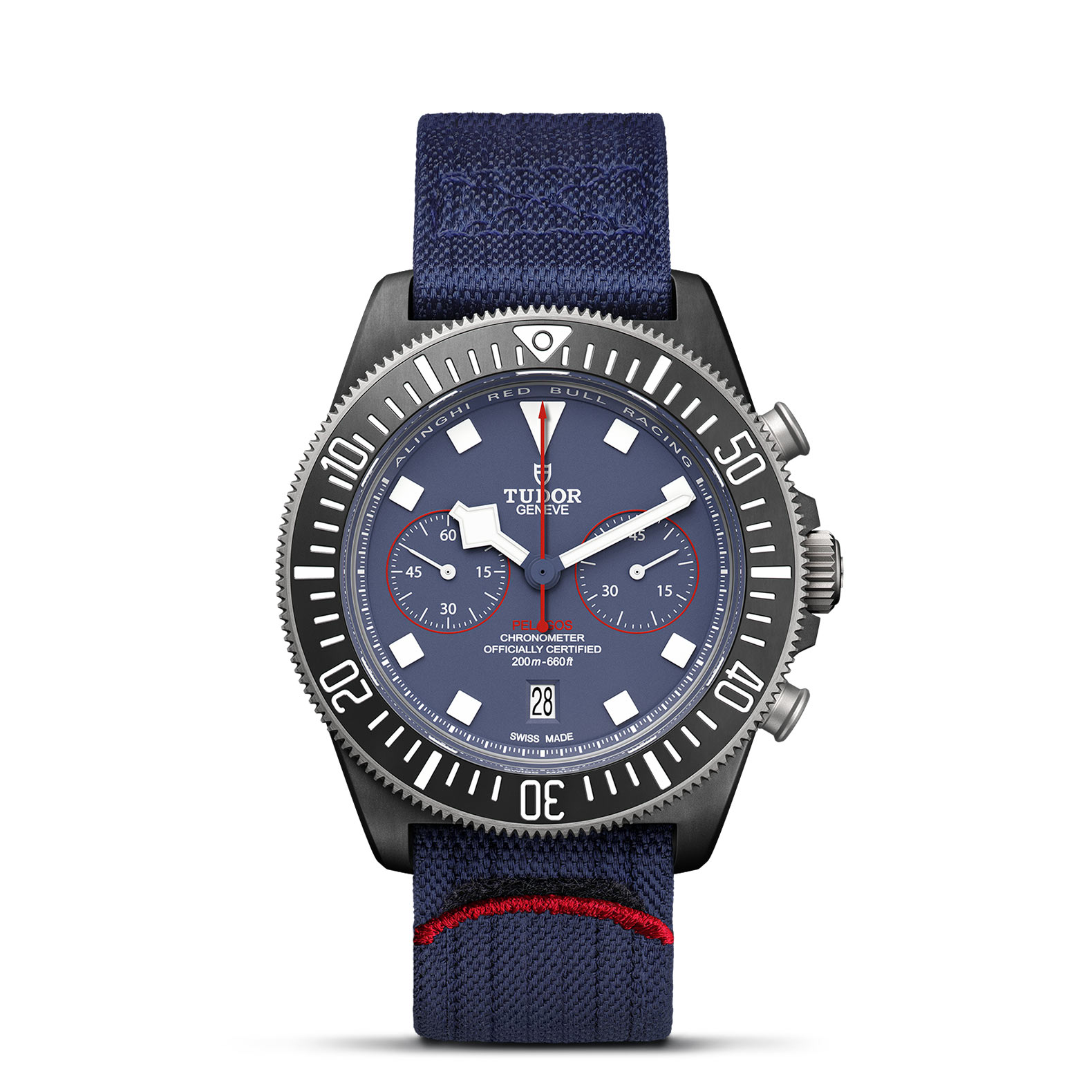 - This timepiece features a 43mm carbon case paired with a high quality fabric strap. It showcases a distinctive blue dial and is powered by a precise automatic winding movement. The watch is designed with a water resistance of up to 200m.