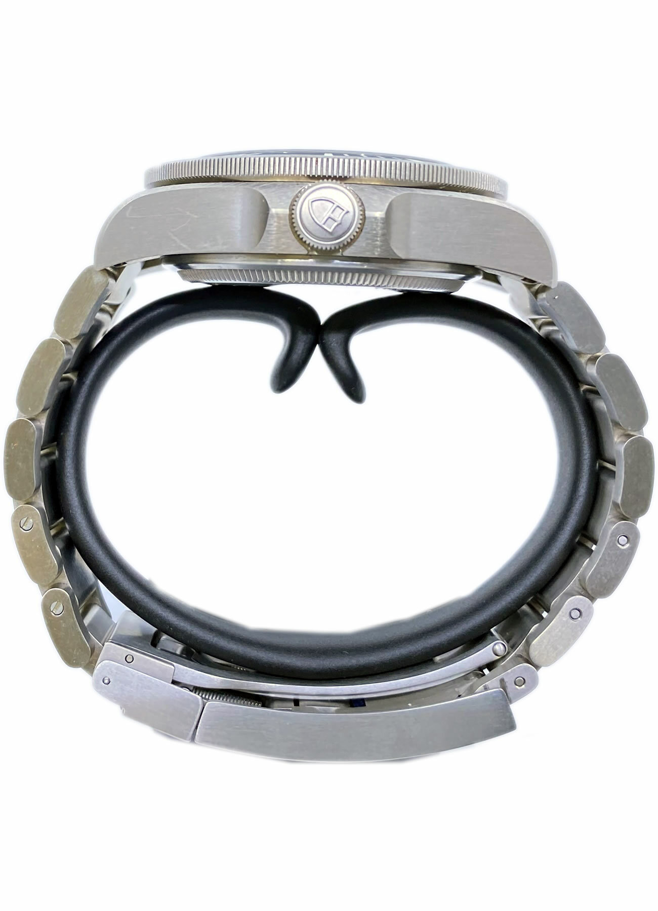 - This timepiece features a 42mm titanium case paired with a high quality titanium bracelet. It showcases a distinctive black dial and is powered by a precise automatic winding movement. The watch is designed with a water resistance of up to 500m.