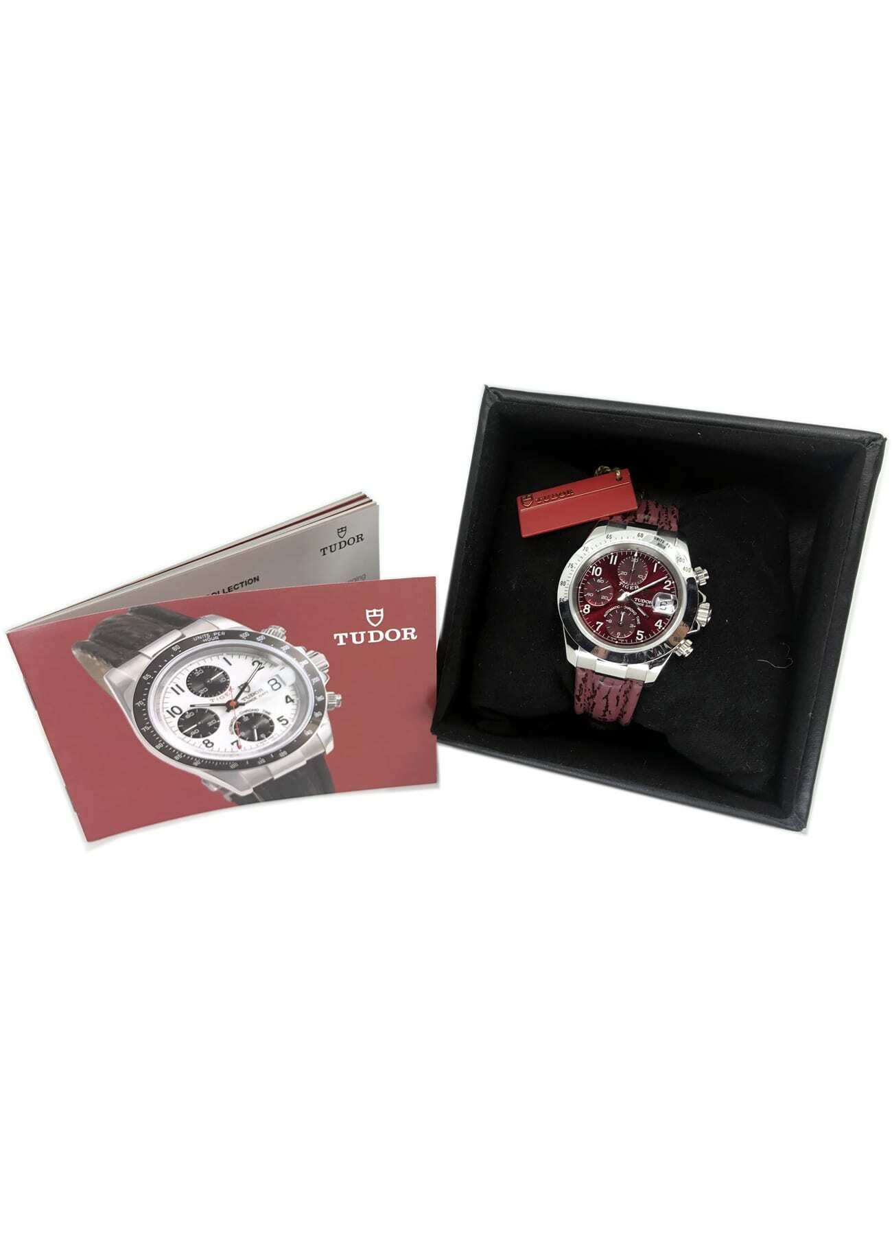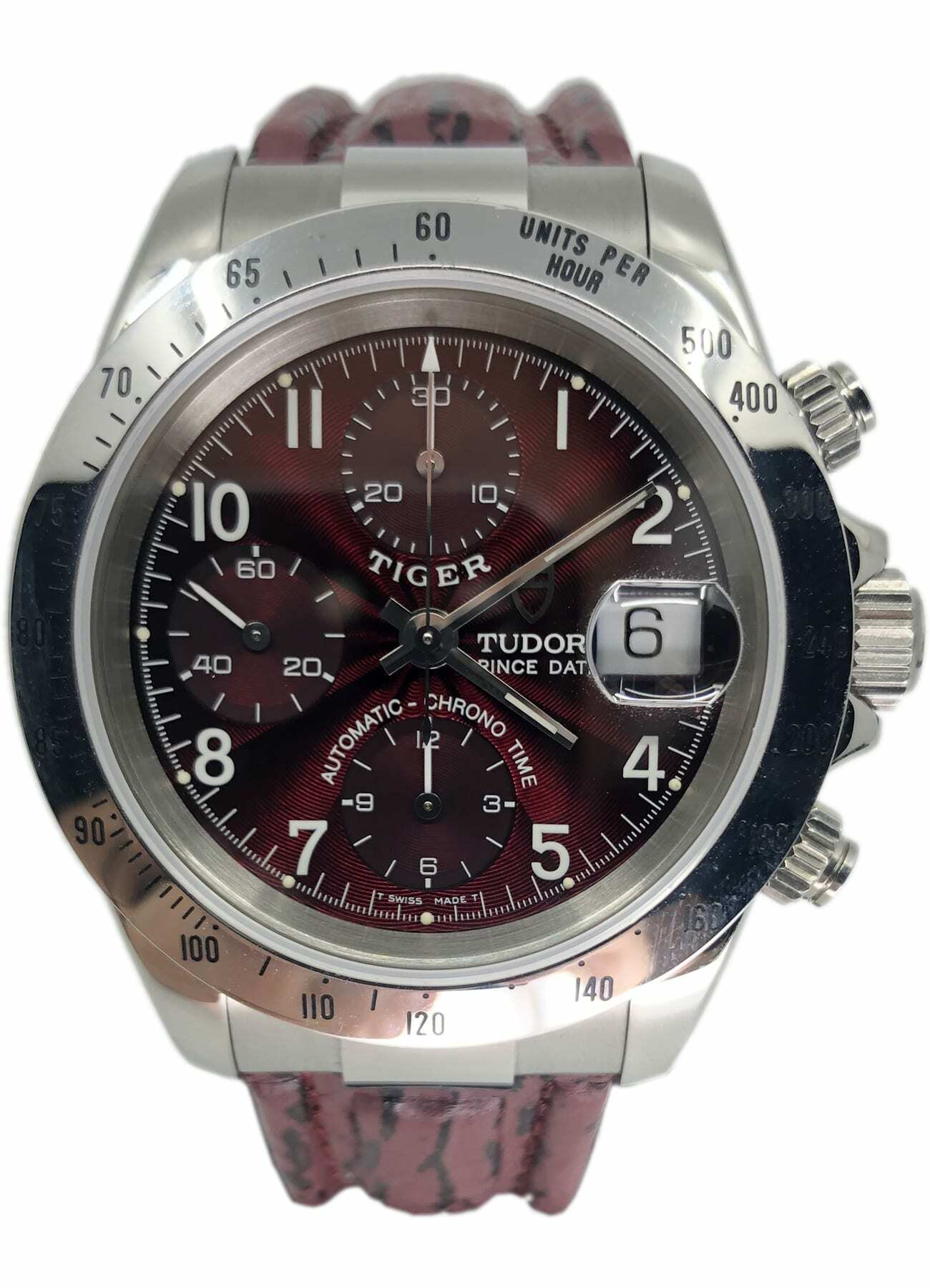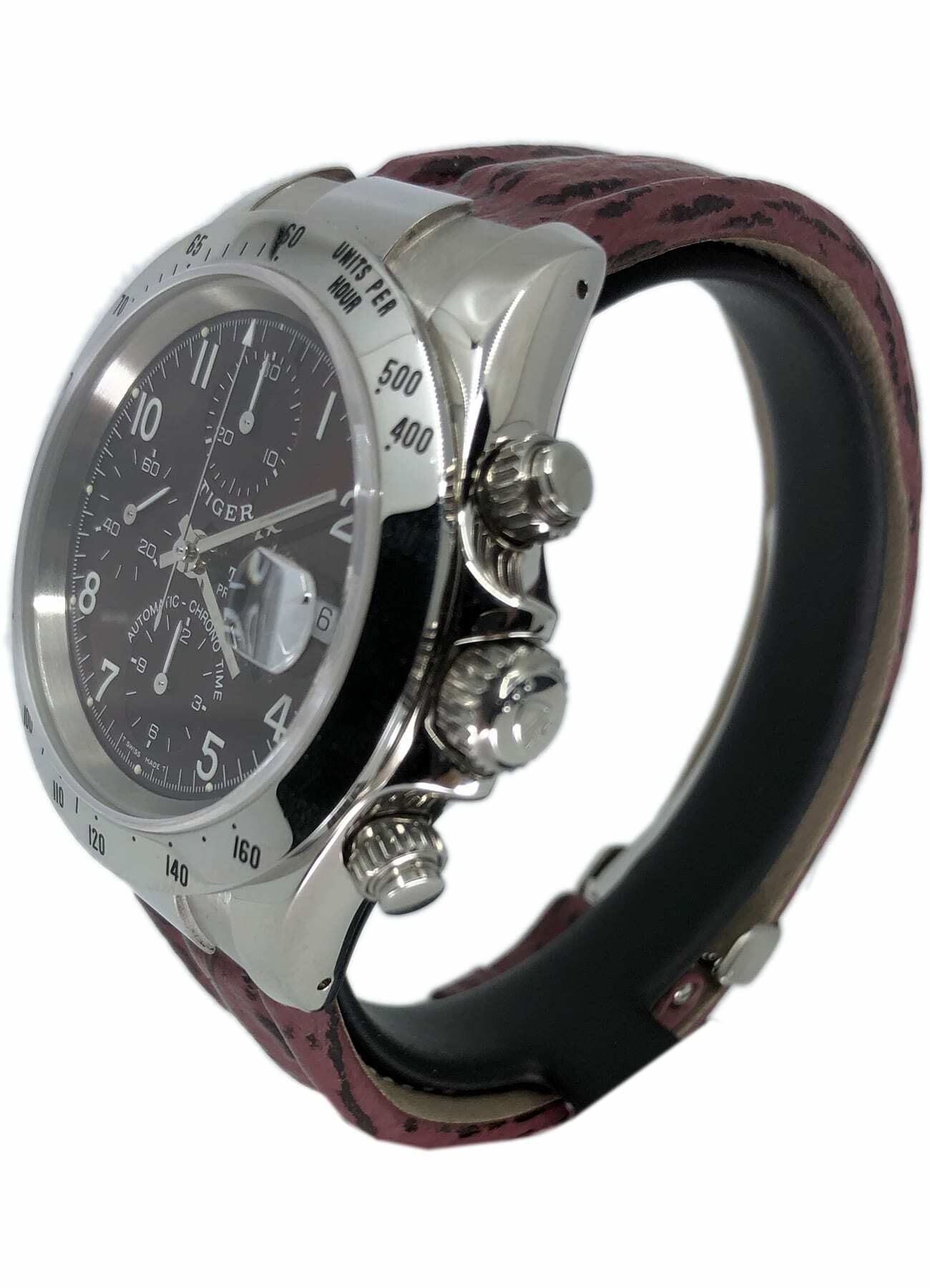 - This timepiece features a 40mm steel case paired with a high quality leather strap. It showcases a distinctive bordeaux dial and is powered by a precise automatic winding movement. The watch is designed with a water resistance of up to 100m.