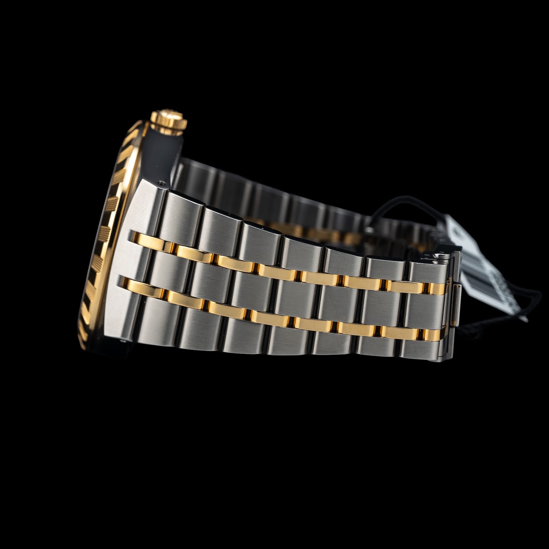 This watch features a 41mm steel case on steel with yellow gold cap bracelet. This watch also sports a silver dial. Powered by a self-winding movement. Water resistance up to 100 meters.