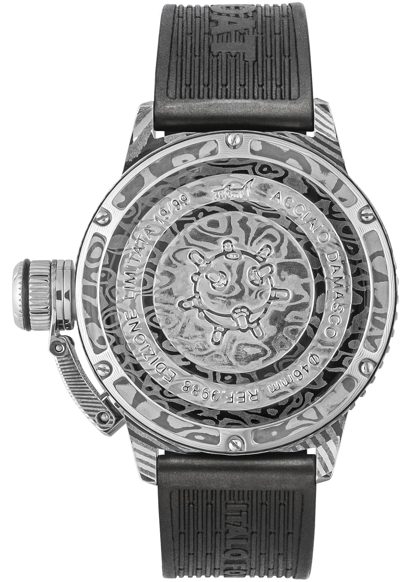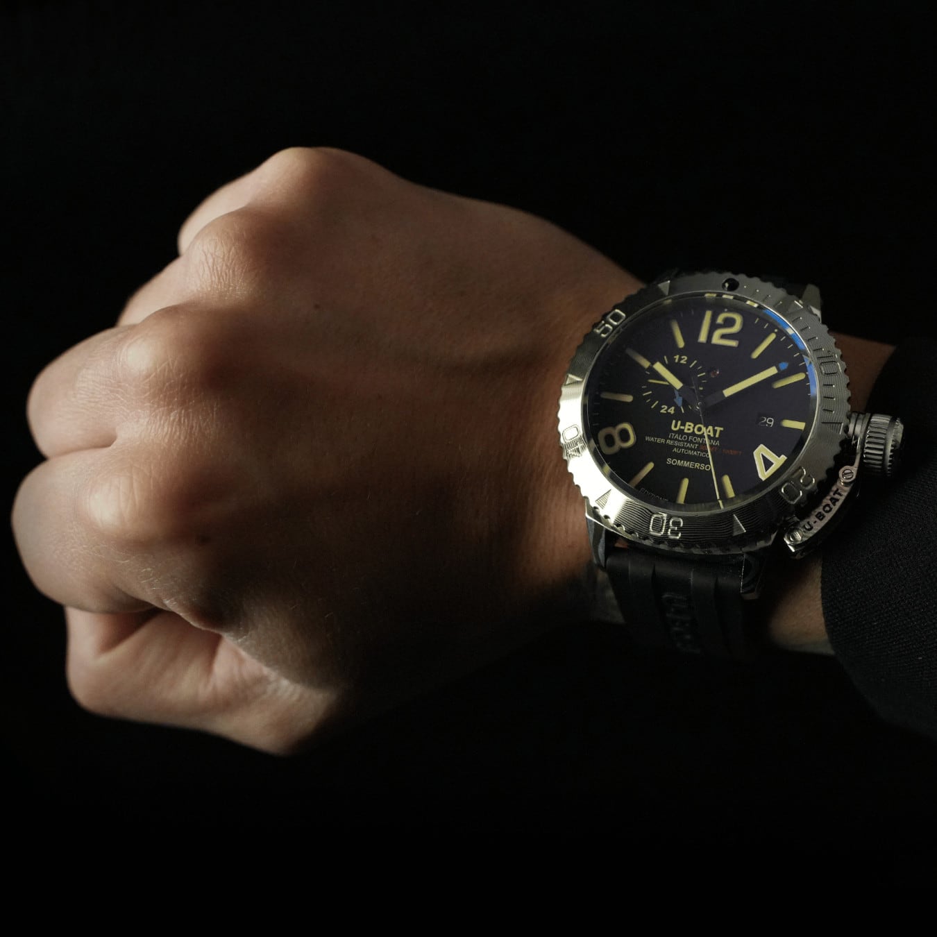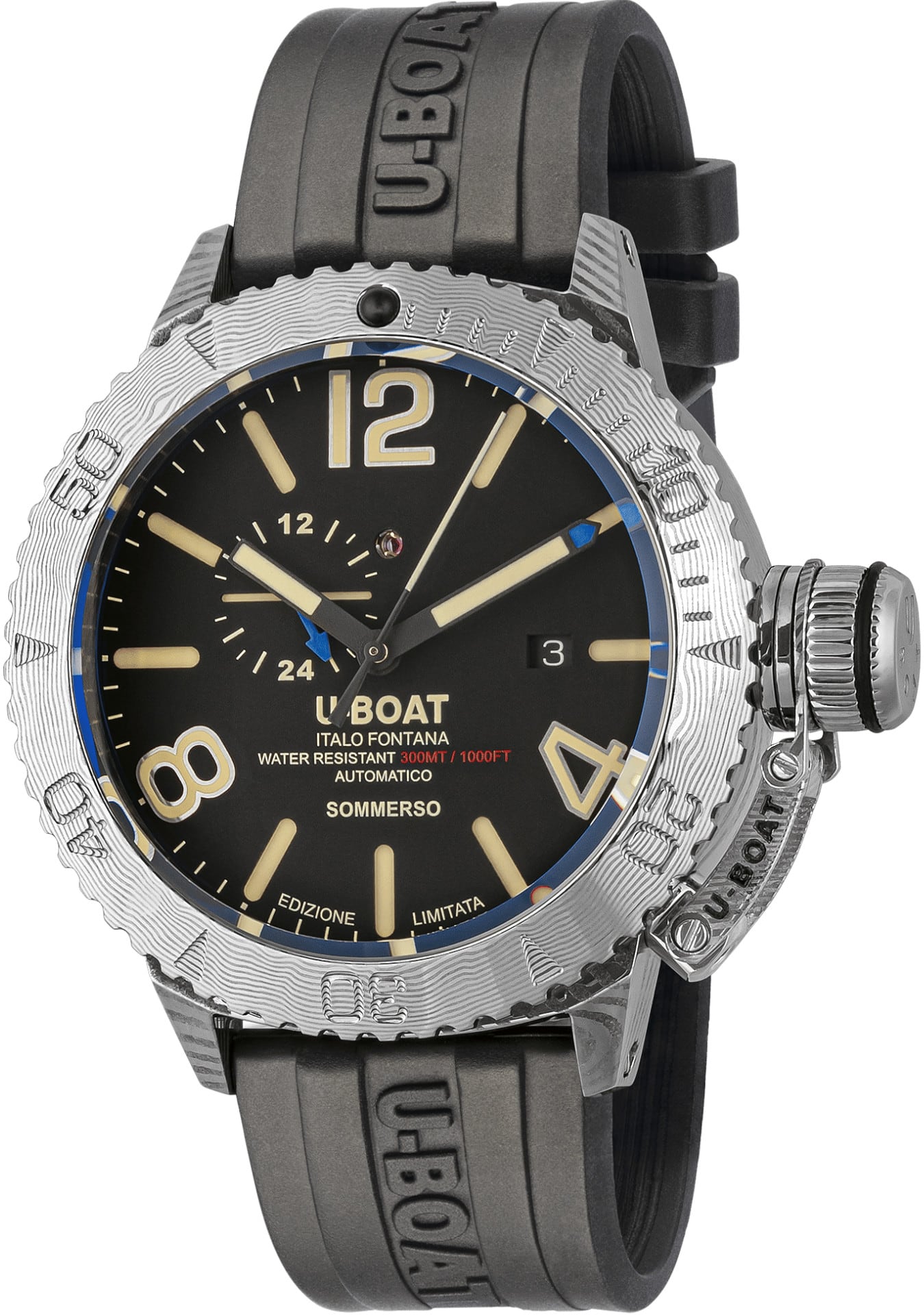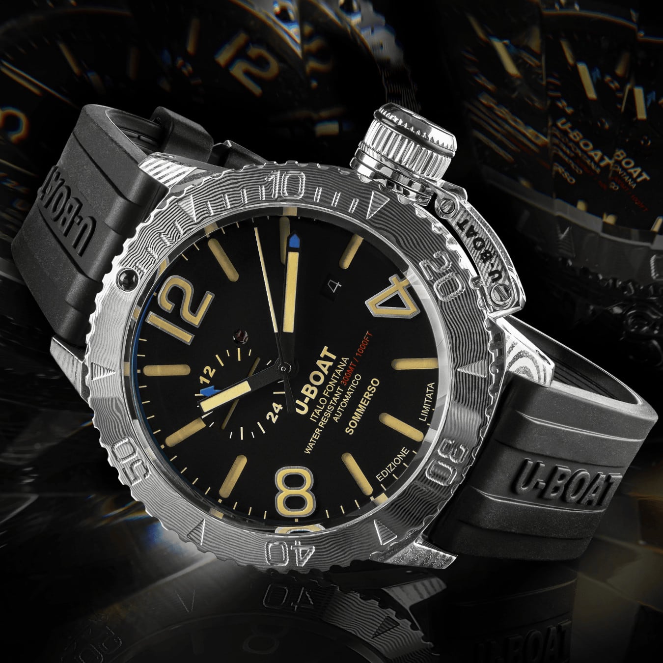 The new U-BOAT Sommerso stands out for its exclusivity, with only 99 pieces available, and its innovative Damascus steel case. A historic turning point for the brand is the placement of the crown on the right side, a bold change from U-BOAT’s tradition of always placing the crown on the left side.