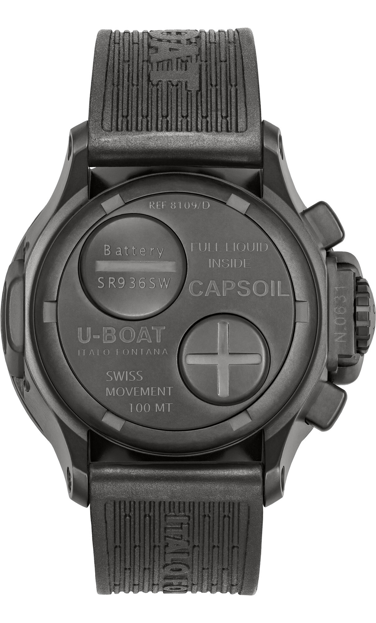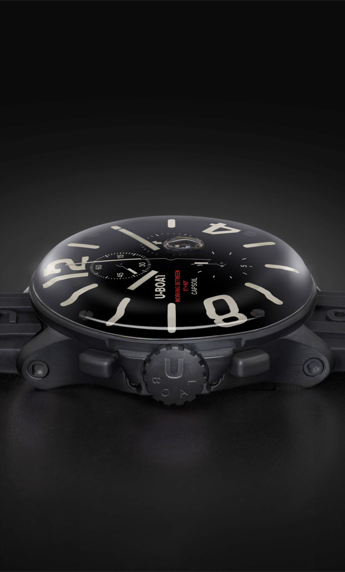 45 mm case with black DLC treatment, CAPSOIL features an electromechanics, with Chrono functions, completely immersed in an oil bath. The oily liquid, surrounding the dial, transforms it into an absolute black, making it three-dimensional and deep. This fluid creates on the dial an ever-moving compensation bubble. This new version features an innovative locking system (Locking ring system) with quick battery replacement.