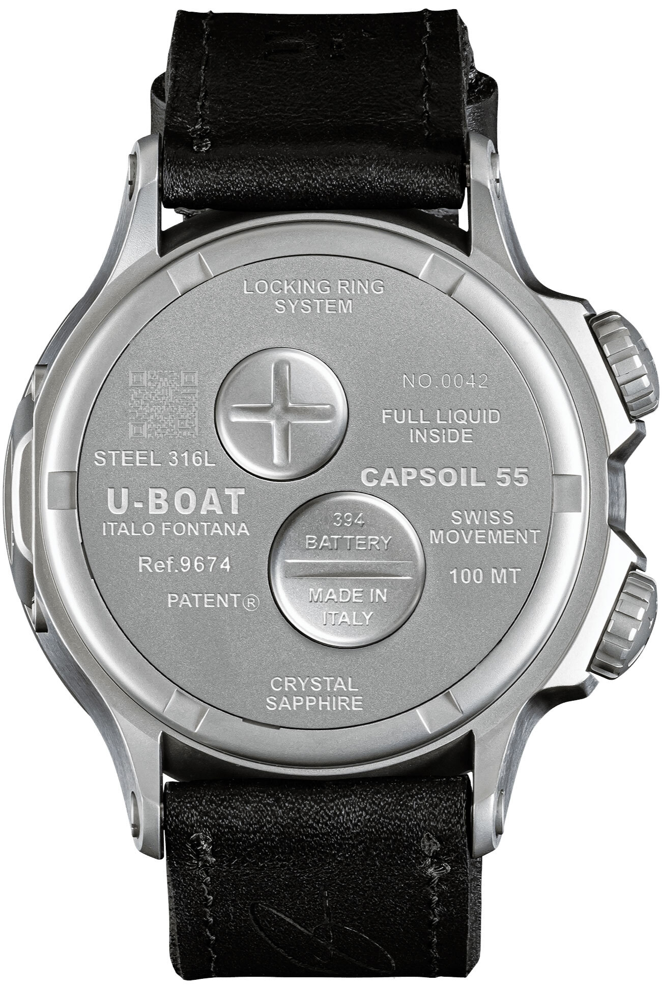 Stainless steel, completely filled with a special oil that emphasizes the dial, creating the illusion of the absence of glass, and an optical effect of a more intense black and higher legibility