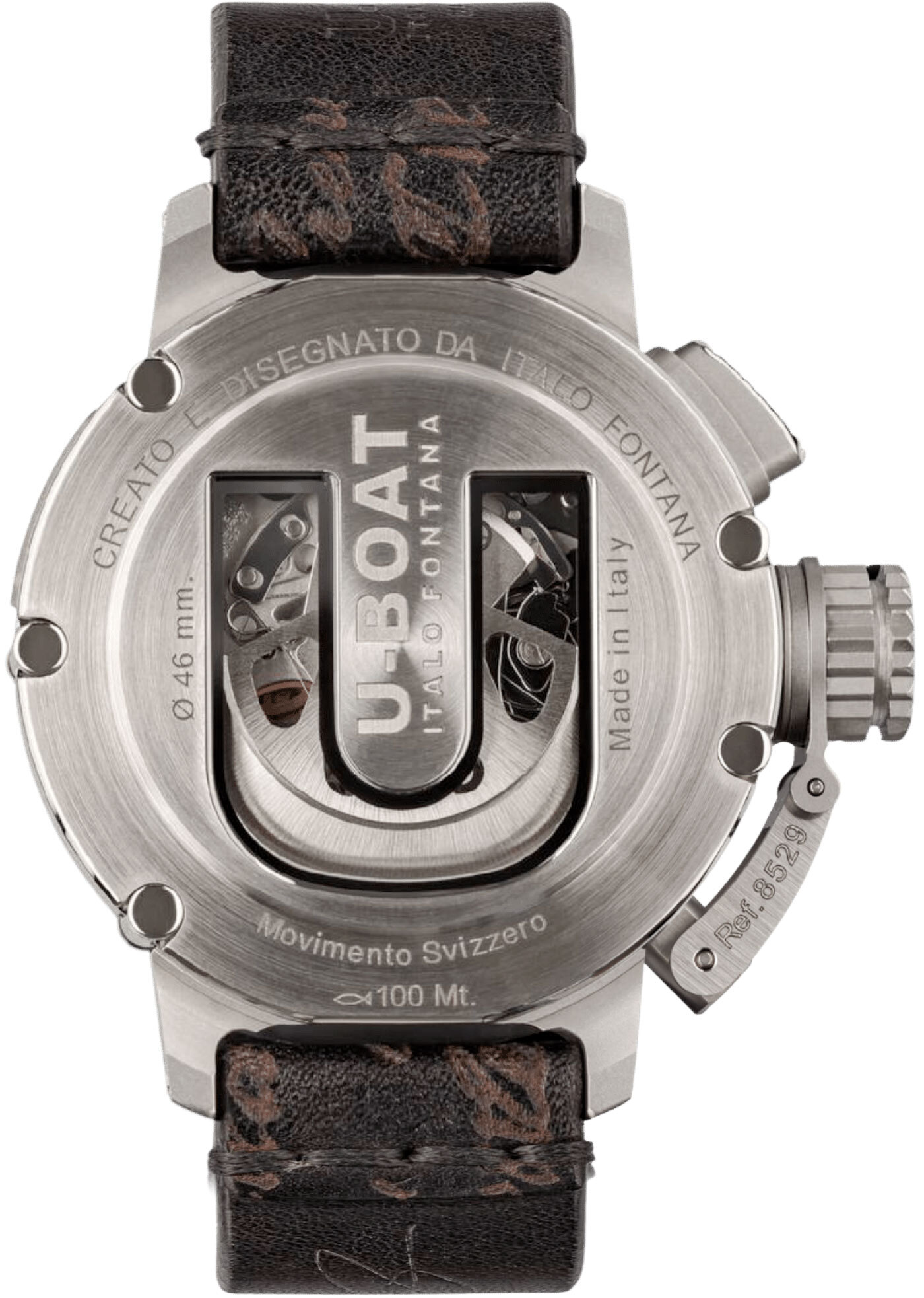 Swiss automatic mechanical processed and modified according to U-BOAT specifics. Custom skeletonized rotor. 28,800 BpH (4 Hz) frequency. 41 hours power reserve. 26 jewels (rubies)
