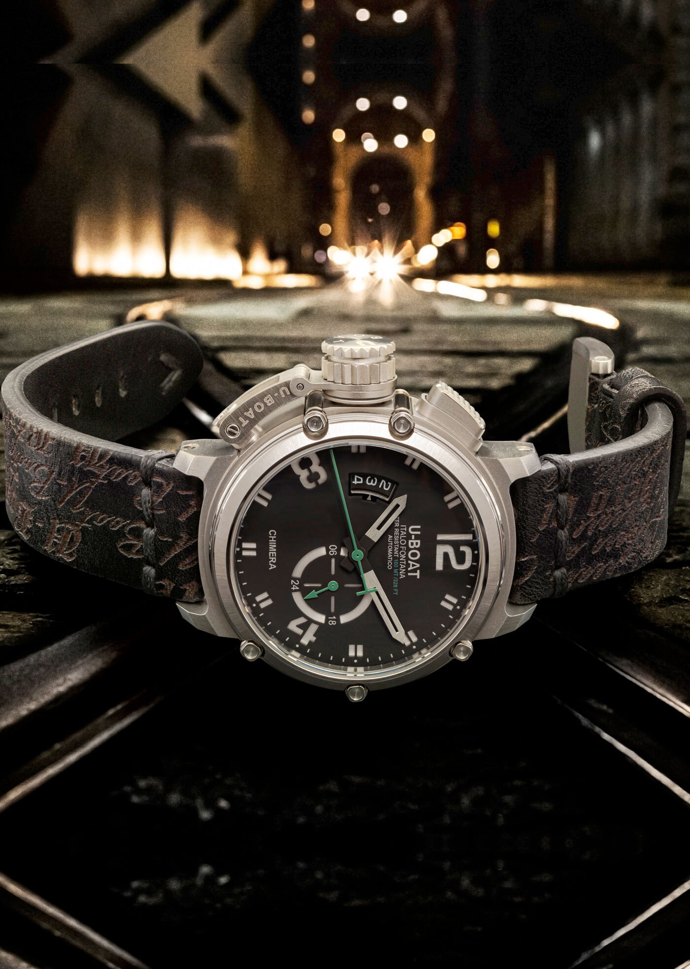 Check your time through a Chimera! Limited-edition watch of 500 pieces, with a 46mm stainless steel case and a laser-cut dial featuring green hands for seconds and a 24-hour counter.