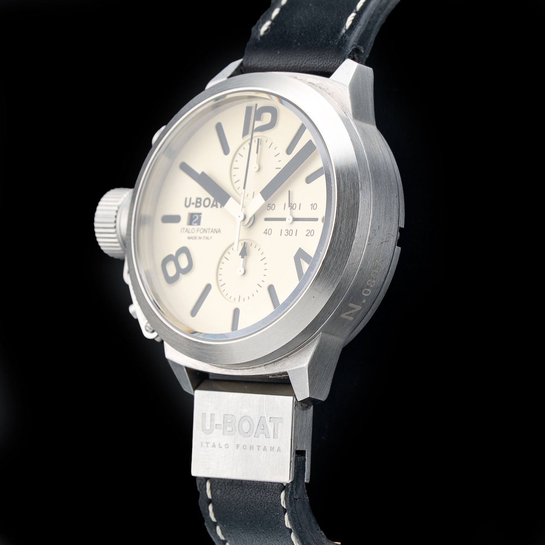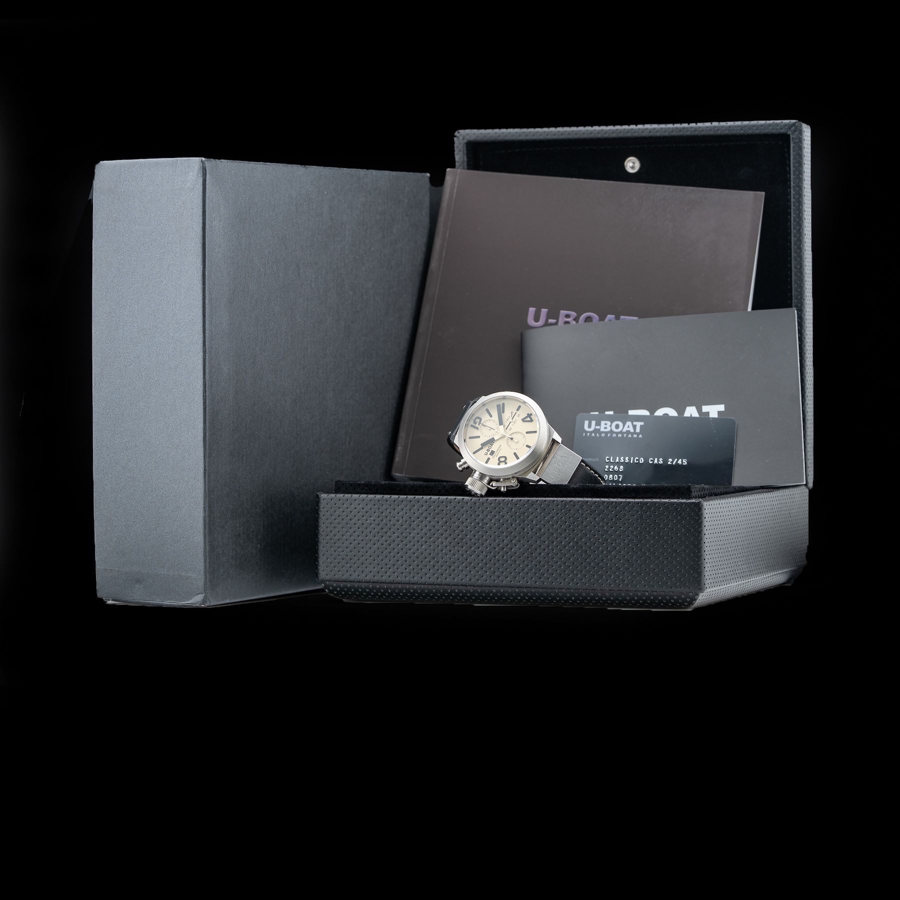 This U-Boat Classico Cas 2/45 2268 Beige Dial 45mm is in GREAT condition, it has box, papers and warranty card not dated. This watch has been fully authenticated and certified by Exquisite Timepieces. Please note, the photos shown are of the actual watch you will receive.