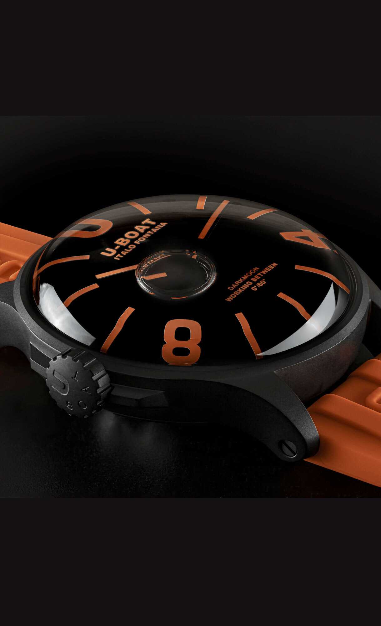 44mm size with a new domed dial, under the domed sapphire glass, further emphasizing the 3D effect. Electromechanical movement completely immersed in an oil bath. Black PVD-treated steel case, black dial and numerals, indexes and hands treated in orange superluminova.