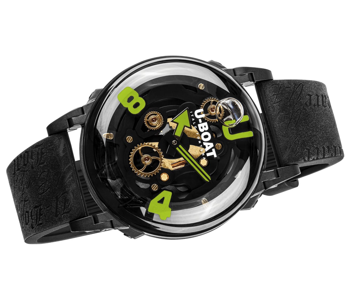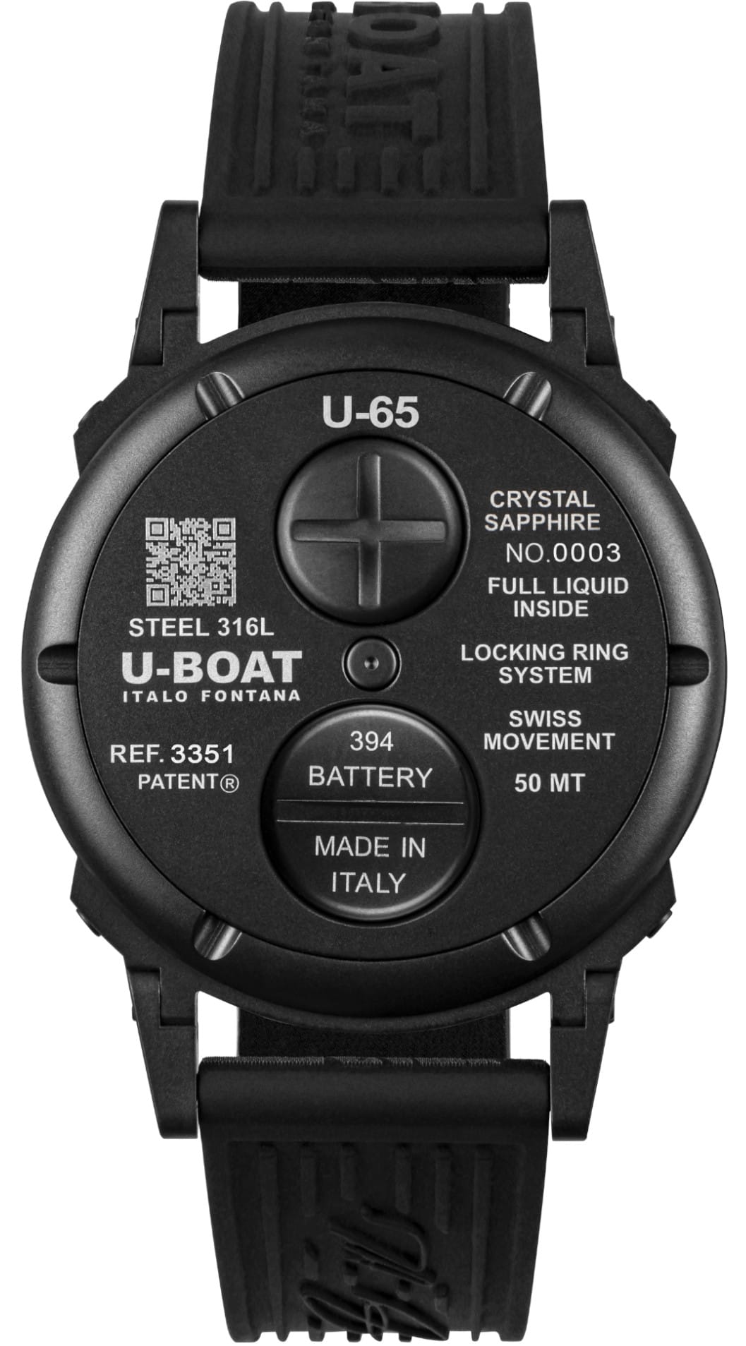 Made from AISI 316L steel with a black PVD treatment, the case is fully filled with a special oil that enhances the dial, creating the illusion of the absence of glass, with a more intense color effect and better readability. A visible air bubble on the dial compensates for temperature changes. Movable lugs. Diameter: 44 mm.