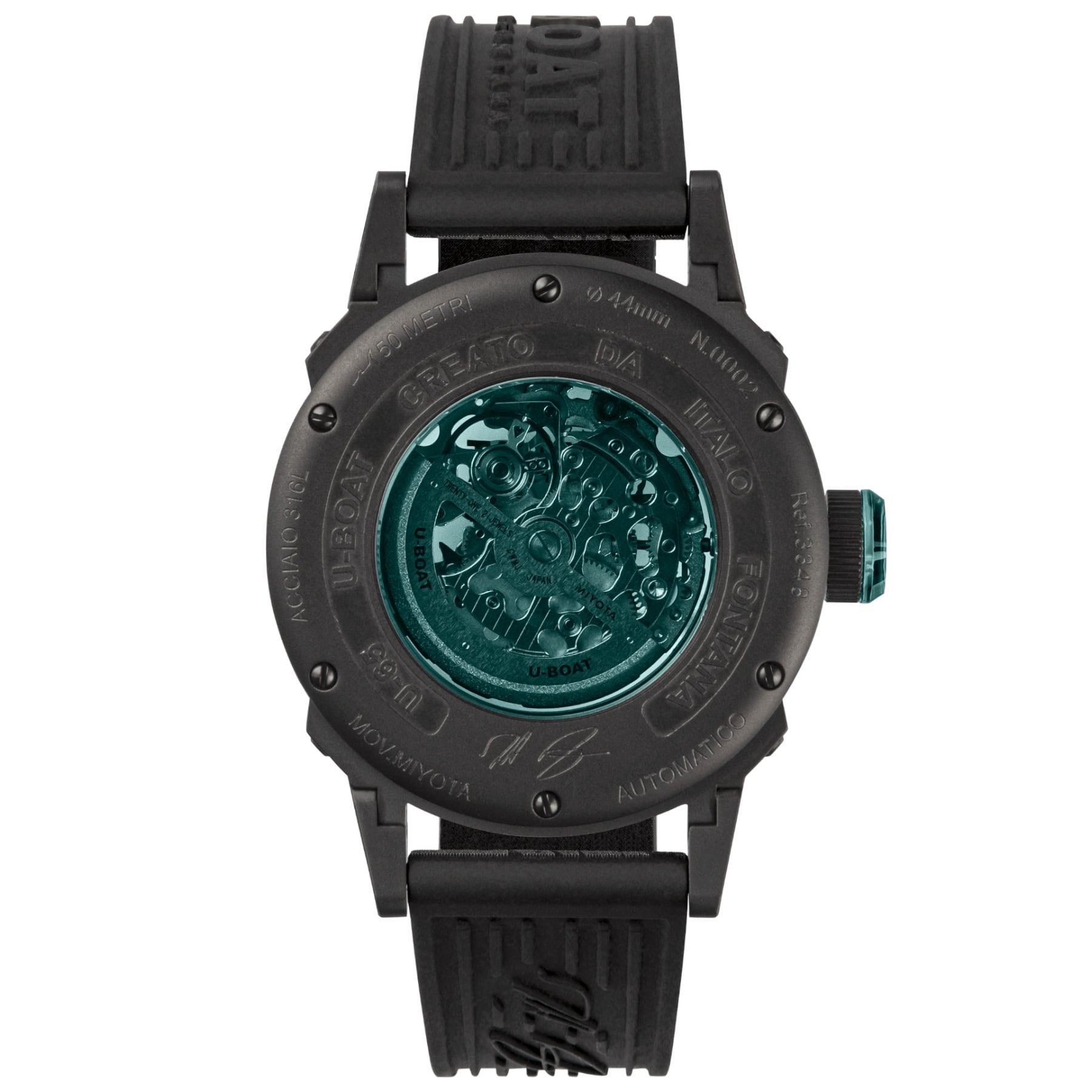 - This timepiece features a 44mm steel case paired with a high quality rubber strap. It showcases a distinctive black dial and is powered by a precise automatic winding movement. The watch is designed with a water resistance of up to 50m.