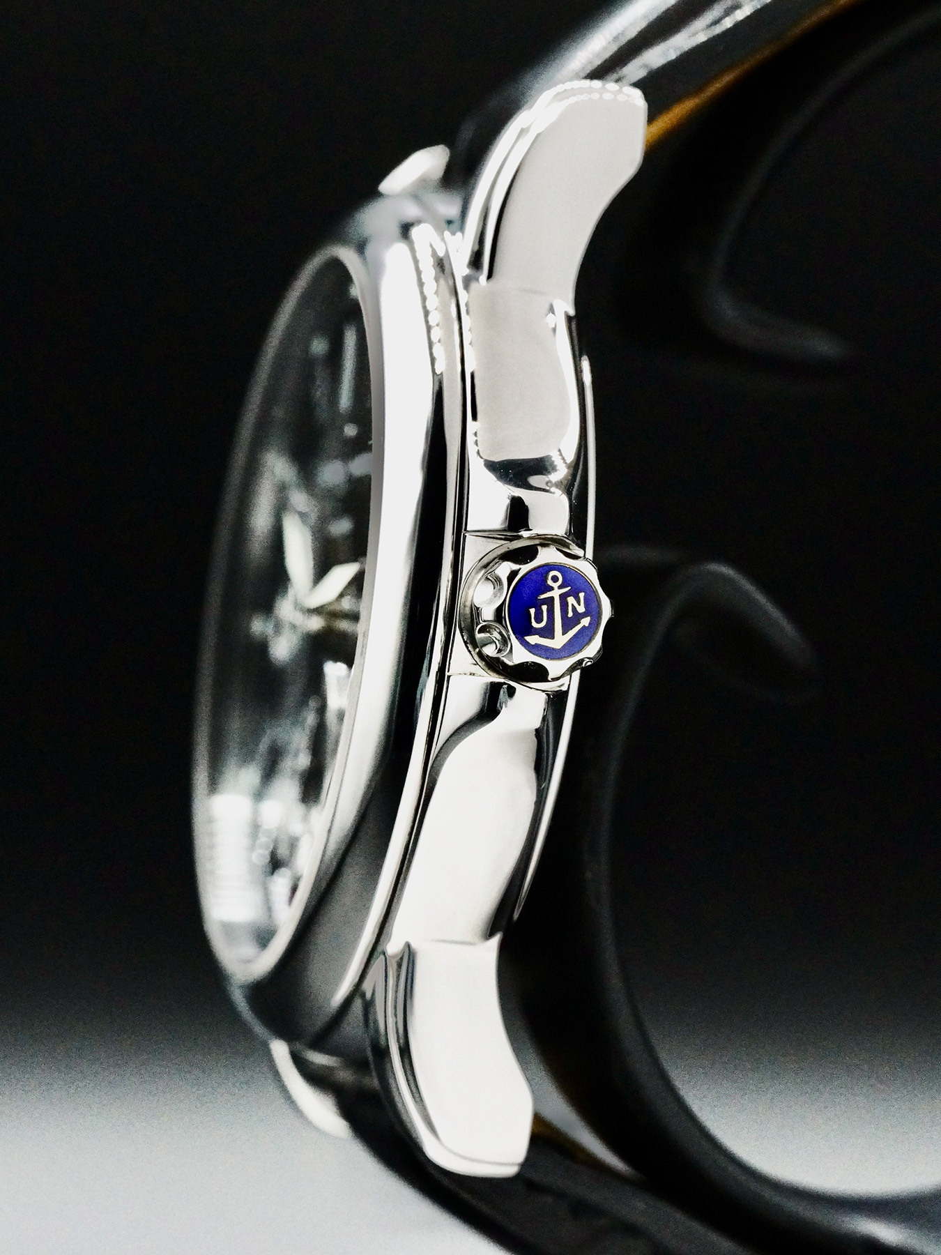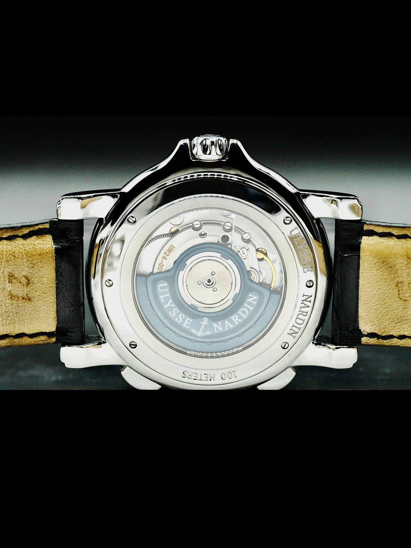 Automatic movement powered by Ulysse Nardin Calibre UN-24 with a power reserve of approximately 42 hours. Water resistance up to 100 meters.